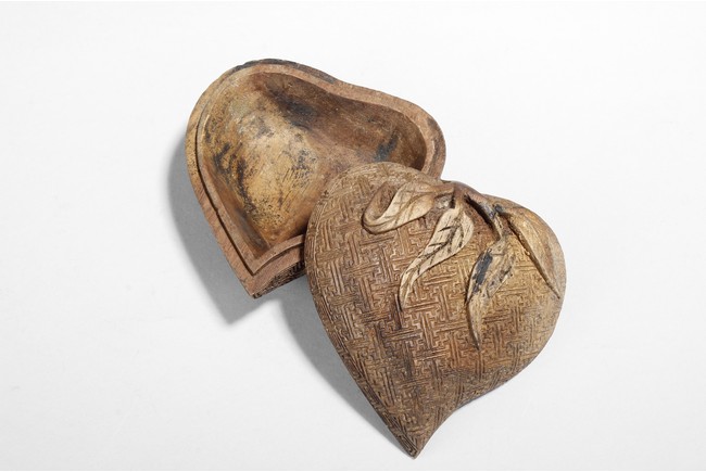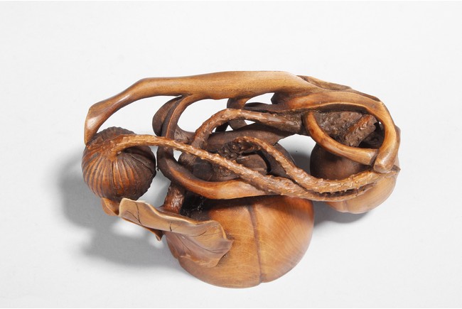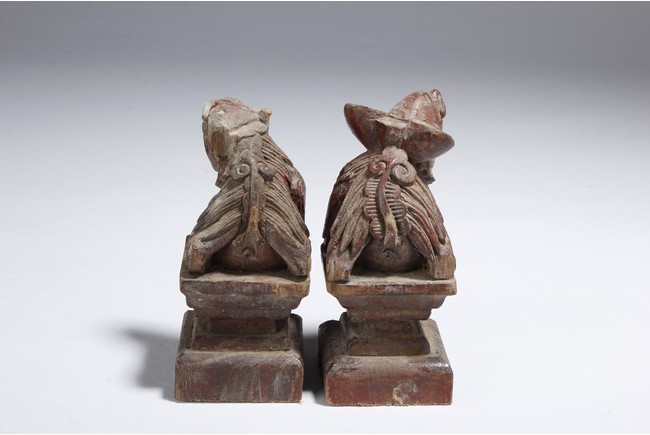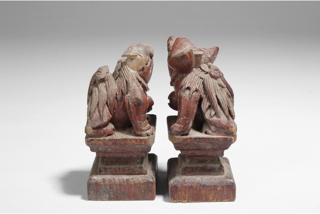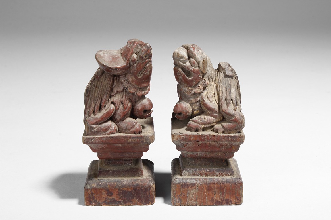 A group of small wood carvings, including a pair of lion statues, a wooden mask, a peach shaped cover box, and a lotus flower carving.