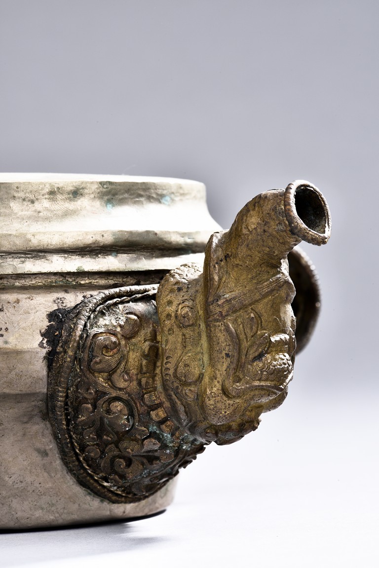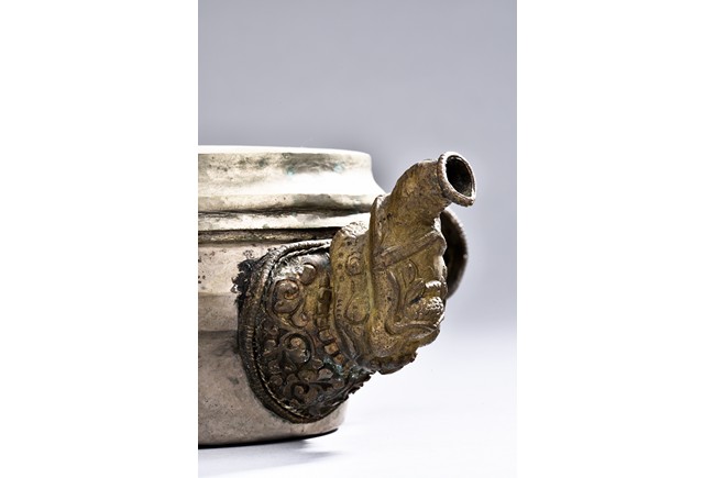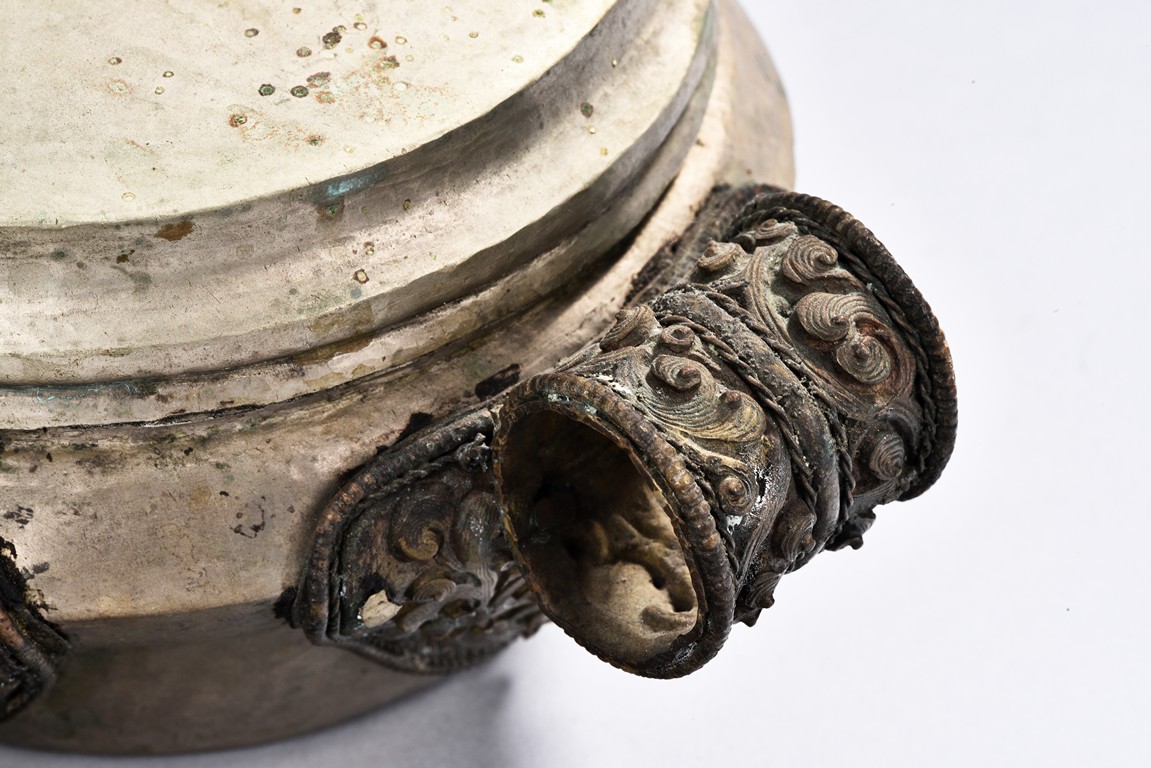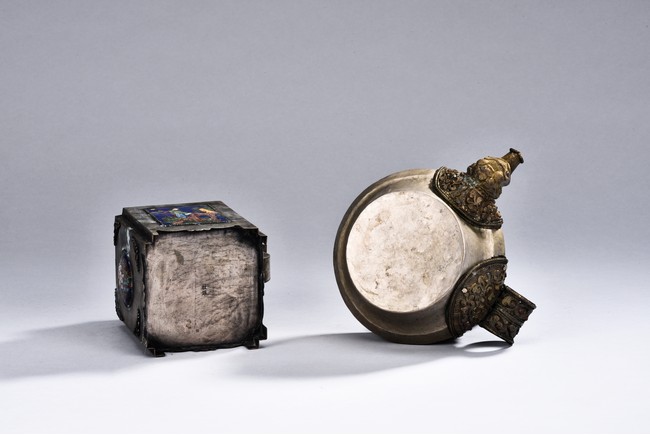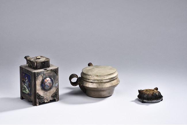 Including an pewter or silver ewer of rectangular section, the body decorated with scenes of beauty and shoulao in cloisonne enamel, the bottom etched with two character 'Wen Yin'; and a circular shaped pewter or silver bowl inset with bangle, the bottom with a silver mark; and a silver or silver-like ewer with a circular cover, the loop handle and spout with decoration in relief.