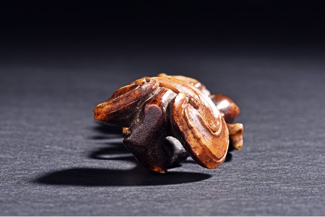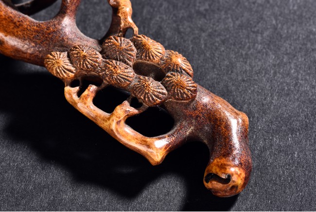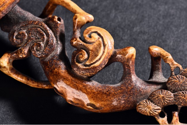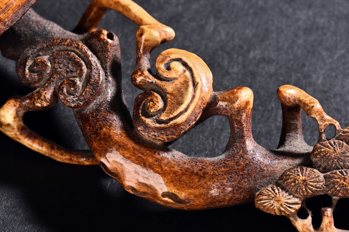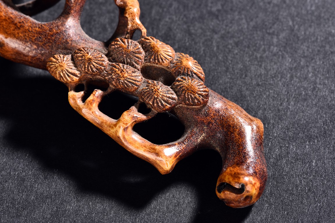 Of twisting and gnarled form, the head carved as lingzhi head and body with pine leaves.