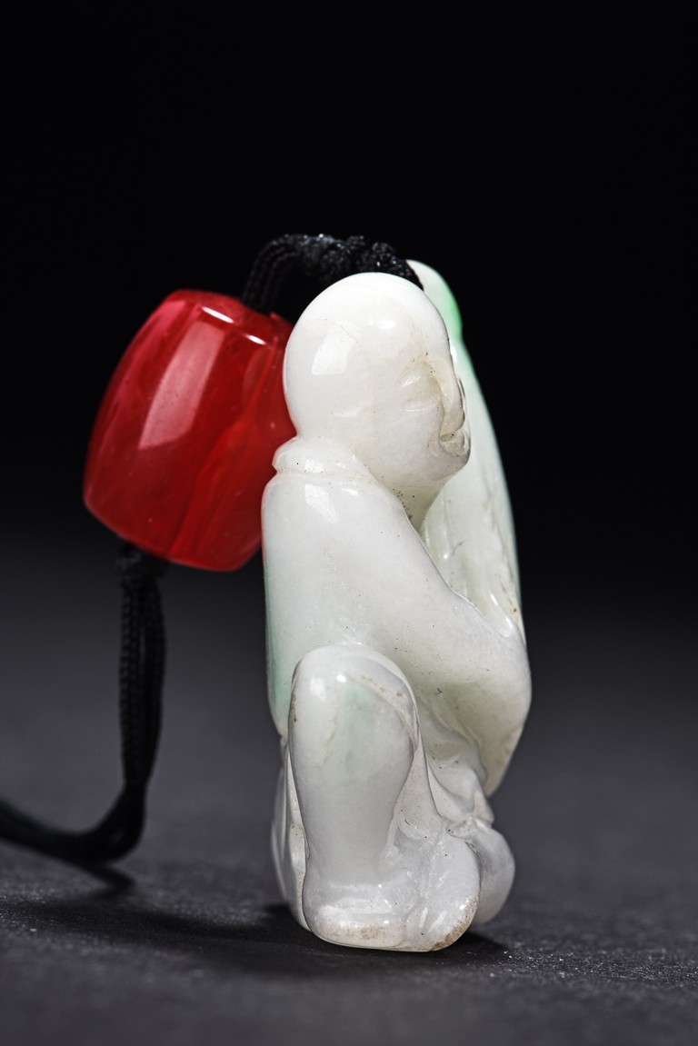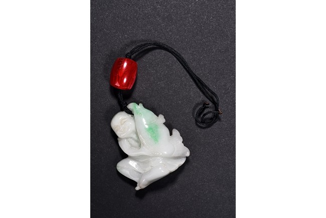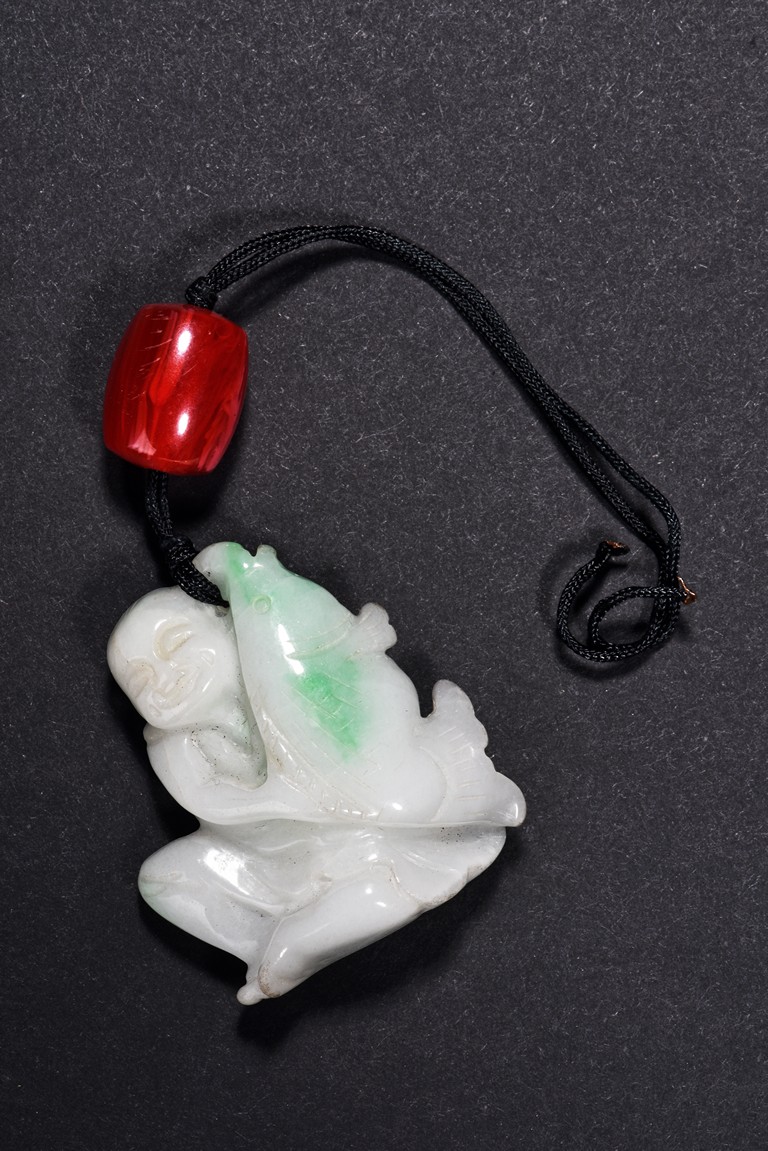A JADEITE PENDANT OF BOY AND FISH 翡翠童子抱魚掛墜