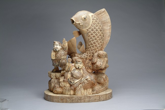 A large fish in the background, splashing out of ocean waves; two elaborately dressed men in the front, situated on rocks; one man is missing two hands, fish is missing a fish fin. 19th Century.