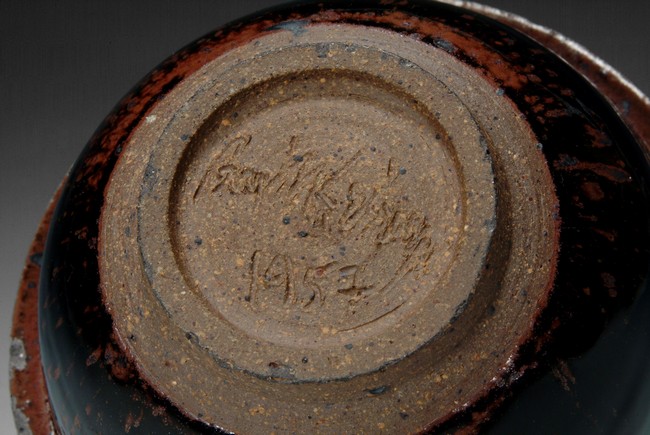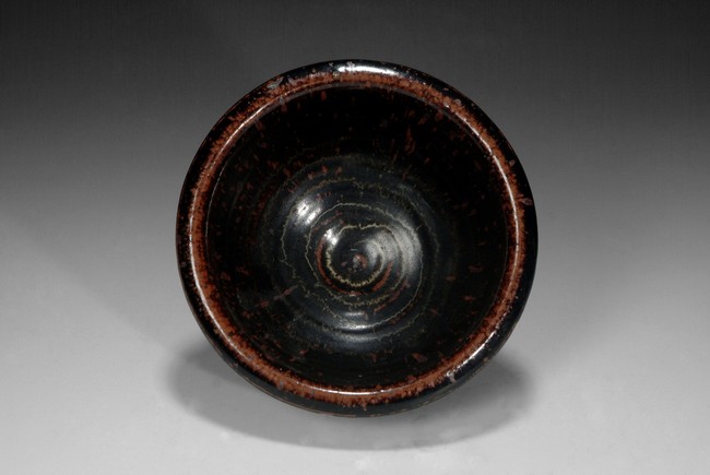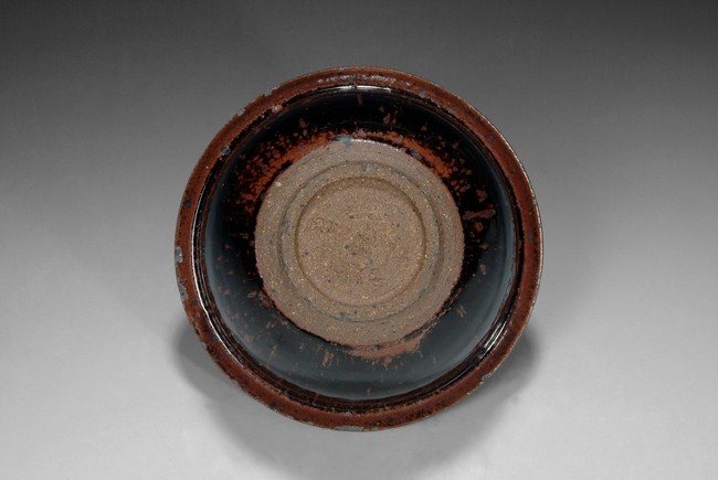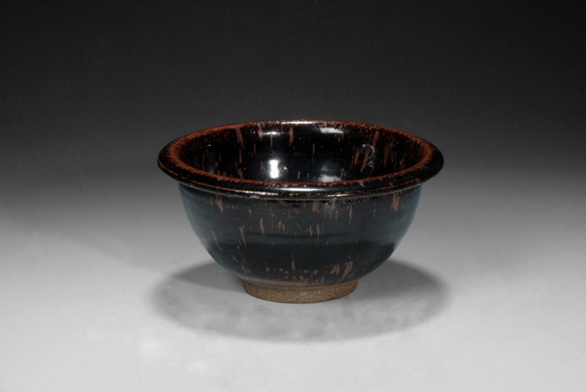 Of flared form on a short foot , the sides of the bowl rise to rim with russet fur markings on body. The foot is unglazed.