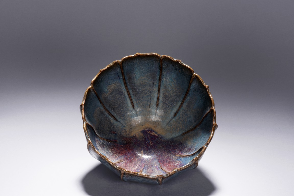 Of chrysanthemum form, the interior and exterior with flambe blue glaze with purple patches.