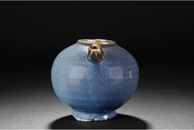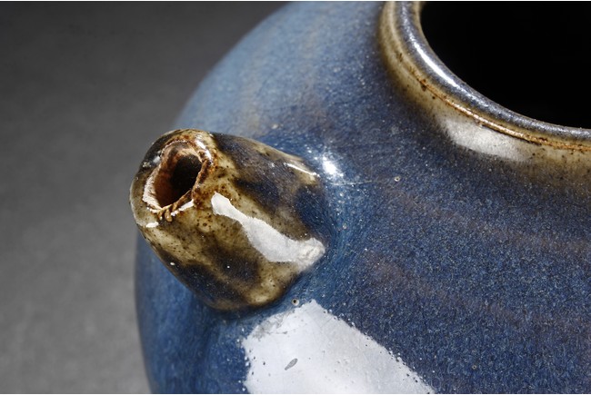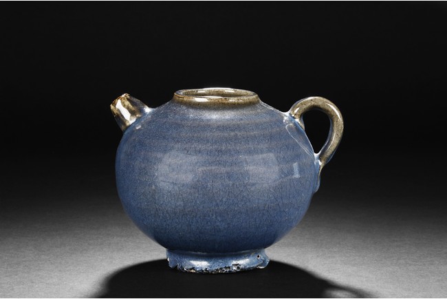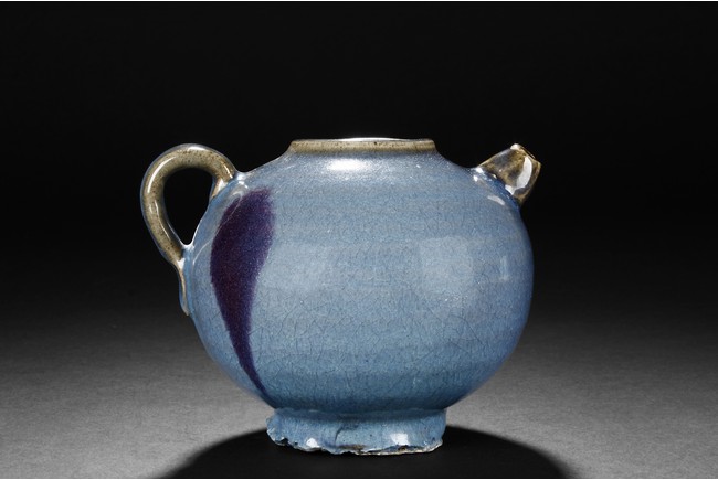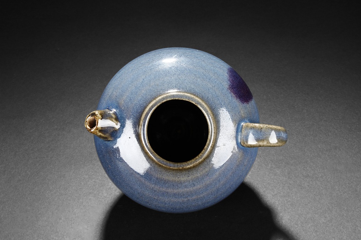 Of bulbous form, the Jun-type teapot glazed in attractive blueish purple, with layered brown rings and crackle patterns. The bottom unglazed and has chipping damage.