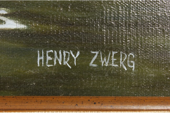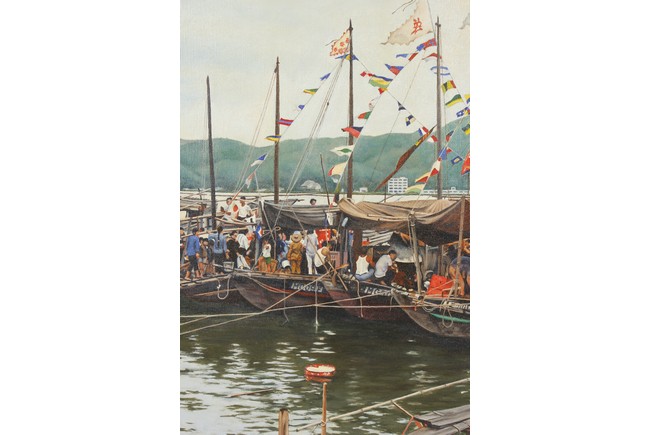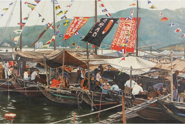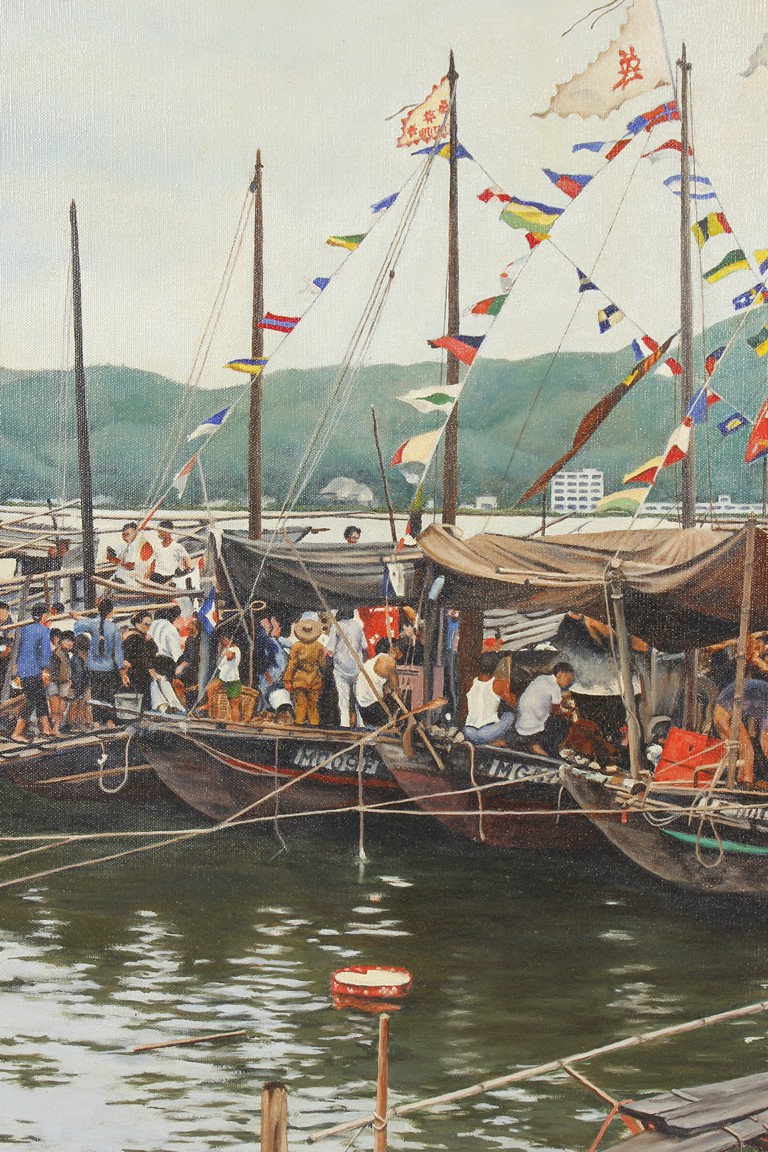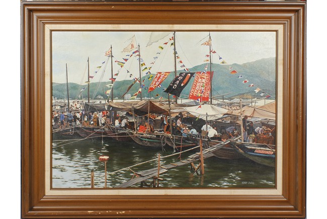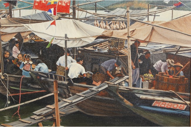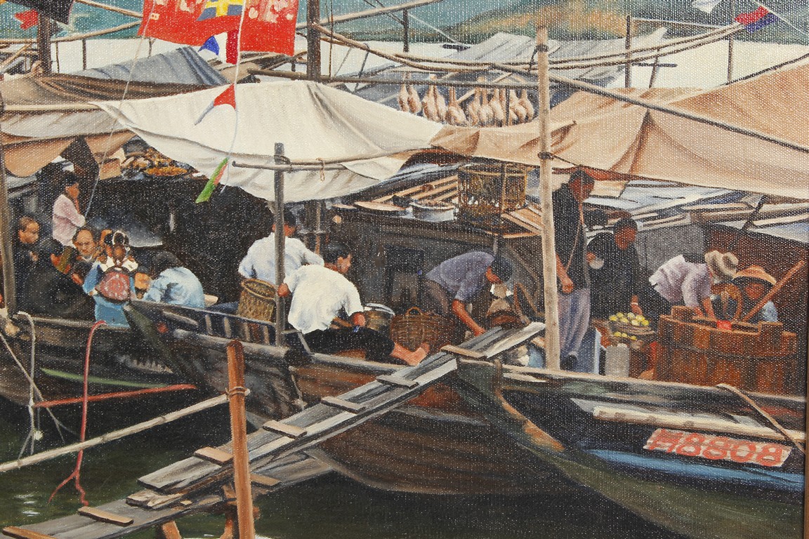 An oil painting of a Chinese water market on the boats by 'Henry Zwerg', shape in rectangular, wood framed.