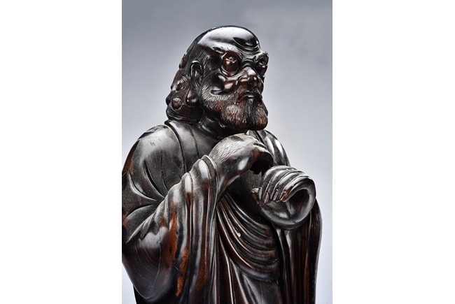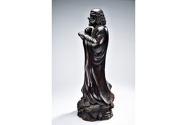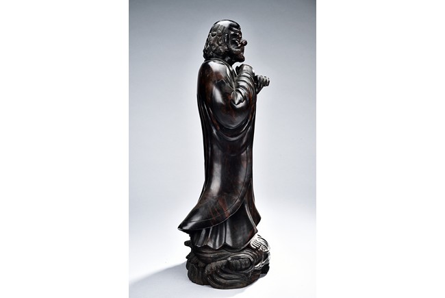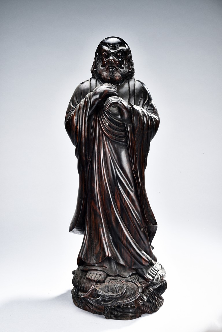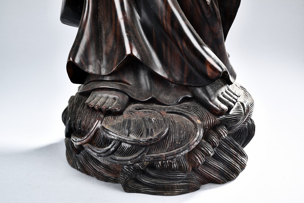Carved standing upon wave-like base, the figure is shown wearing long robe with heavy holds, two hands raised as if holding a staff, the intense face with prominent eyes looking upward. Qing Dynasty period.