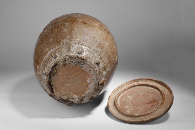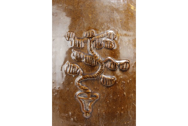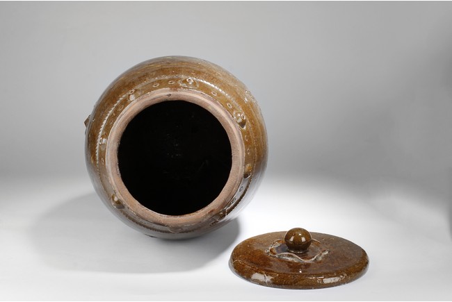 A large porcelain jar of cylindrical shape, brown color, plants motif on the body, used as a container for pickled food.
