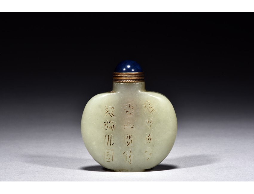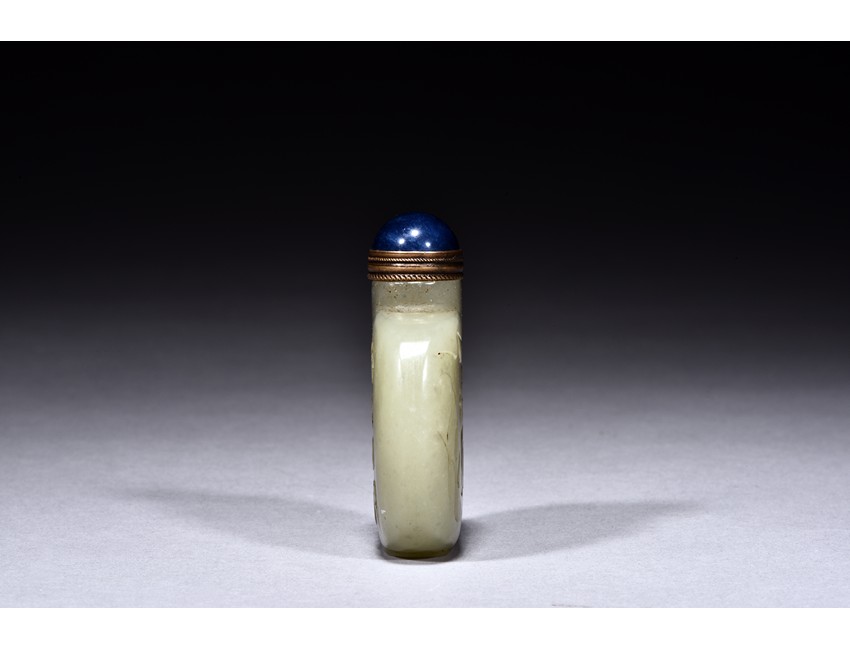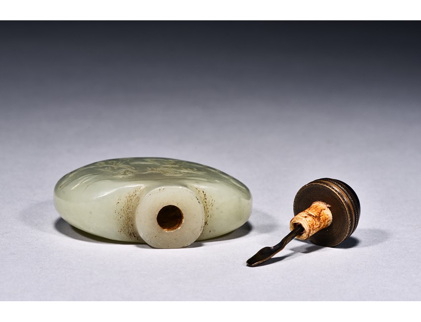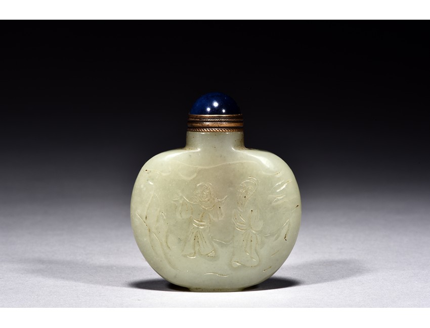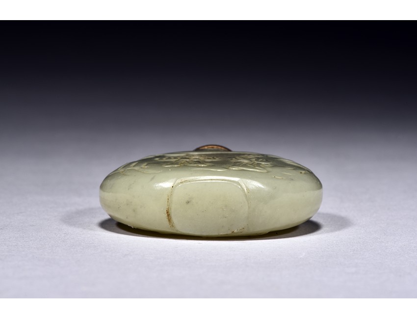Of flattened rounded form, carved with figures and poem in relief, the stone is of celadon white tone.