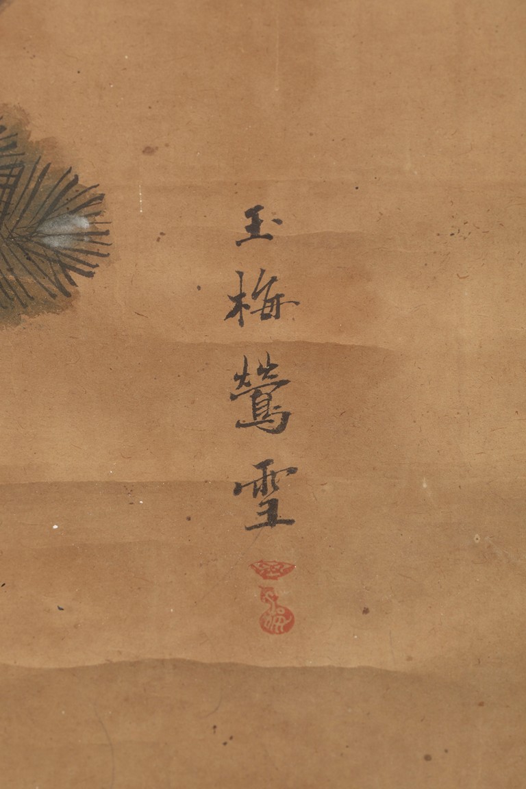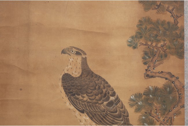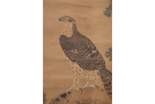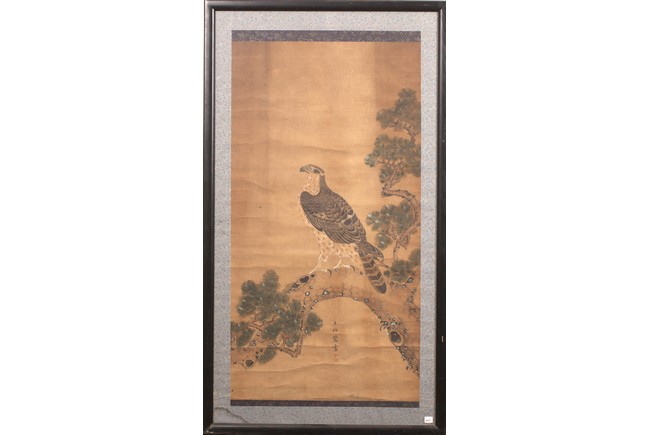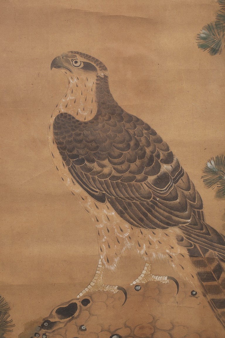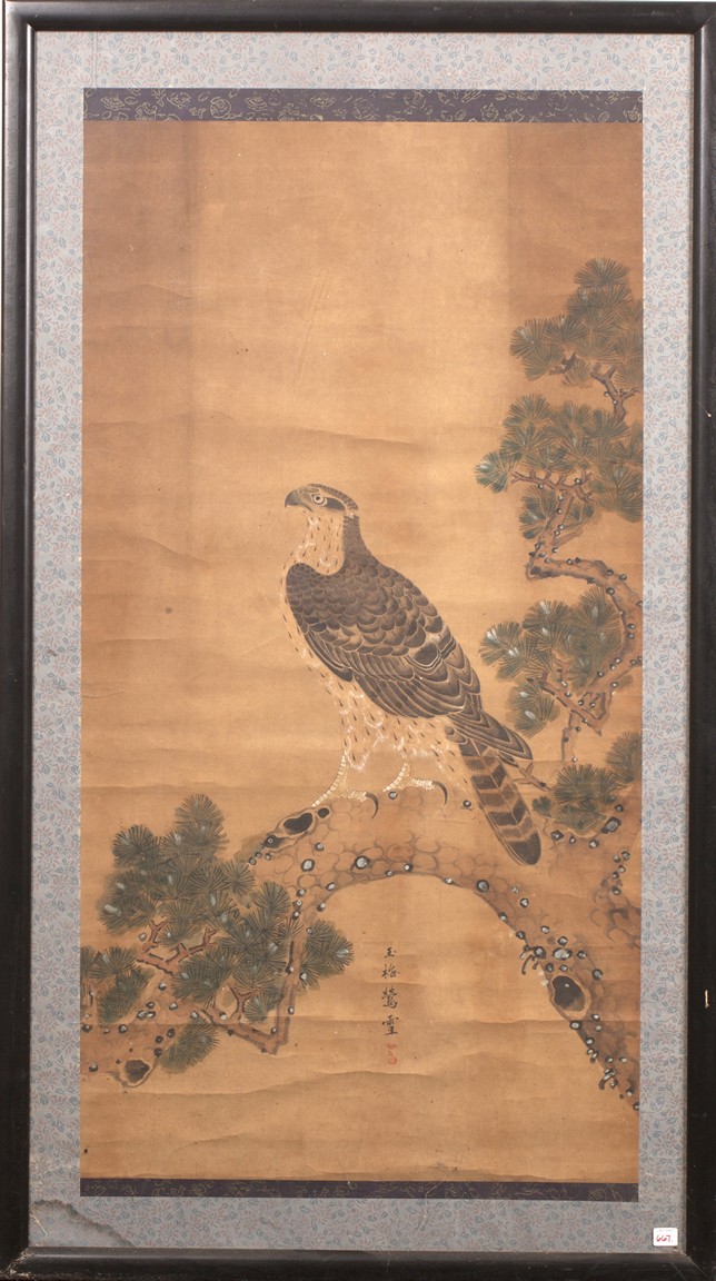 A picture framed ink on paper painting of a hawk perching on a pine tree.