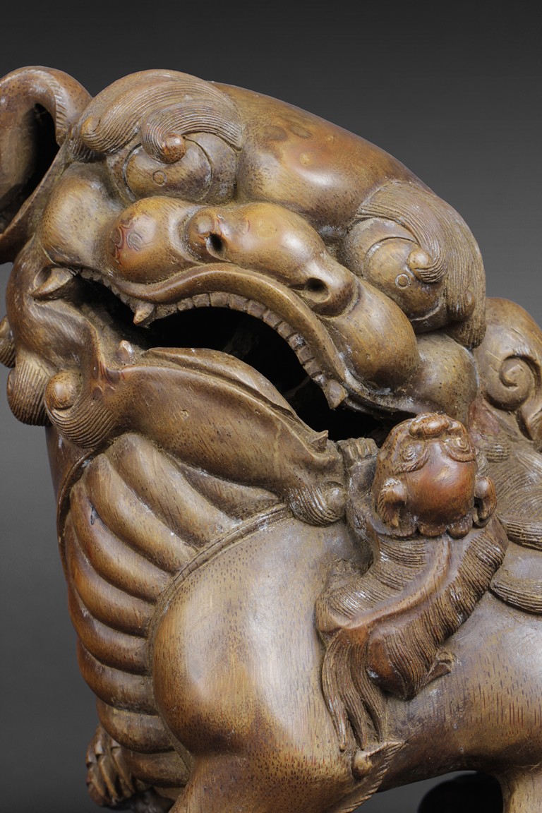 Both guardian lions depicted with head turning sideways and with a playful expression; the male lion holds a ball under his left paw, while the female lion has a small cub on her side. 19th century.