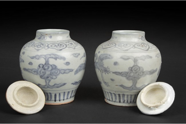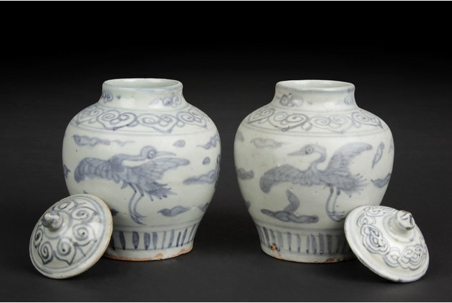 A PAIR OF BLUE AND WHITE 'CRANES' SMALL JARS WITH COVERS    明 青花雲鶴小蓋罐一對