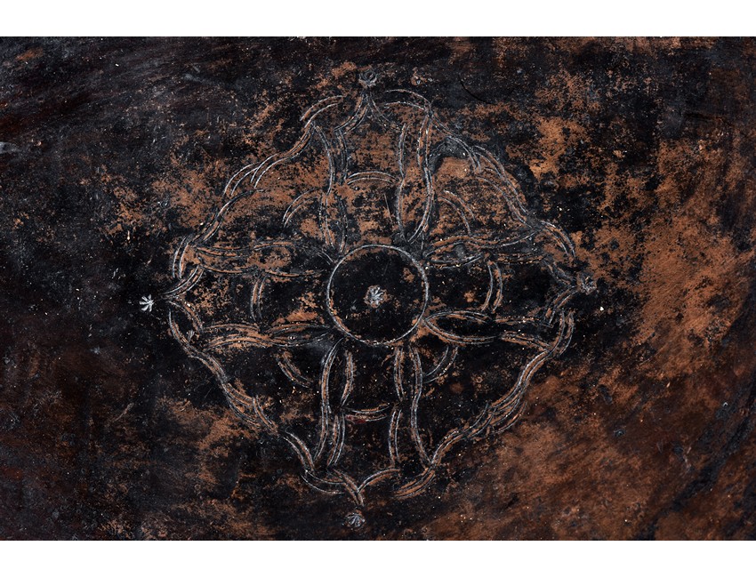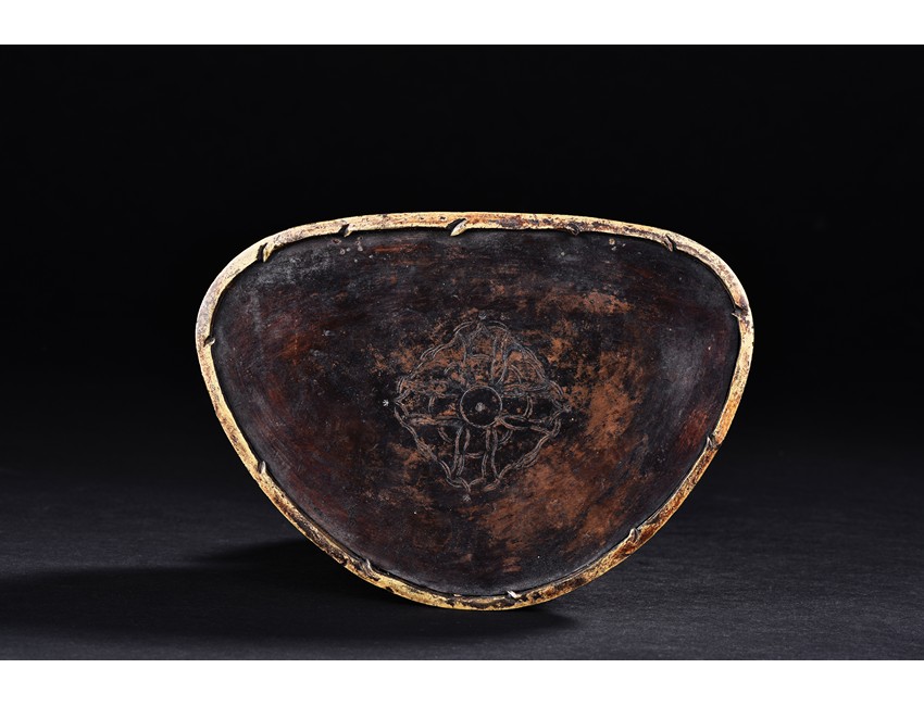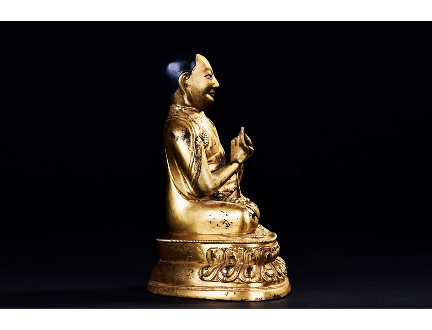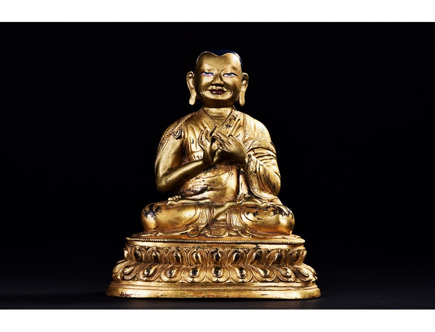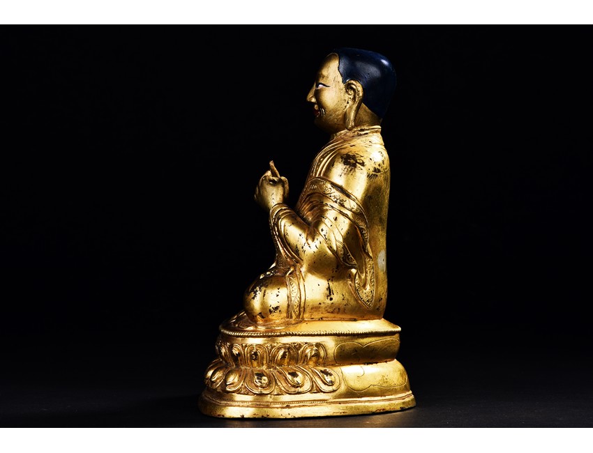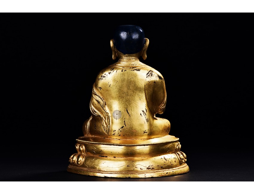 Seated on a double-lotus base in dhyanasana and wearing long robes, the hands are held in Dharmachakra Mudra, the face with serene expression. Qing Dynasty period.