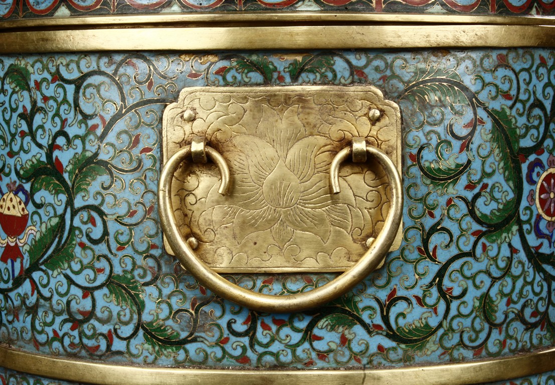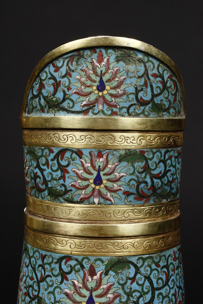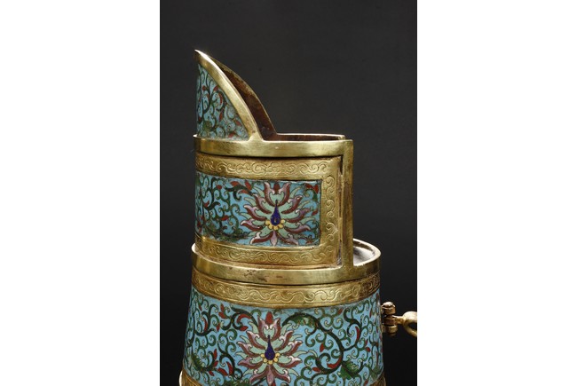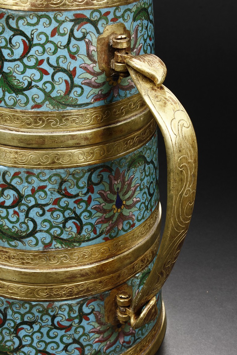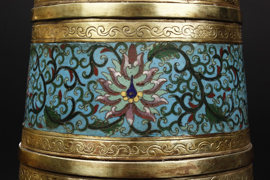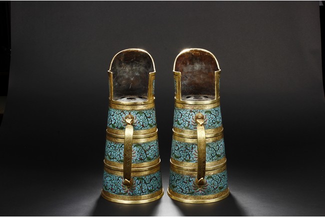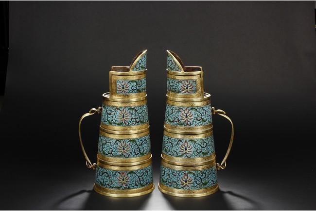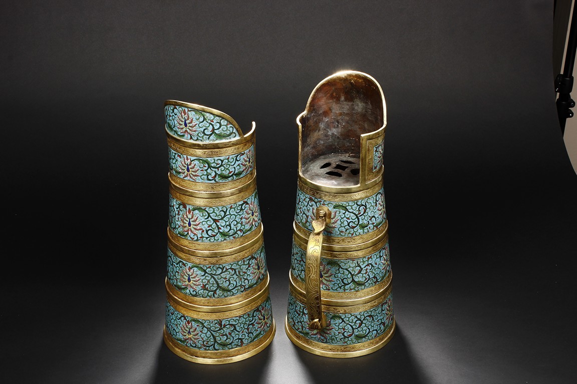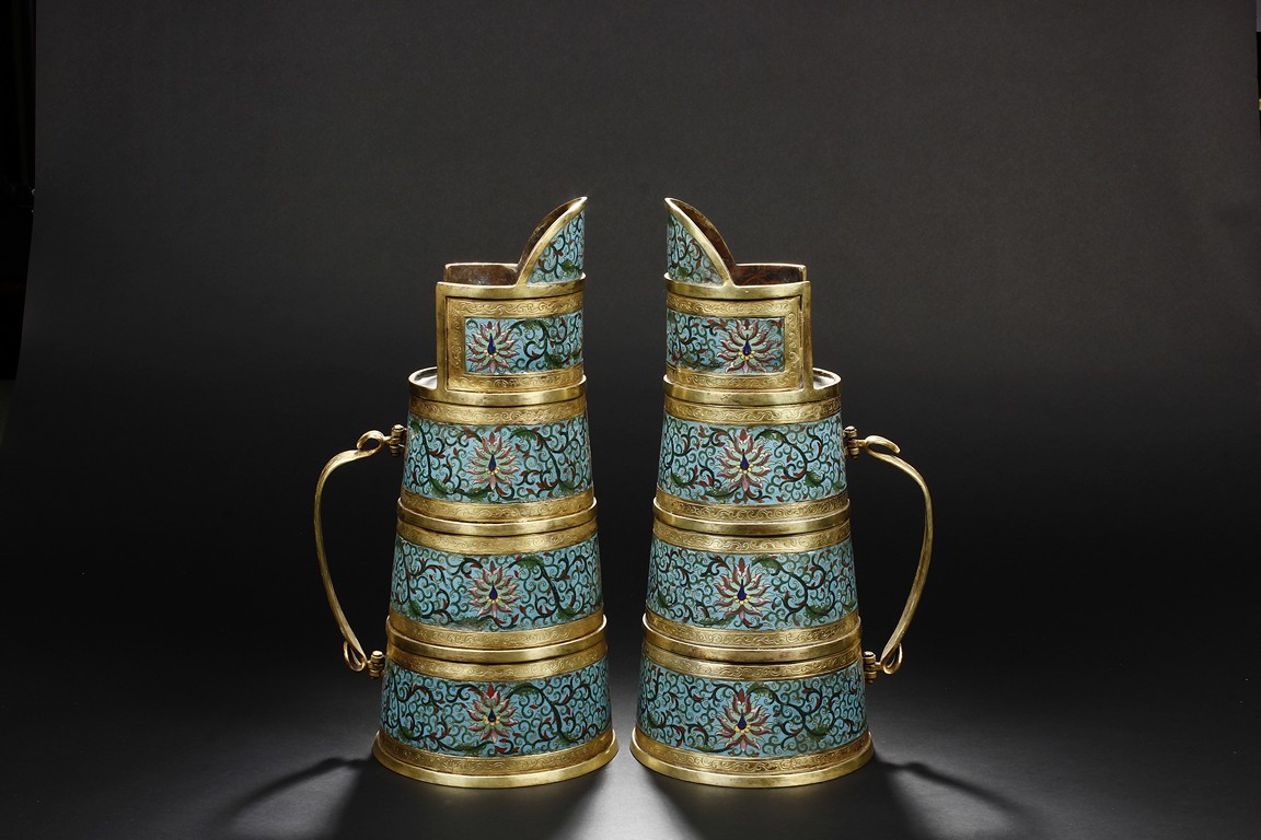 This set comprises of a pair of Tibetan-style ewers. The ewer has a tall and cylindrical body divided into four sections by raised gilt-bronze bands incised with cloud scroll patterns. Each of the horizontal register is adorned with elaborate lotus scroll amidst foliage scroll. The gilt-bronze body is gilded and decorated with foliate scroll. Both ewer pair bear four character 'QIANLONG' mark on bottom.