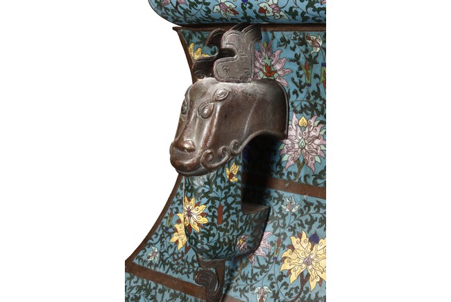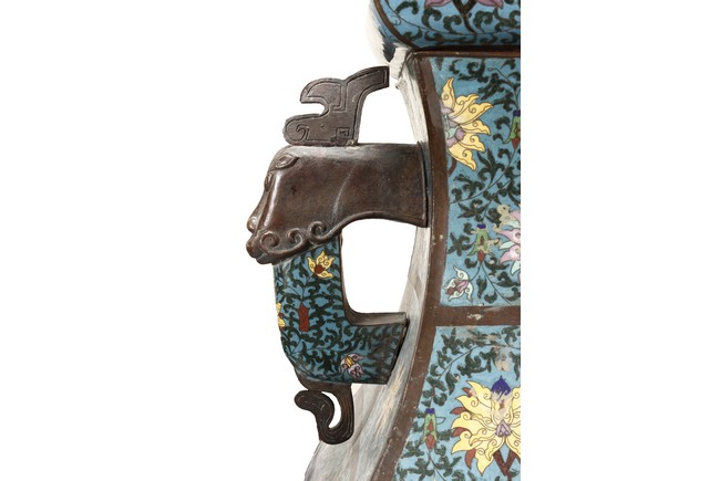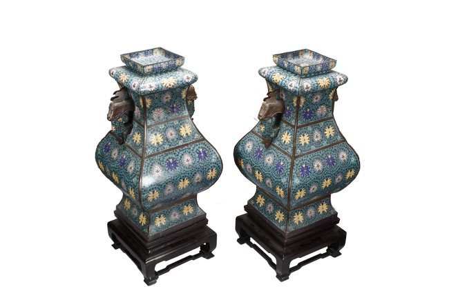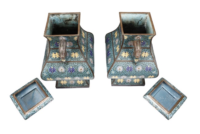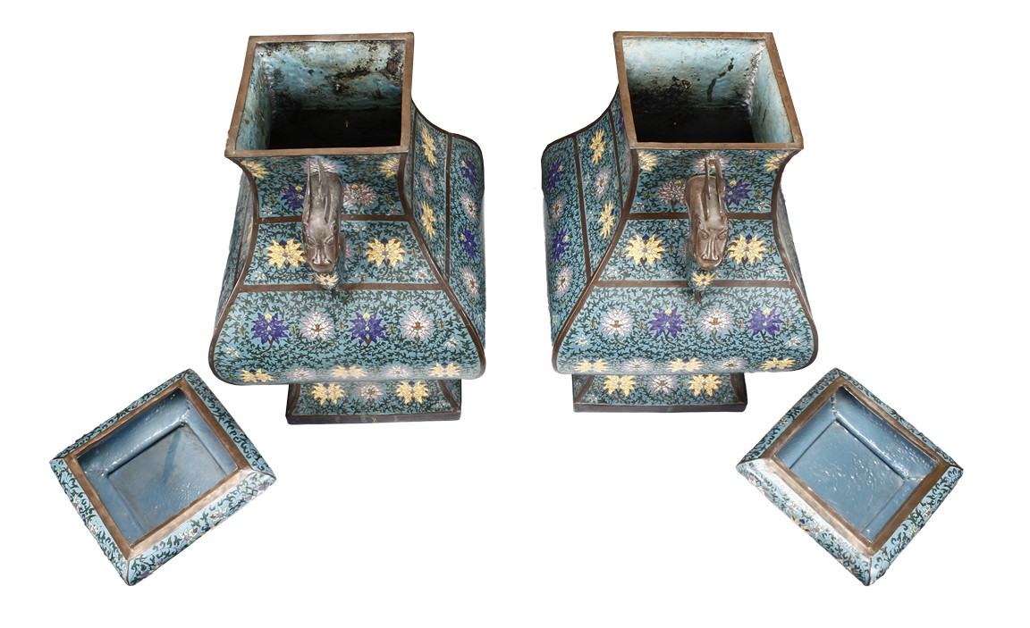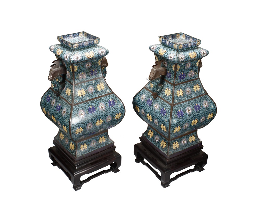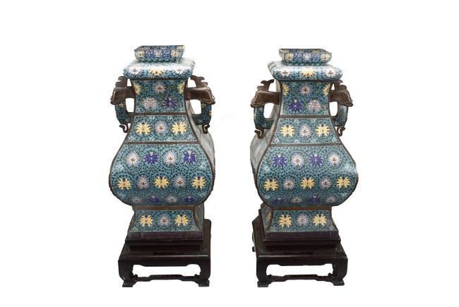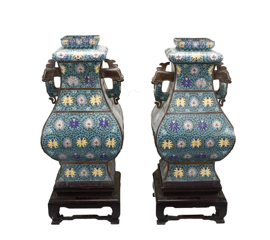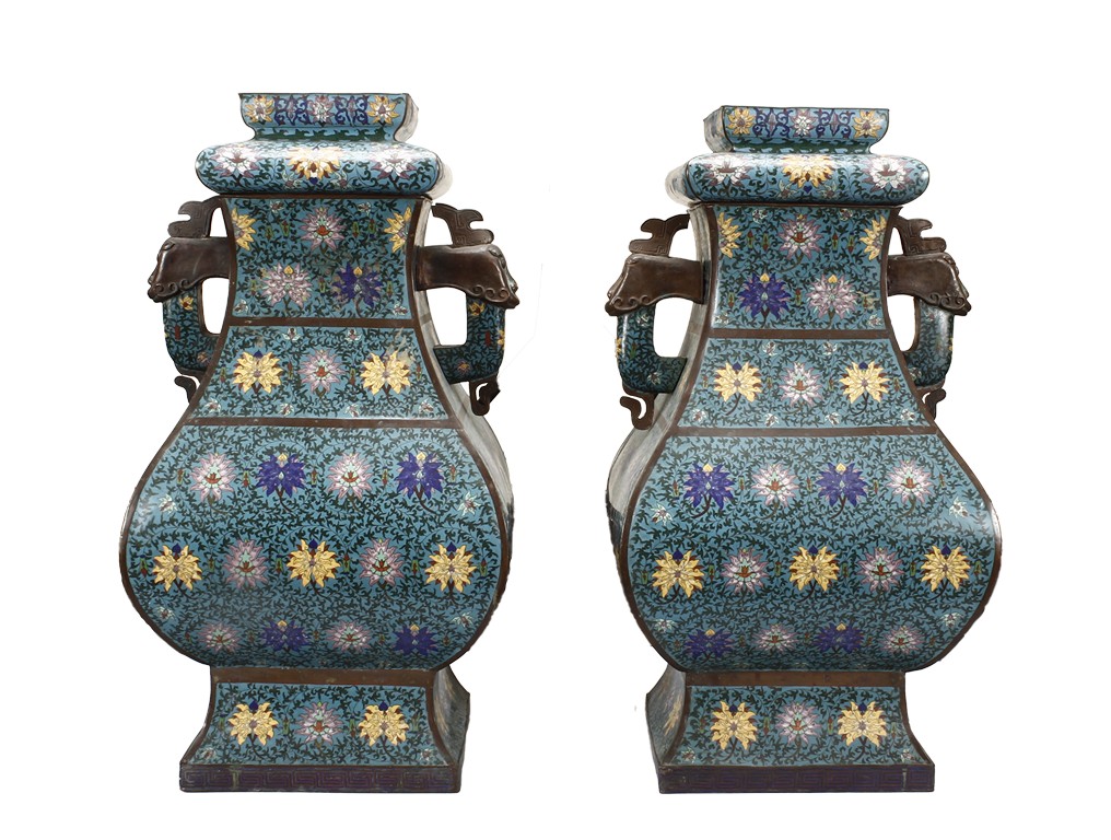 A PAIR OF LARGE CLOISONNE ENAMEL VESSELS 清 景泰藍雙耳帶蓋大瓶一對
