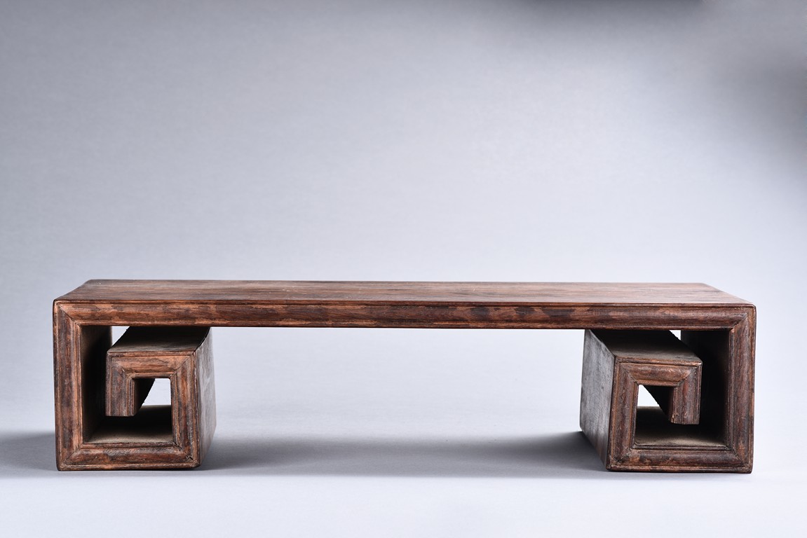Of rectangular model, each stand is carved with key-fret formed ends. The wood surface is of natural hardwood grain and pattern.