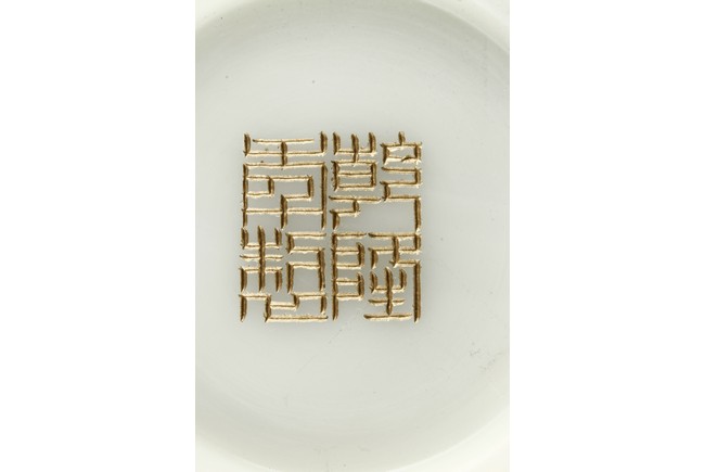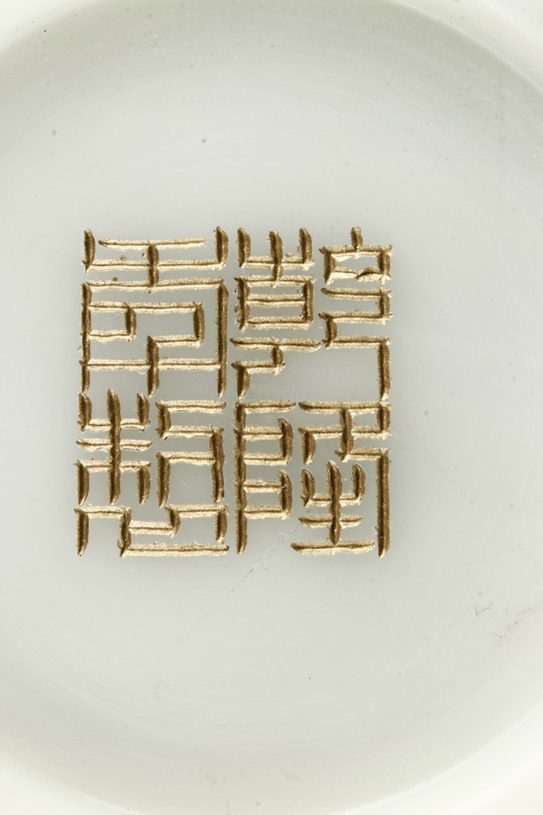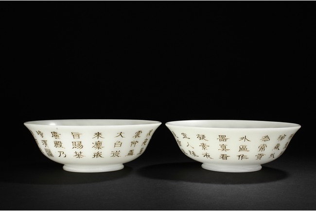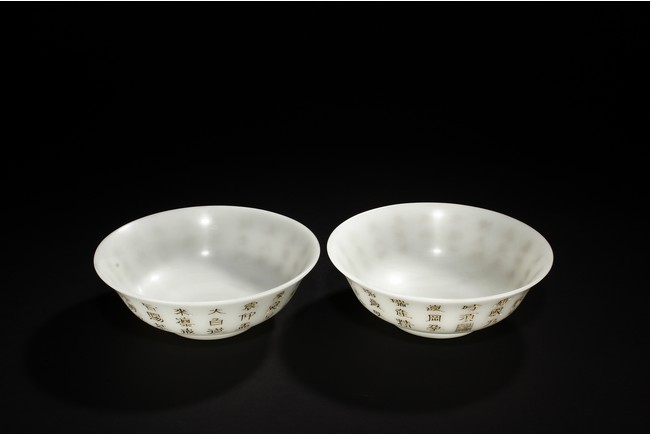 The shallow bowls curves elegantly, supported by splayed ring foot, the body gilt with poetry calligraphy and artist mark, all on top of smooth white glass, and the bottom bears four character 'QIANLONG' mark. Qing Dynasty Period.