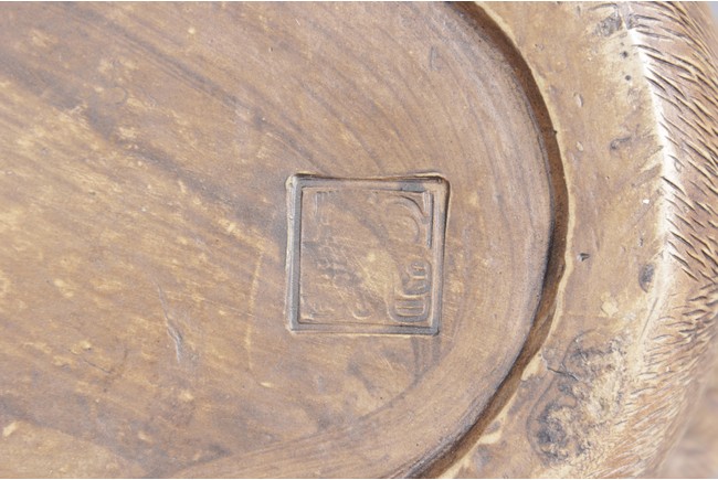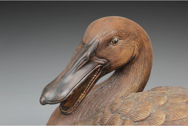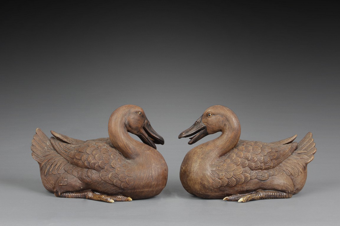 Intricately carved and detailed, the ducks were in seated position, feet and body resting directly on the ground, wings collapsed, tails up, and beaks slightly open, four characters mark on the side of one duck.