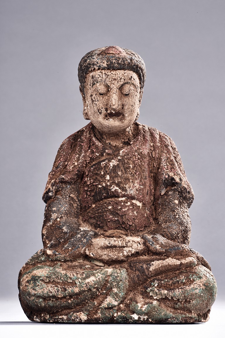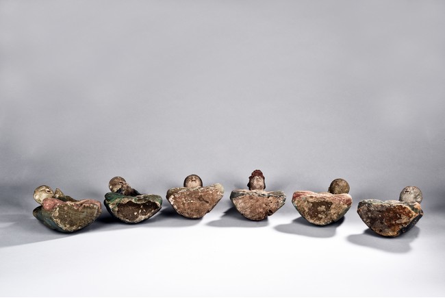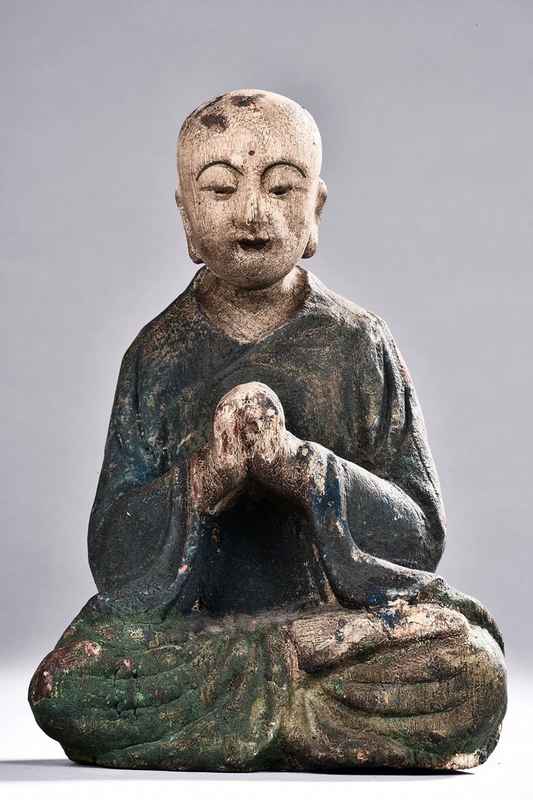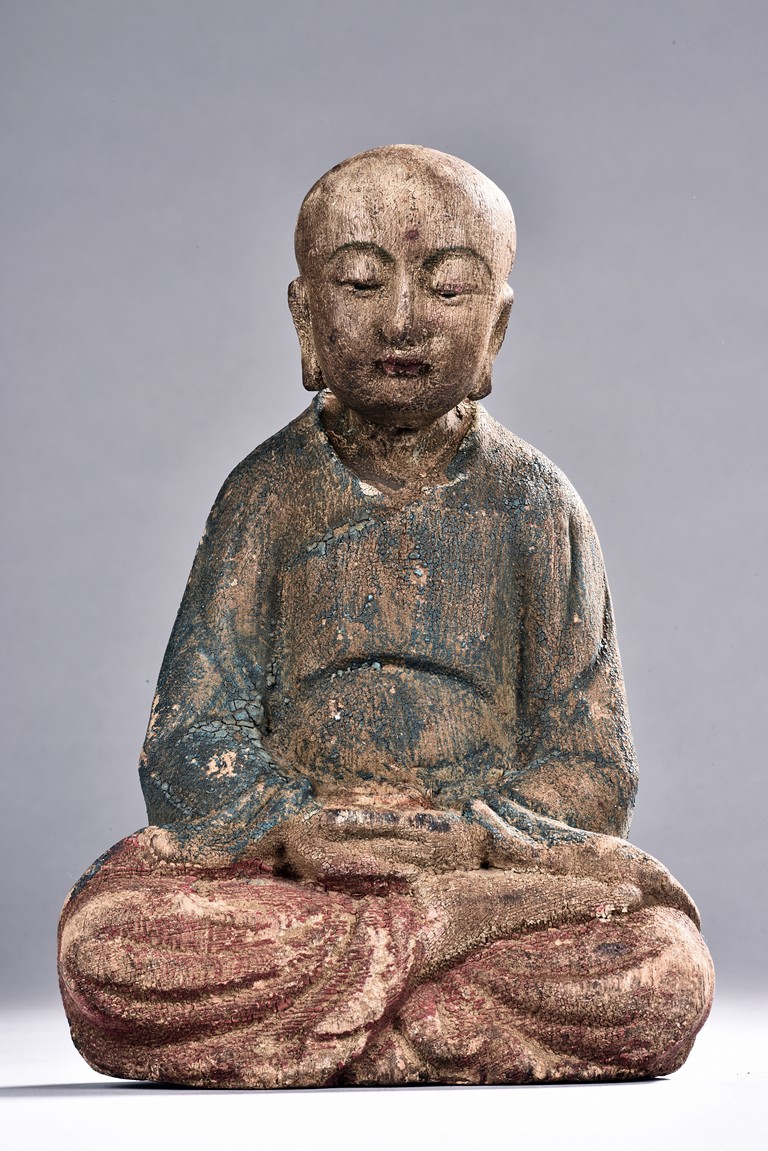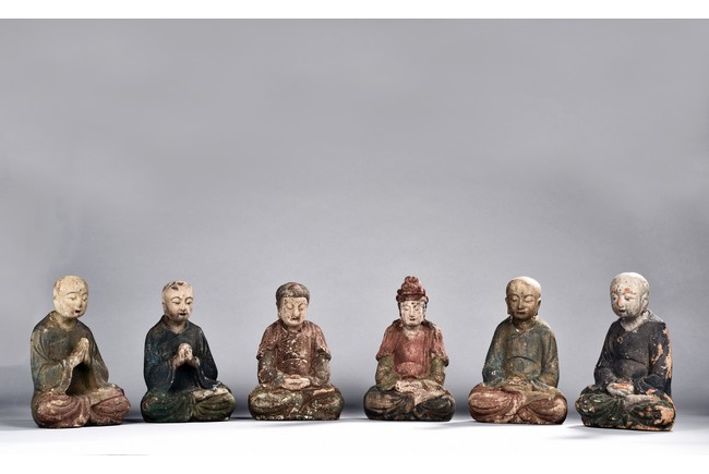 Comprising of six polychrome seated wood luohan or bodhisattva figures, each painted with blue, green, or red pigment.