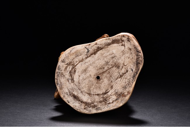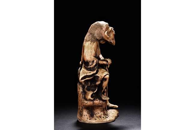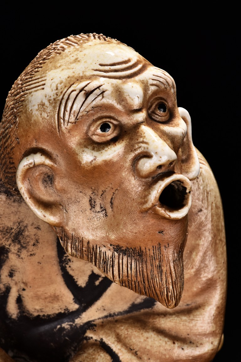 The well modelled figure is shown as an old man seated on a rock with both hands holding a stick, wearing loose robe with folds, the face shown with a vivid expression, the mouth in O-shape, eyes wide open, the hair and beard finely incised in details.