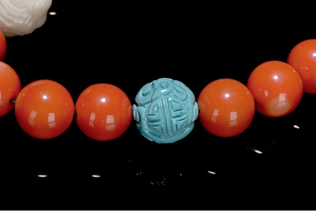 Consisting of 18 red coral beads and three turquoise beads.