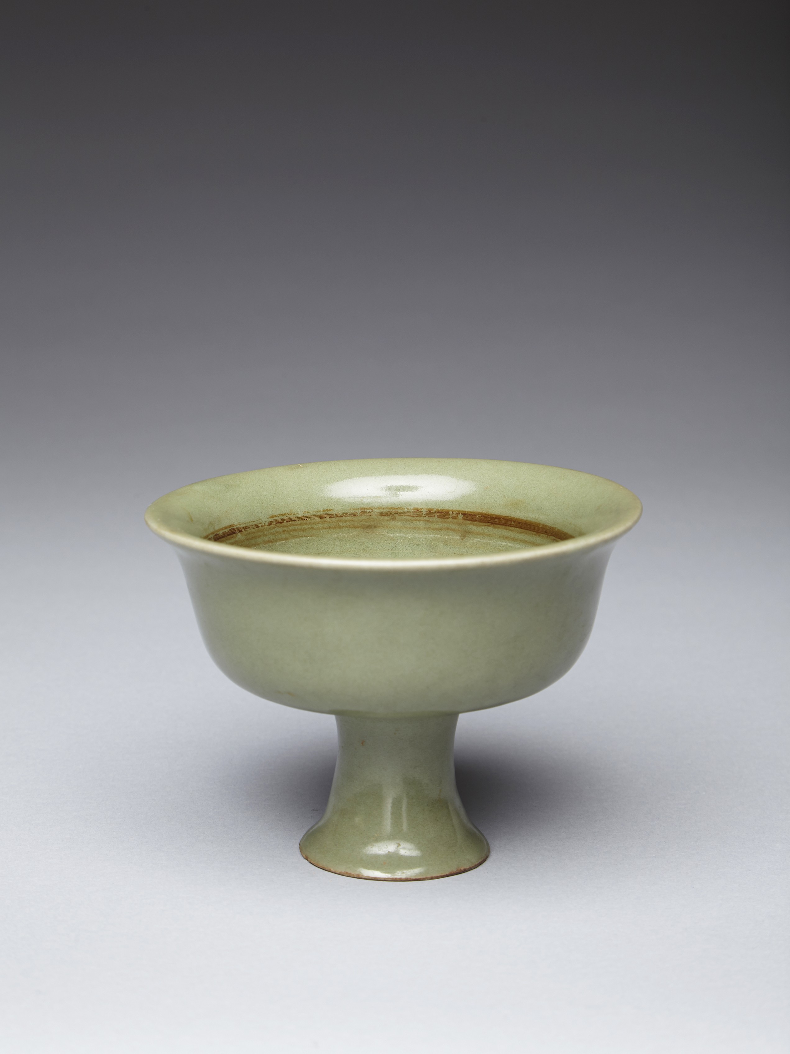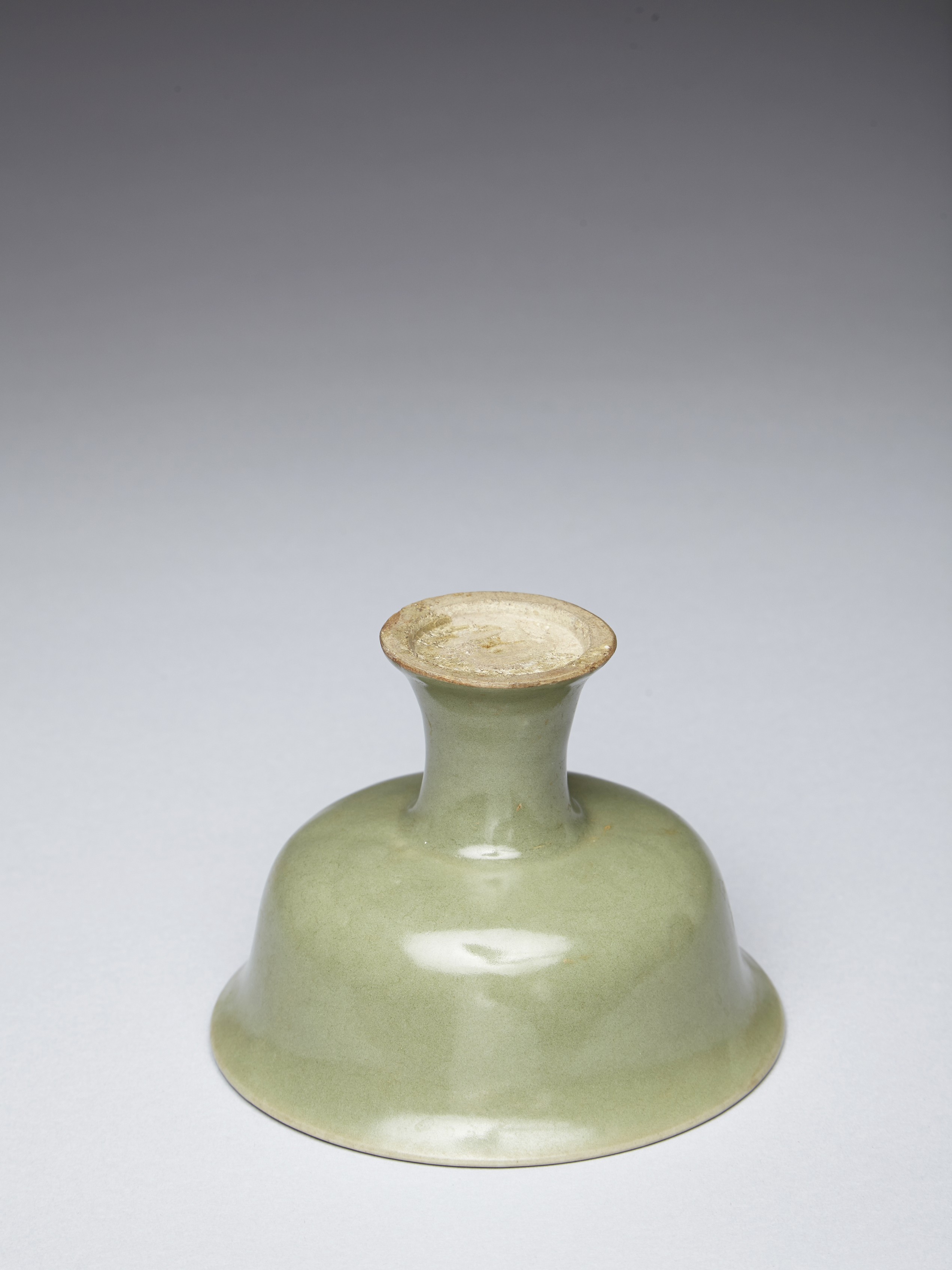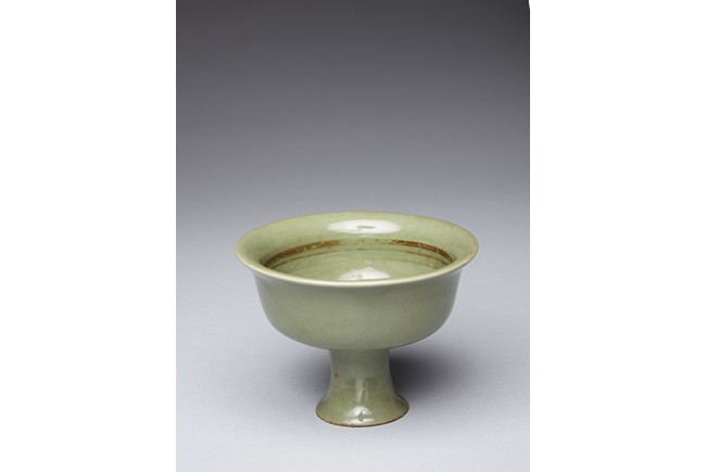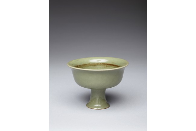 The well potted bowl is raised on a stem foot, the slightly tapered body rises to flared rim, overall covered with even celadon tone except the unglazed base. Ming Dynasty period.