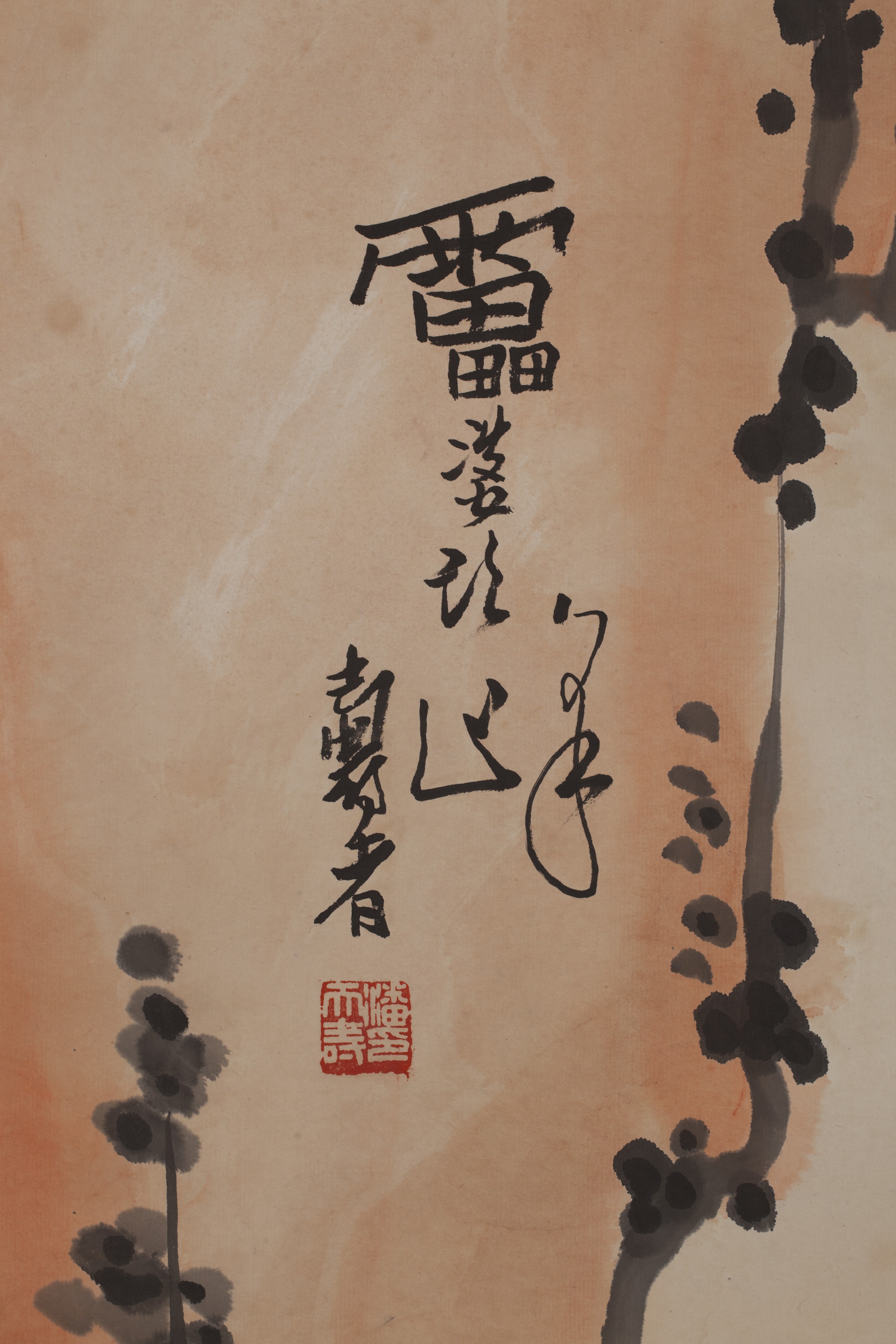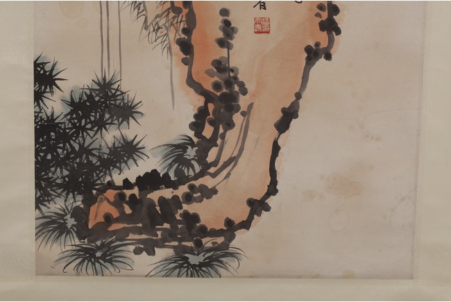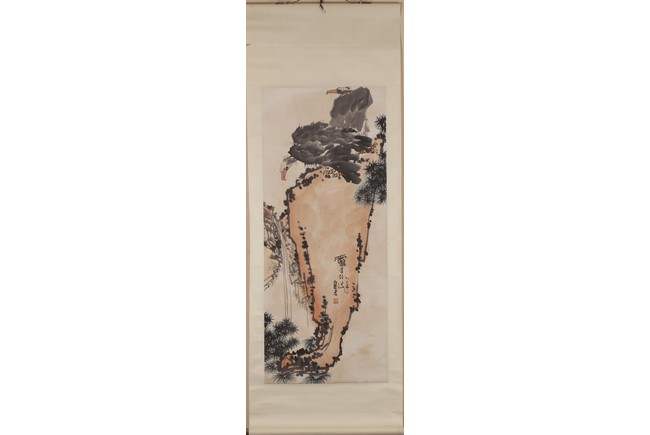 Ink on paper painting of two bold vultures perching on a tall rock, surrounded by pine trees and a waterfall. Artist mark and seal in the center. Attributed to Pan Tian Shou.