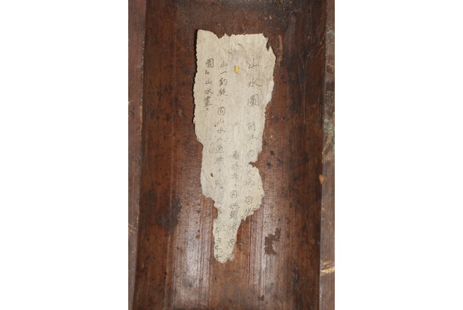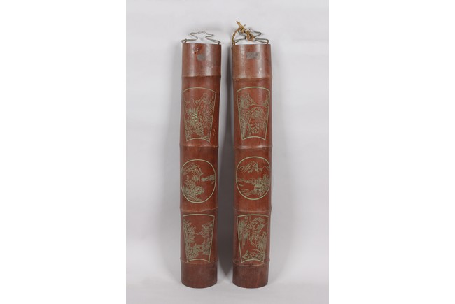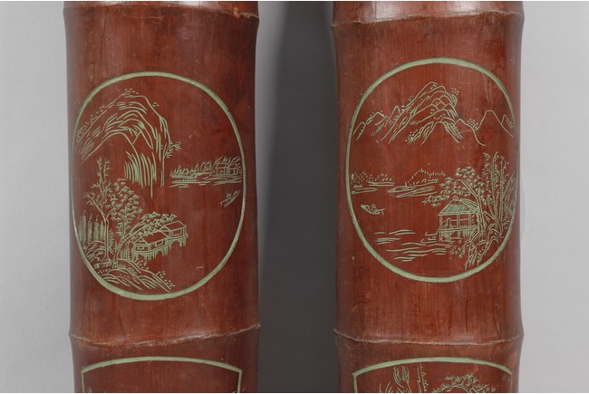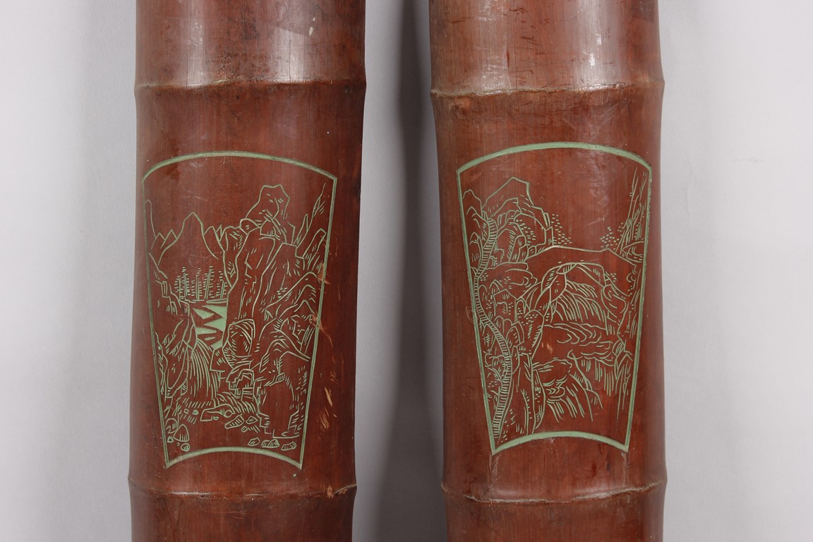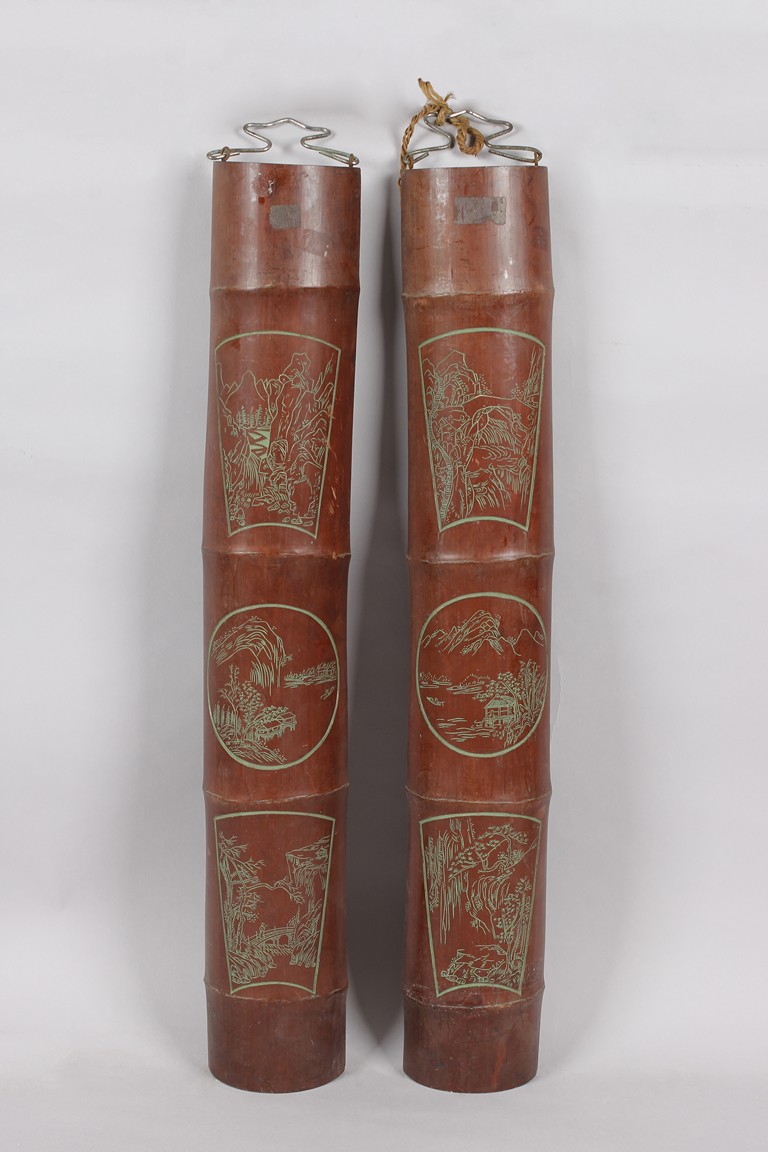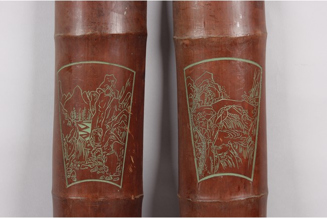 Beautiful landscape settings finely inscribed on the pair of bamboo pieces, dark red color coated on the bamboo pieces.