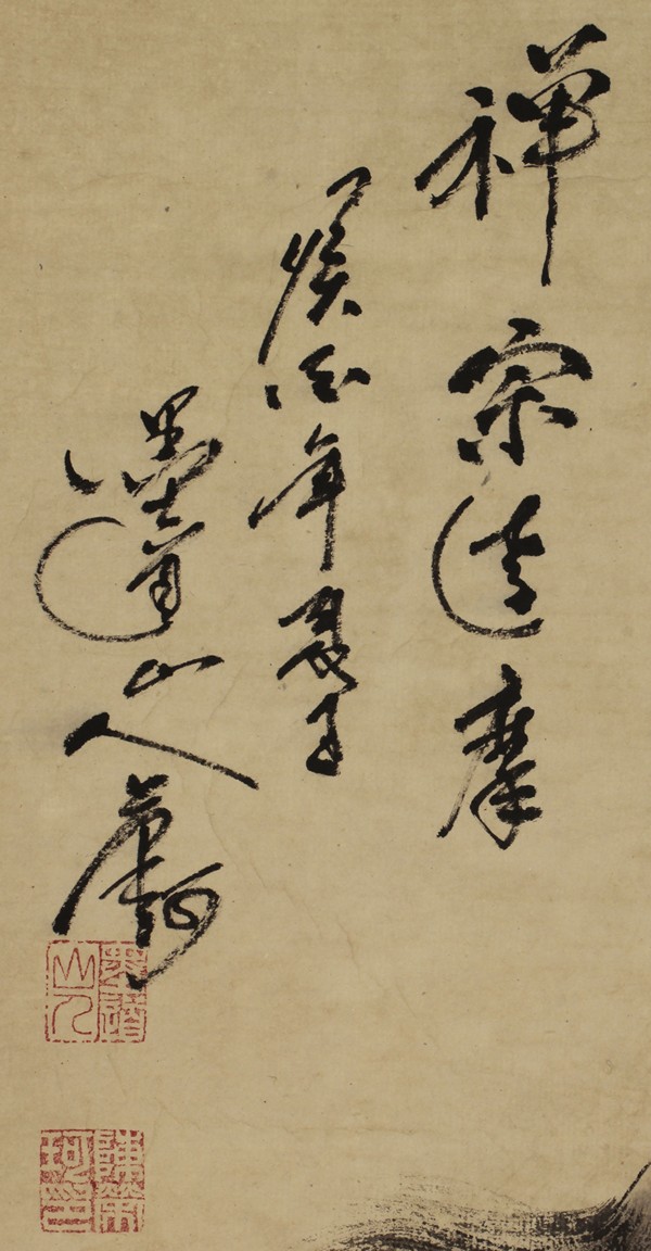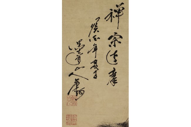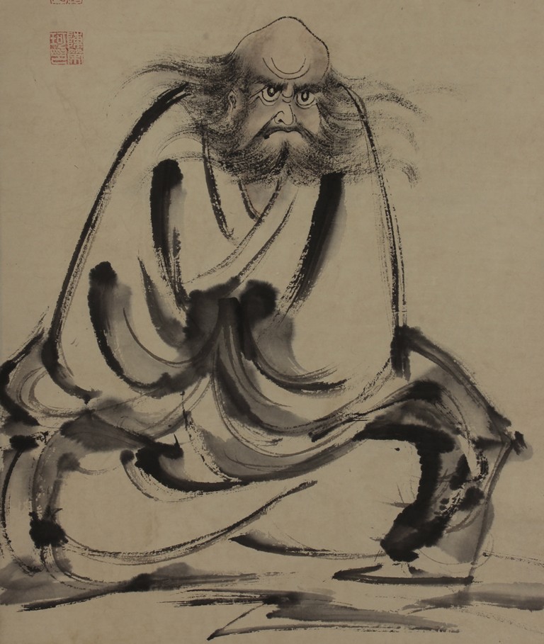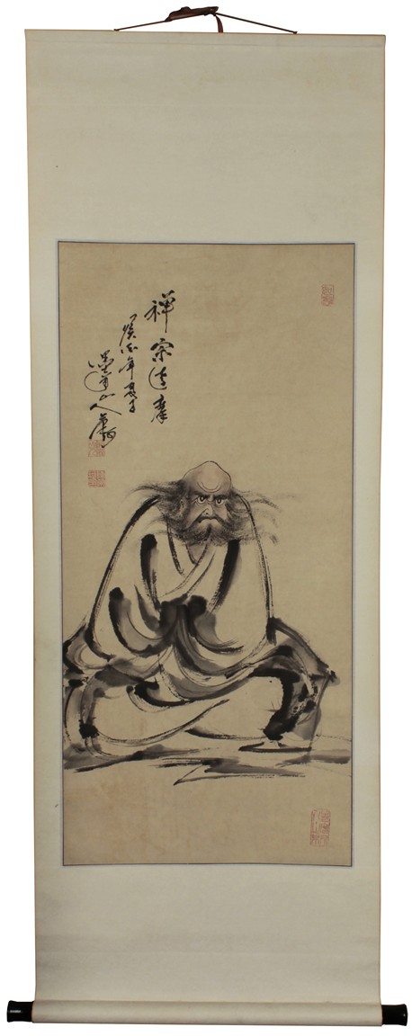 Ink on paper painting, hanging scroll. The painting depicts a seated Bodhidharma, with eyes wide open. Chinese verse, artist signature and mark 'Modao Shanren' on top left. Additional seal mark on bottom right.