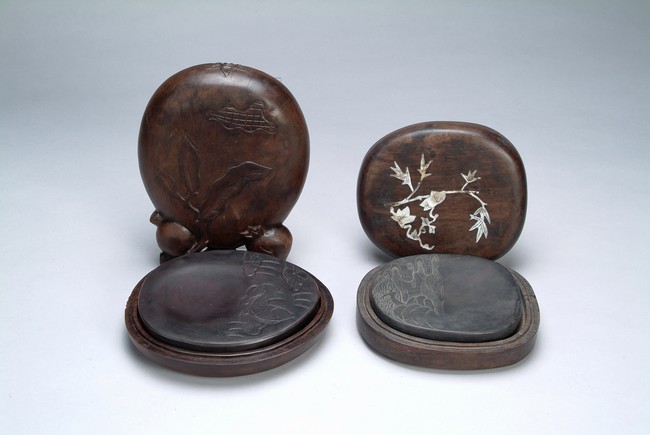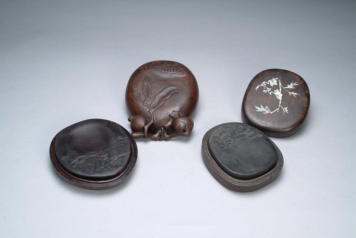 One ink slab is in the shape of peach, with carvings of a pond scene inside; the other ink slab has bamboo tree on the cover, and ocean sky scene inside.