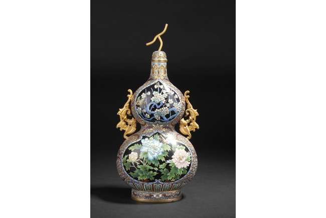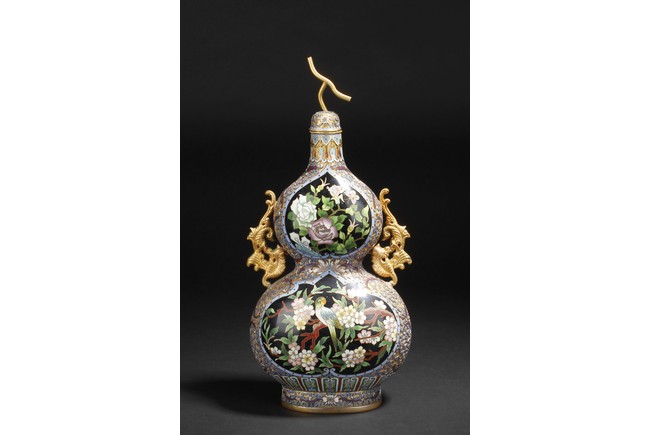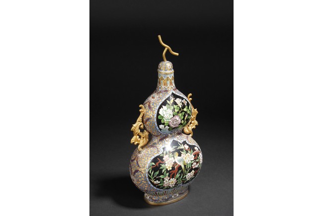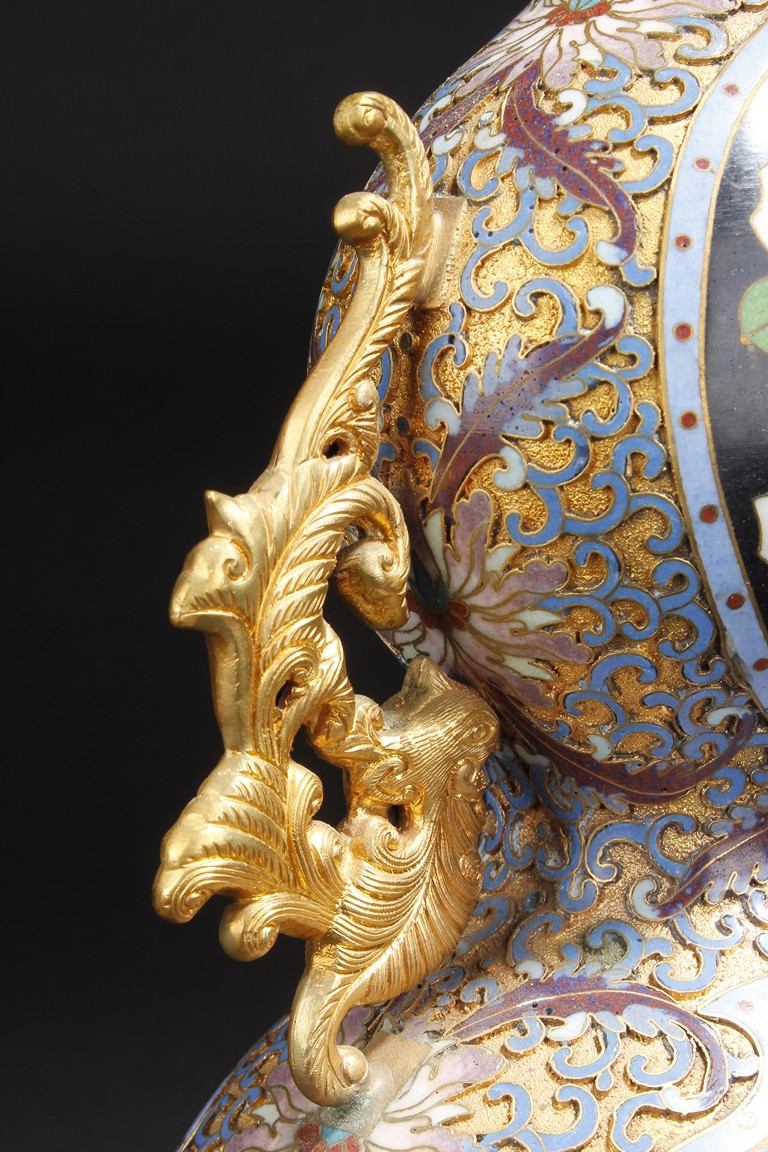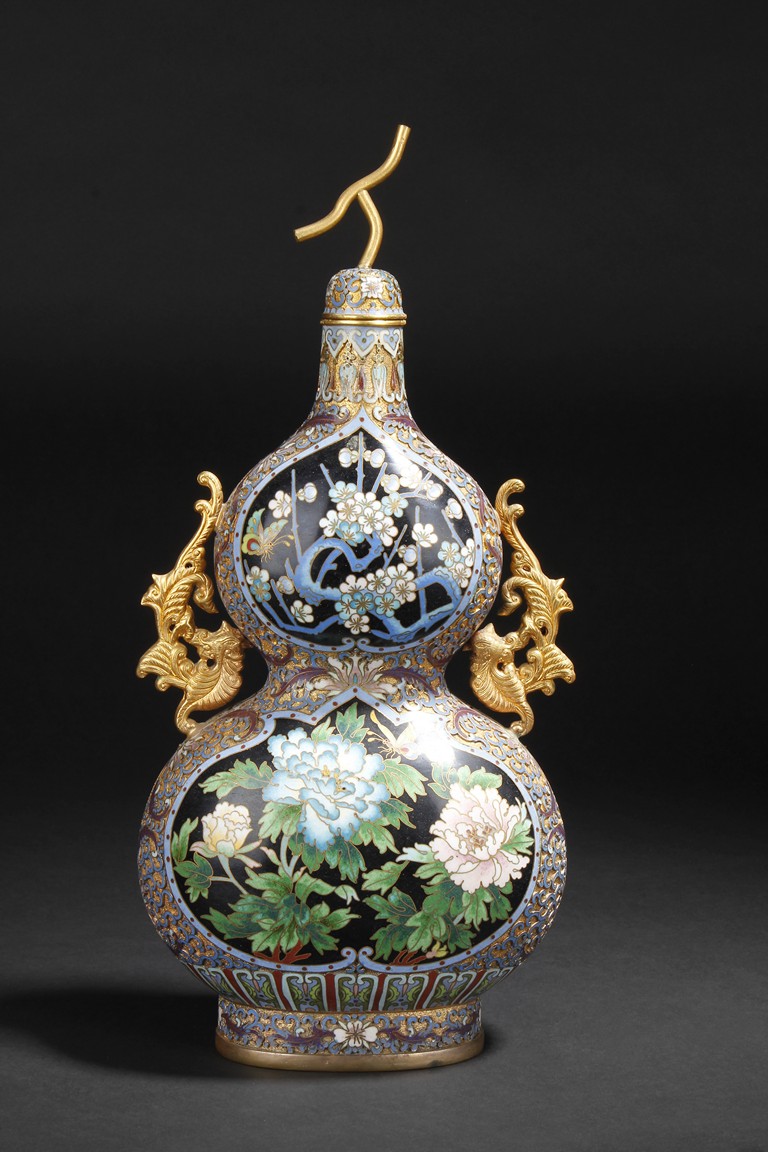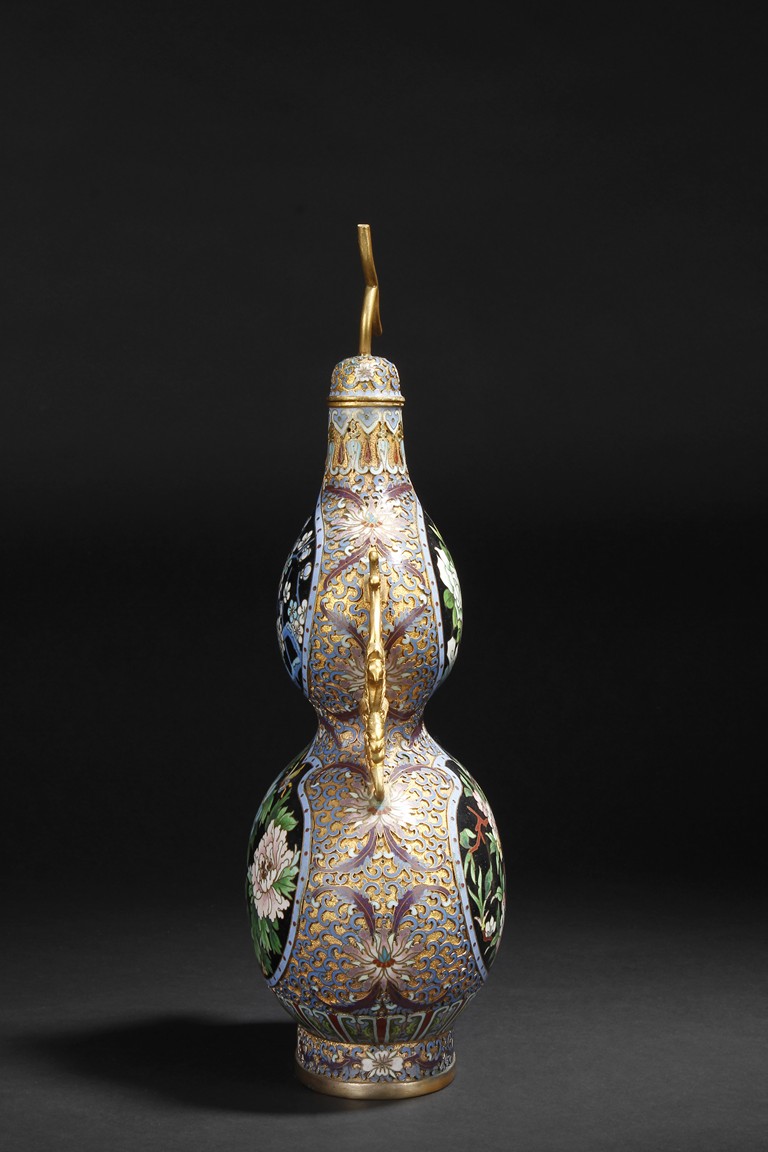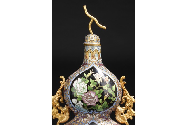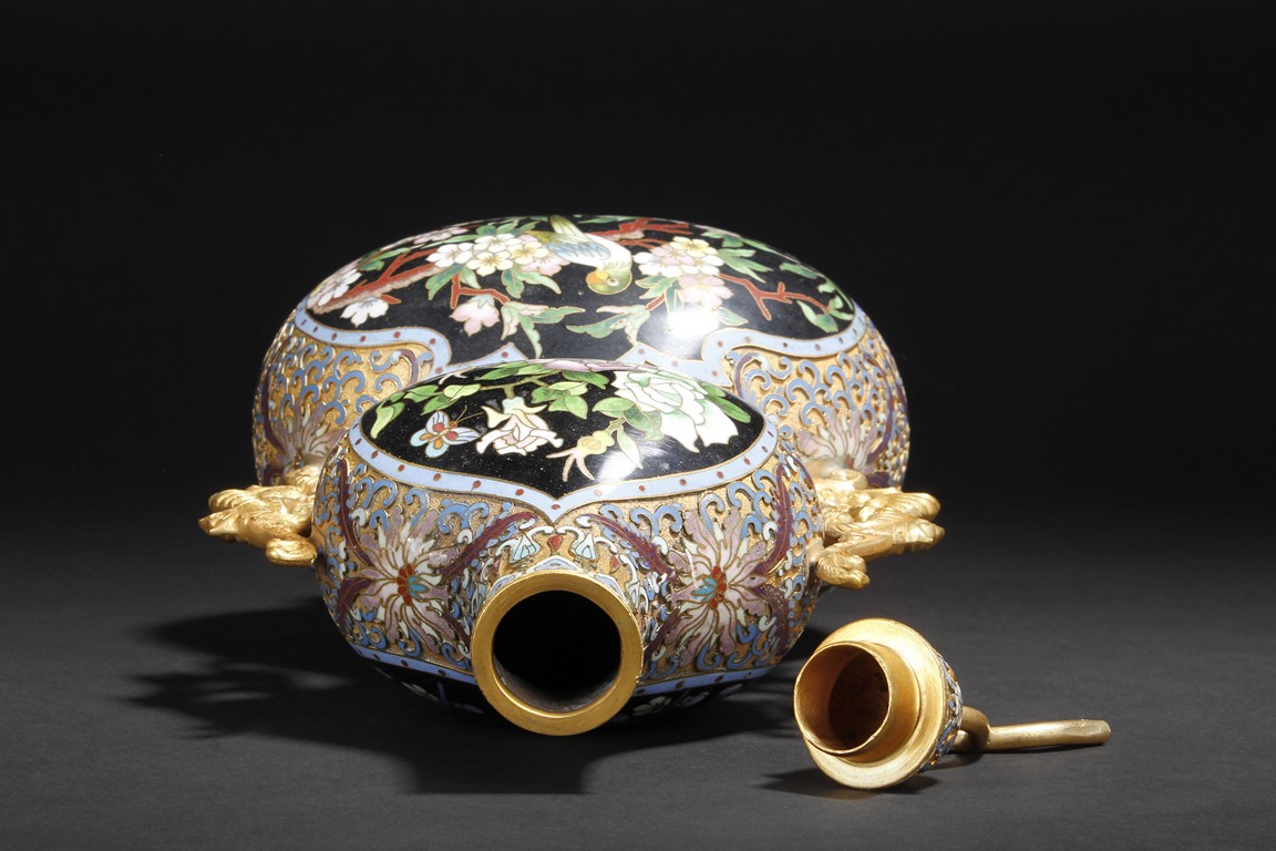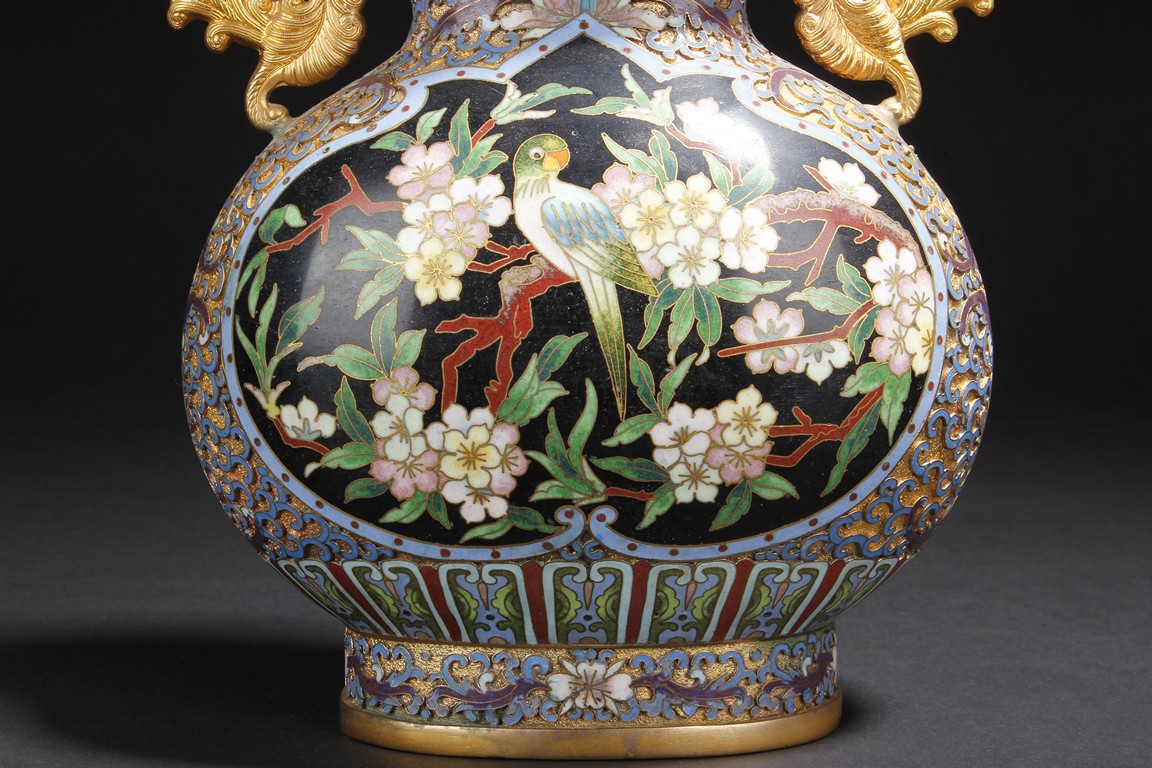 The cloisonne bottle is in the shape of a gourd, the body decorated with ruyi, plum blossom, and parrot motifs, the phoenix shape handles ornamented on each side of the bottle connecting the upper and lower body, capped with a lid with a gourd vine design on the top.