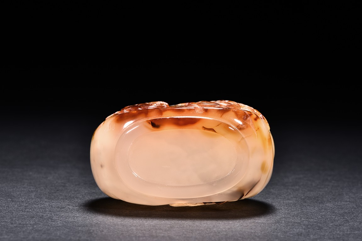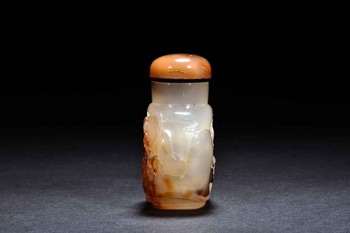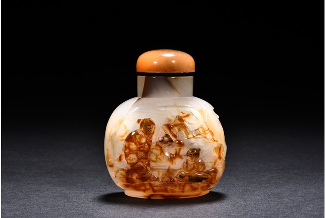 Of compressed globular body, supported on recessed foot with oval foot rim, the well-hollowed stone is carved with an elderly scholar in a conversation with a seated young attendant under pine, reverse carved with a crane in flight, the details cleverly expressed utilizing the brown inclusions and markings in the stone. Qing Dynasty period.