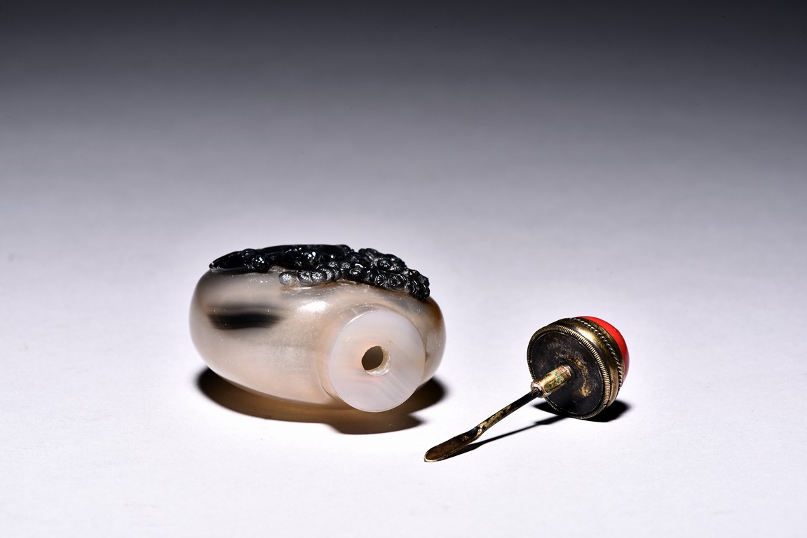Of oblong form, the bottle is carved on one side utilizing the dark black areas with scene of five elderly scholars appreciating a scroll painting under a pine, the other side undecorated showing the natural texture of the stone. Qing Dynasty period.