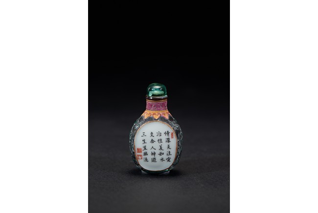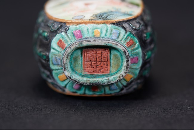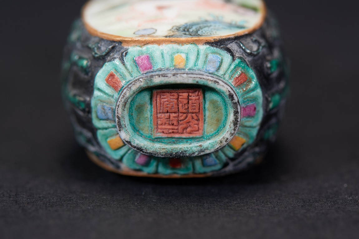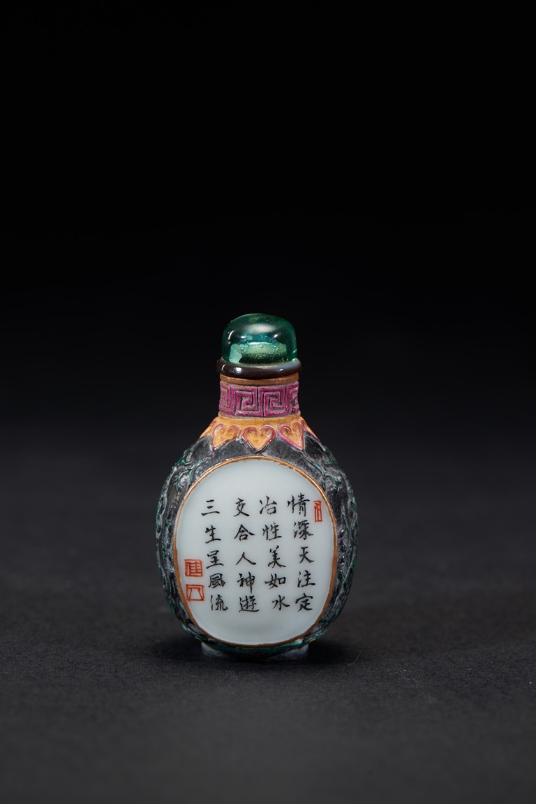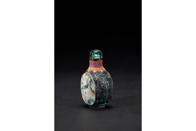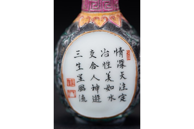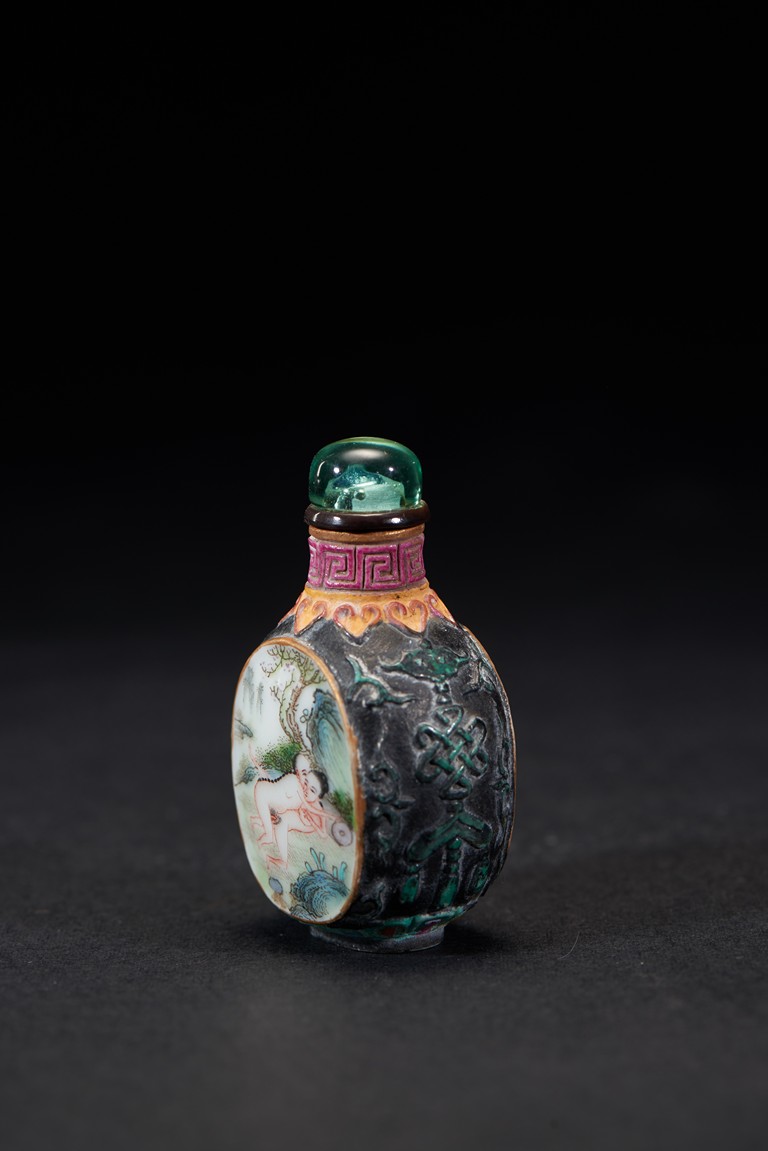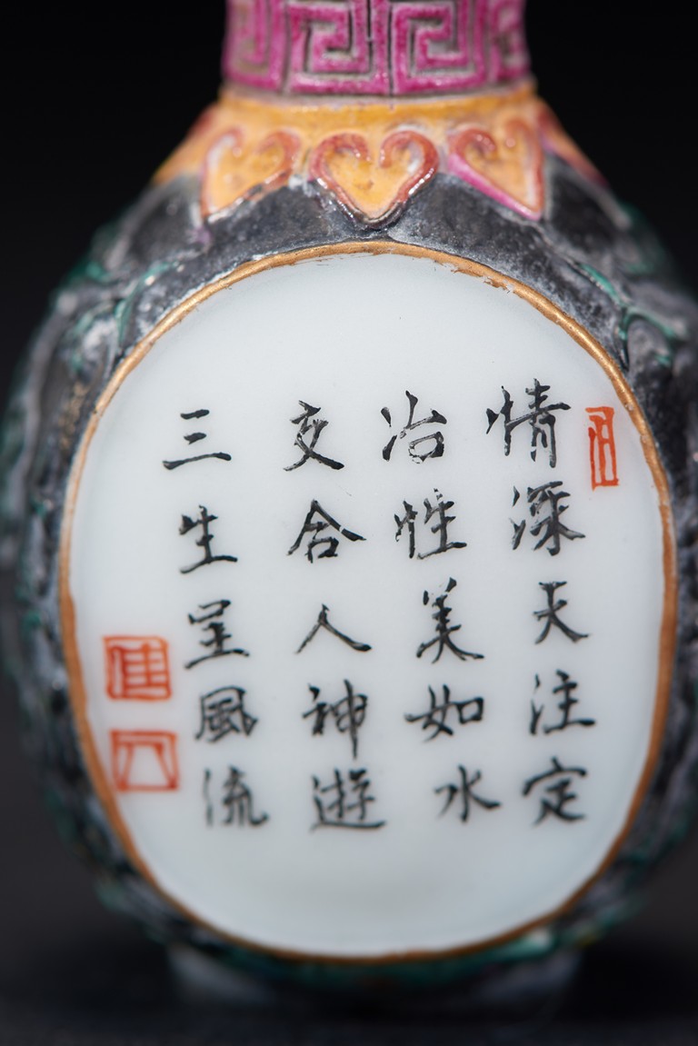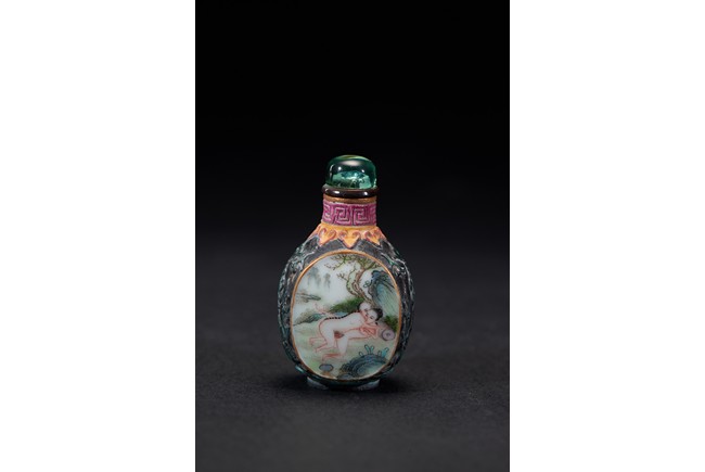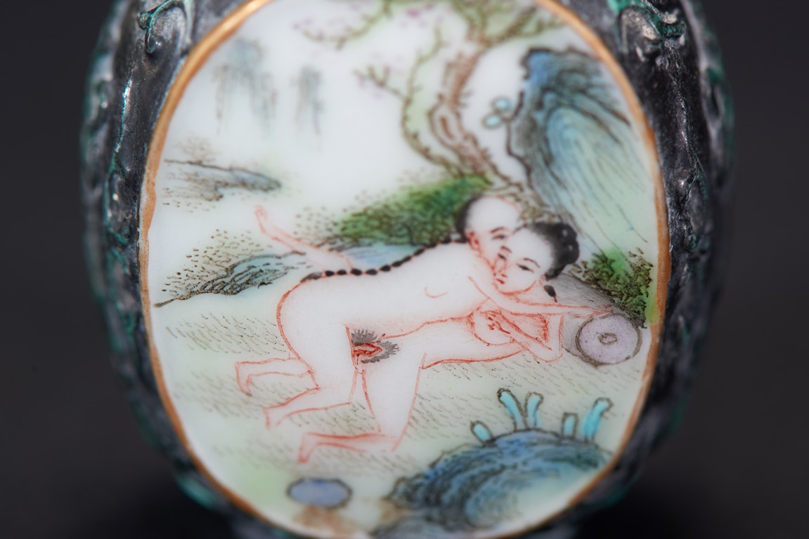 Of ovoid form, painted with erotic scene and inscription on front and reverse, glazed in black. The base bears a four character mark. Qing Dynasty period.