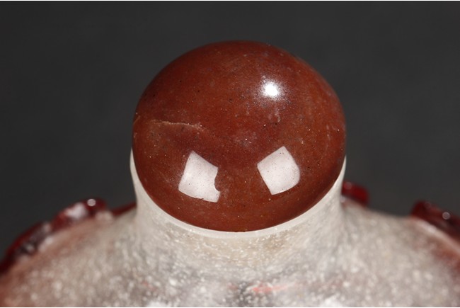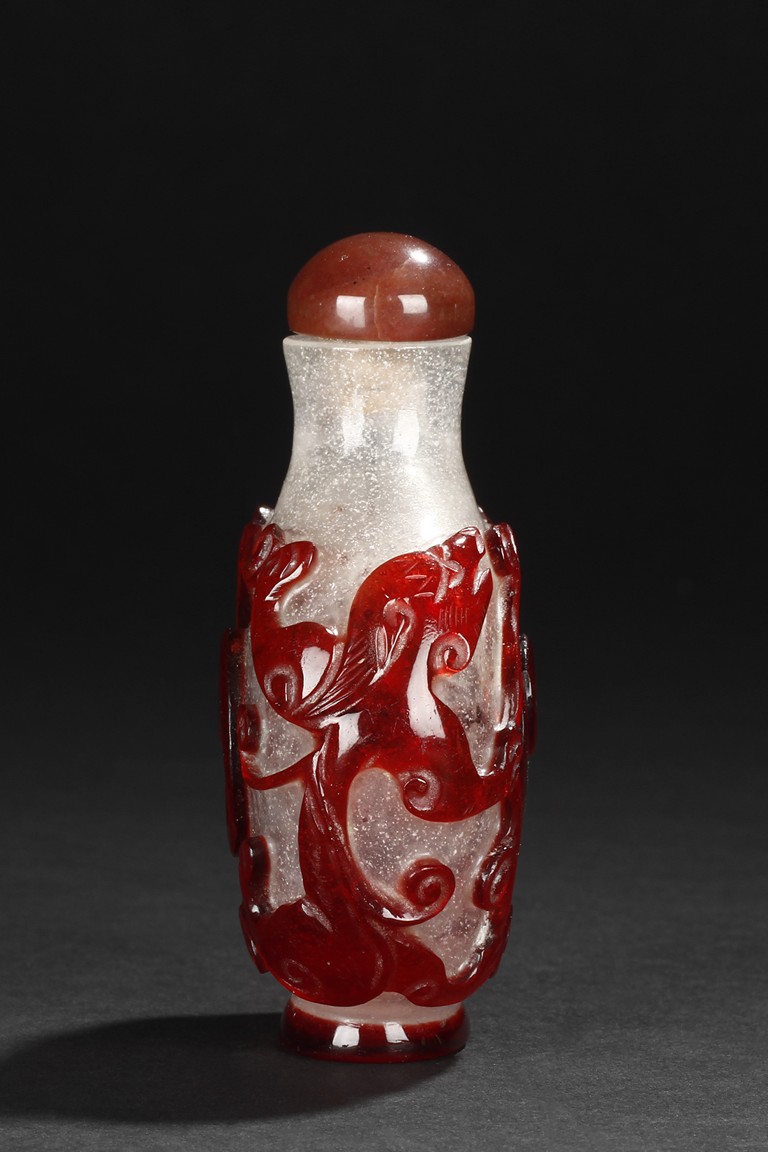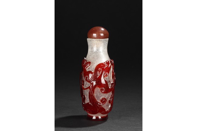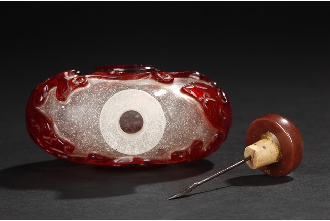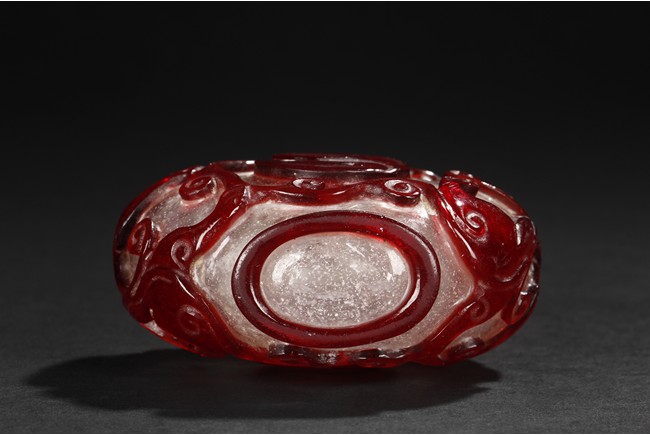 Of flattened rounded form rising from oval foot ring, it is carved through the layer of red overlay to the white glass, depicting a taiji motif. Qing Dynasty period.