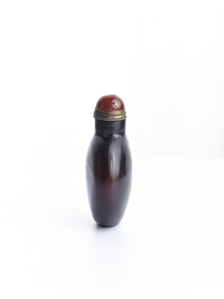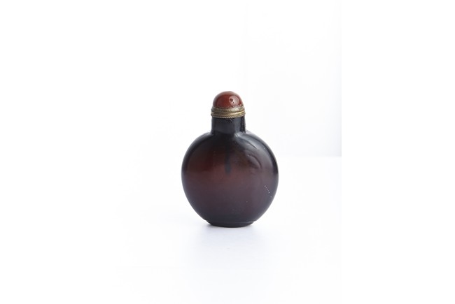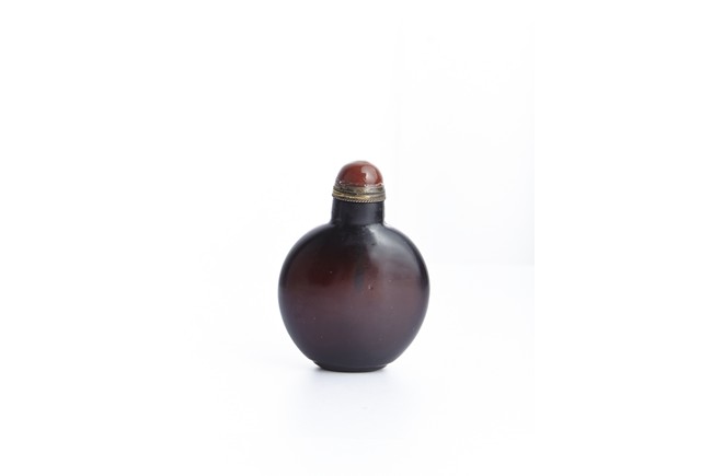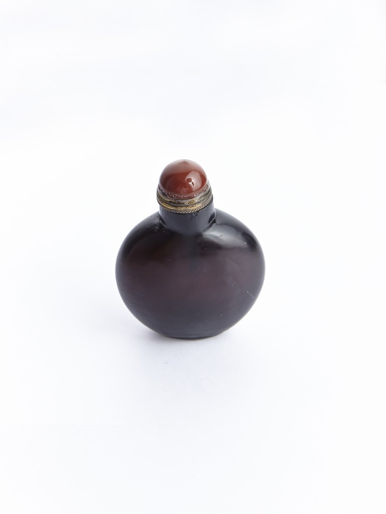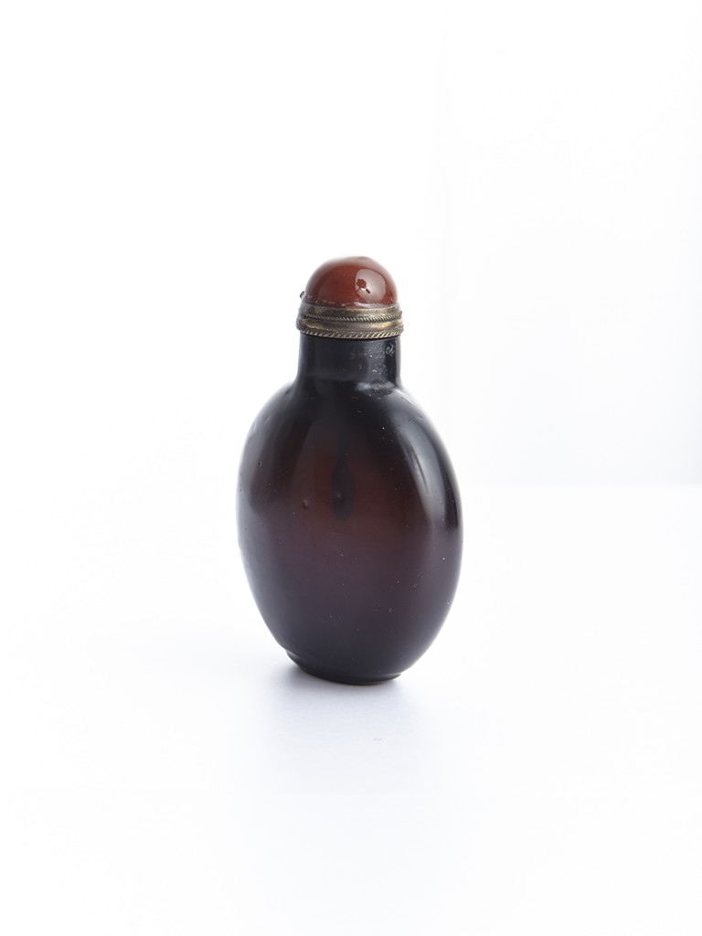Raised on ovoid foot ring, the semi-translucent dark purple glass snuff bottle is of rounded form. Qing Dynasty period.