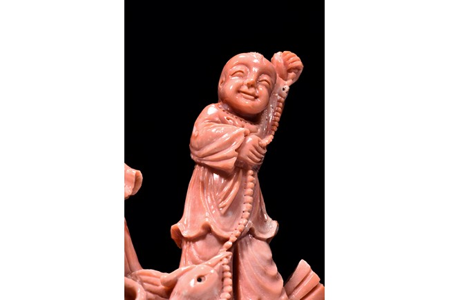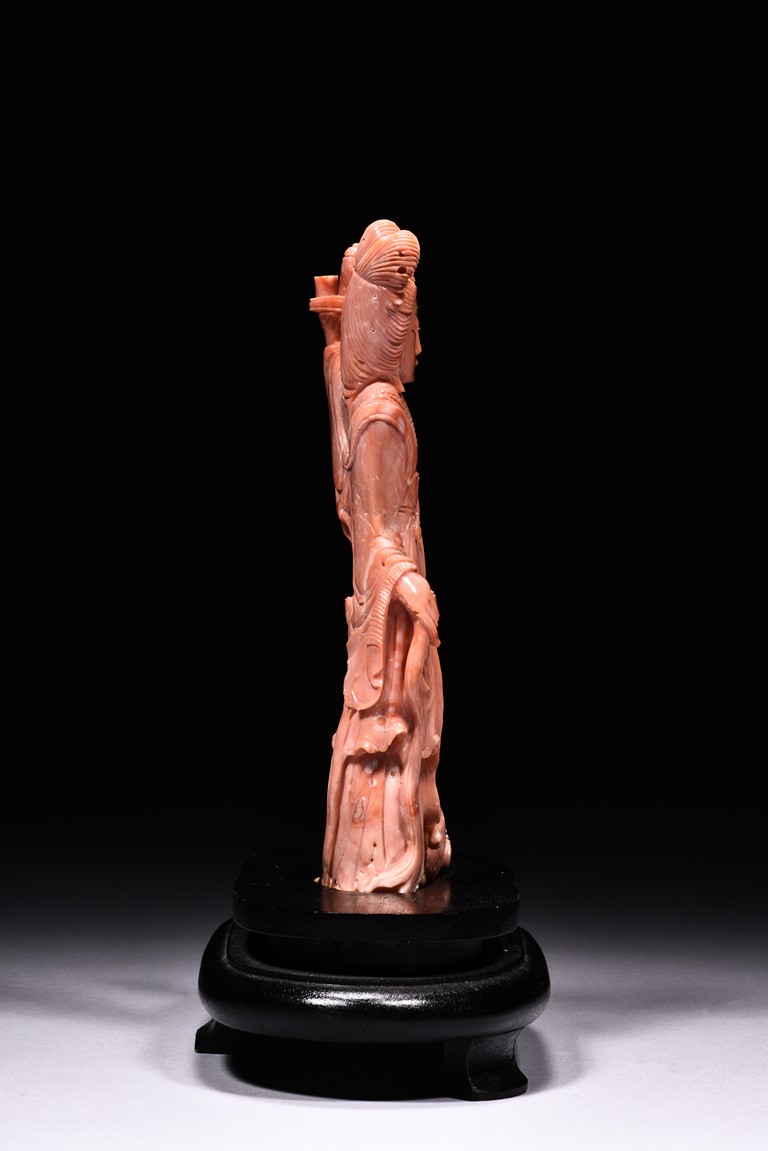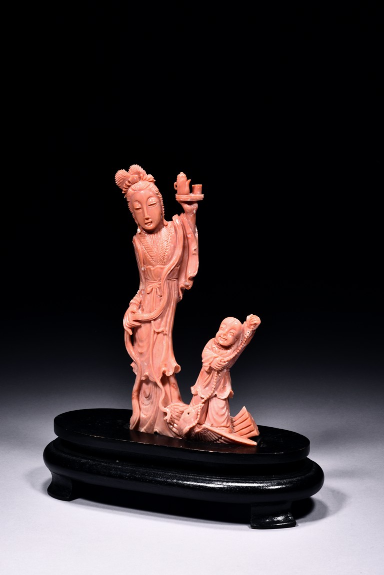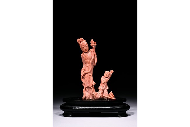 Finely carved as a female attendant with left hand raised high and holding a plate holding a teapot set, wearing long robe with folds, the right hand holding a ribbon, accompanied with a young boy standing upon a phoenix and holding a beaded string tied to its beak. Qing Dynasty period.