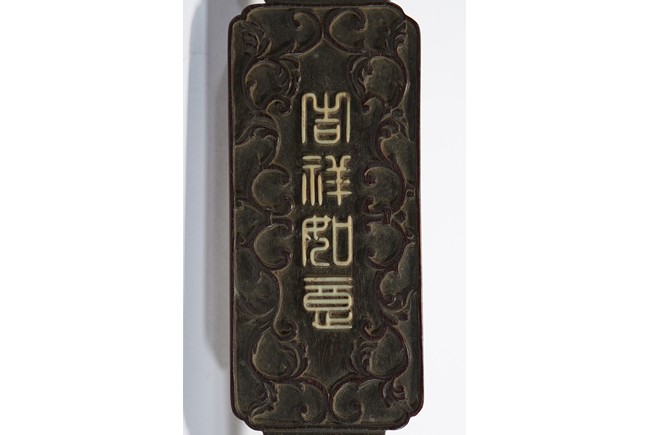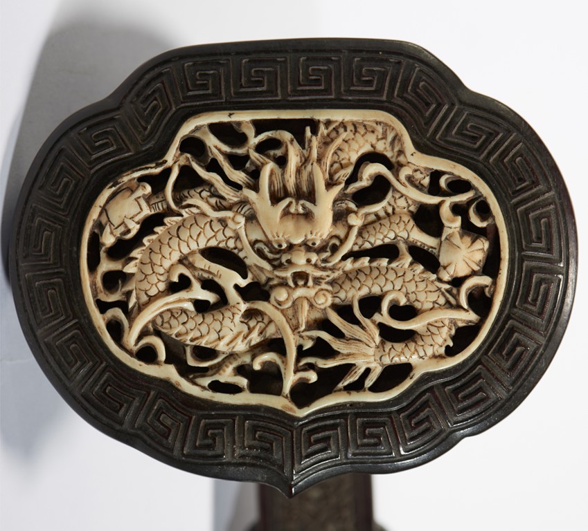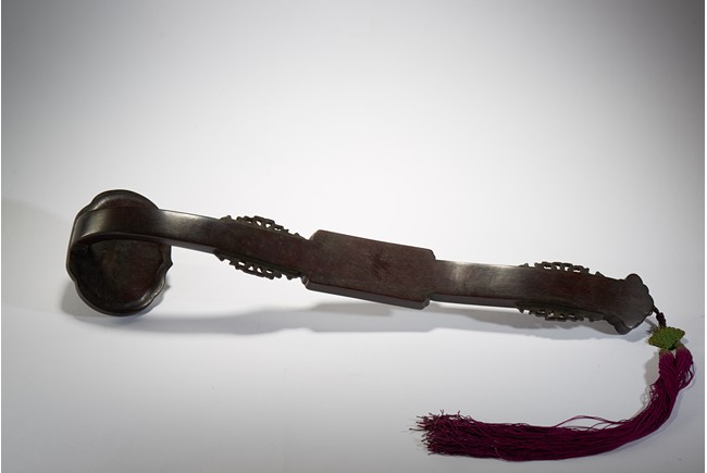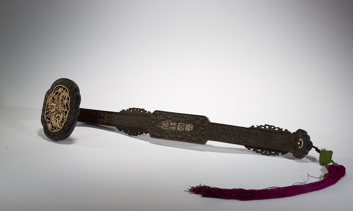 The scepter head is finely inlaid with an bone carved openwork dragon plaque enclosed by key-fret border, the handle with four stylized characters 'Ji Xiang Ru Yi' translated 'good fortunes as one wishes' enclosed by floral scrolls, the shaft further carved with floral scroll design in shallow relief. 19th Century.