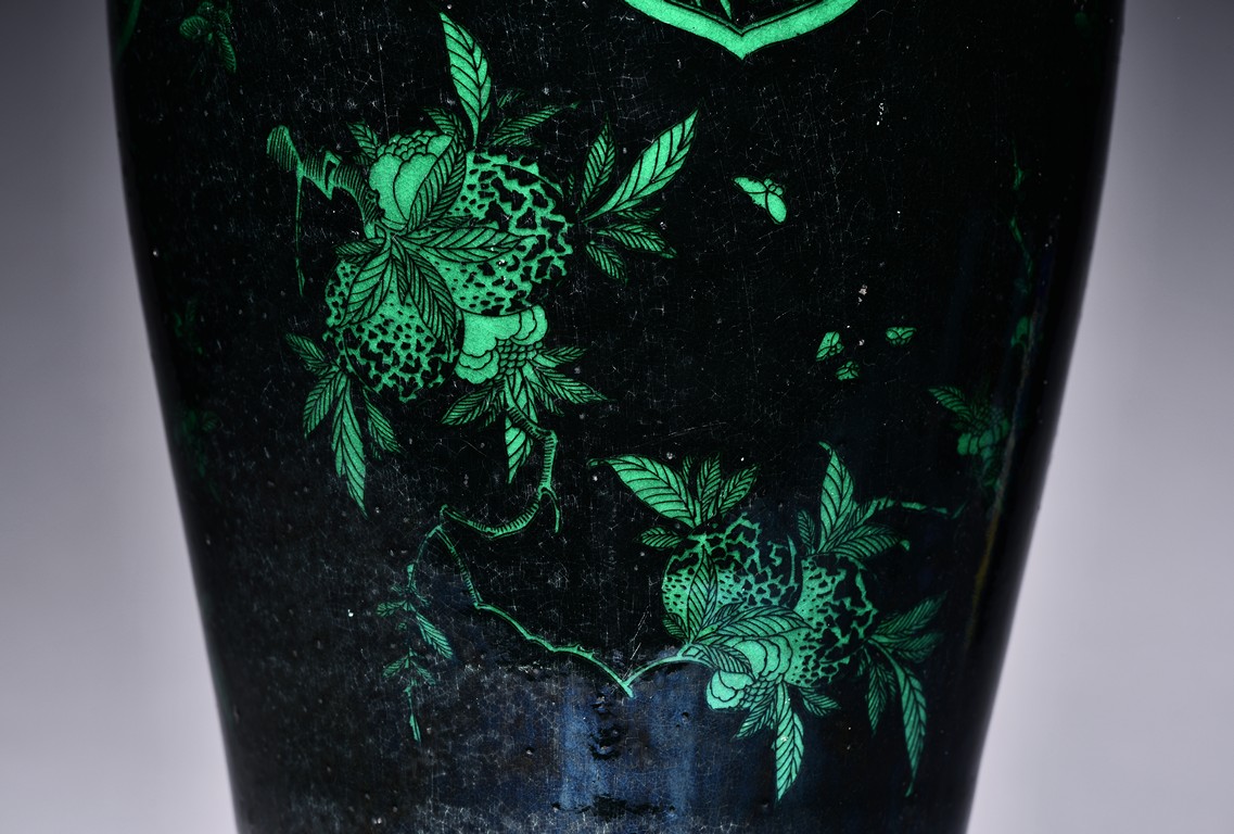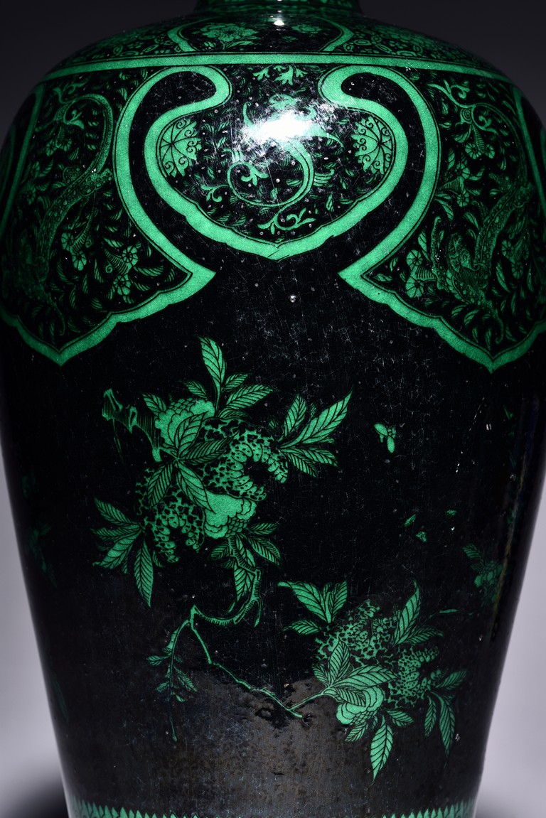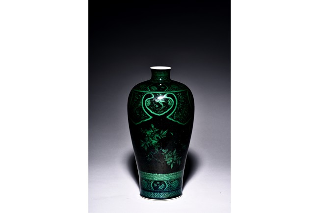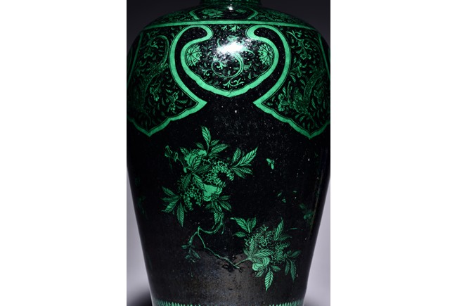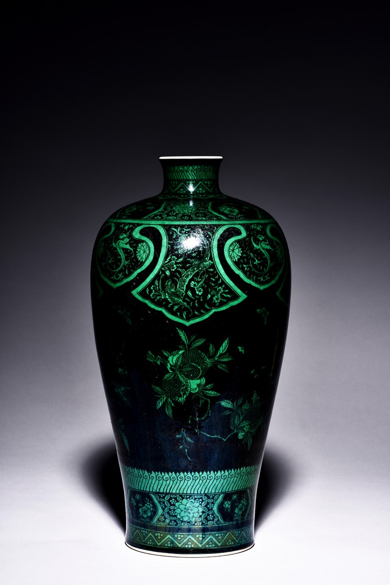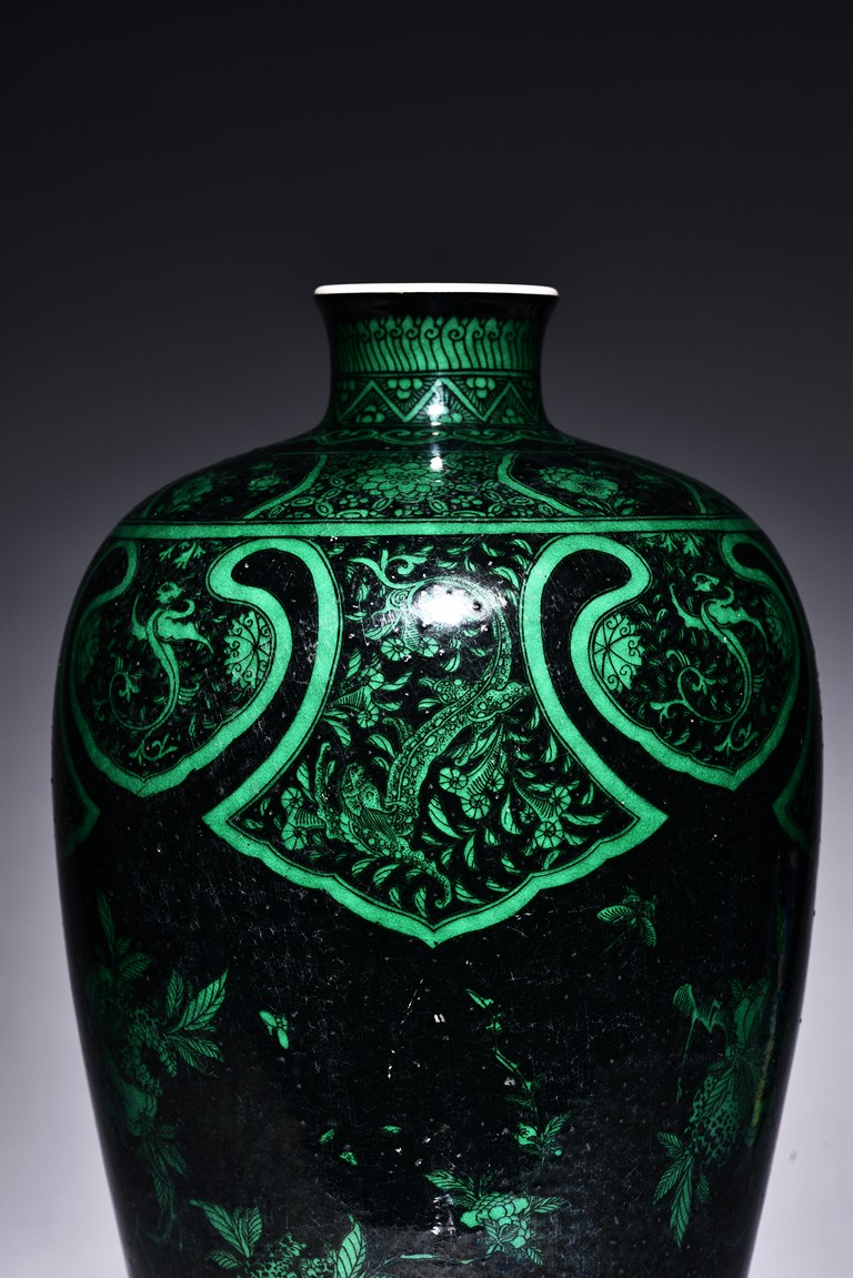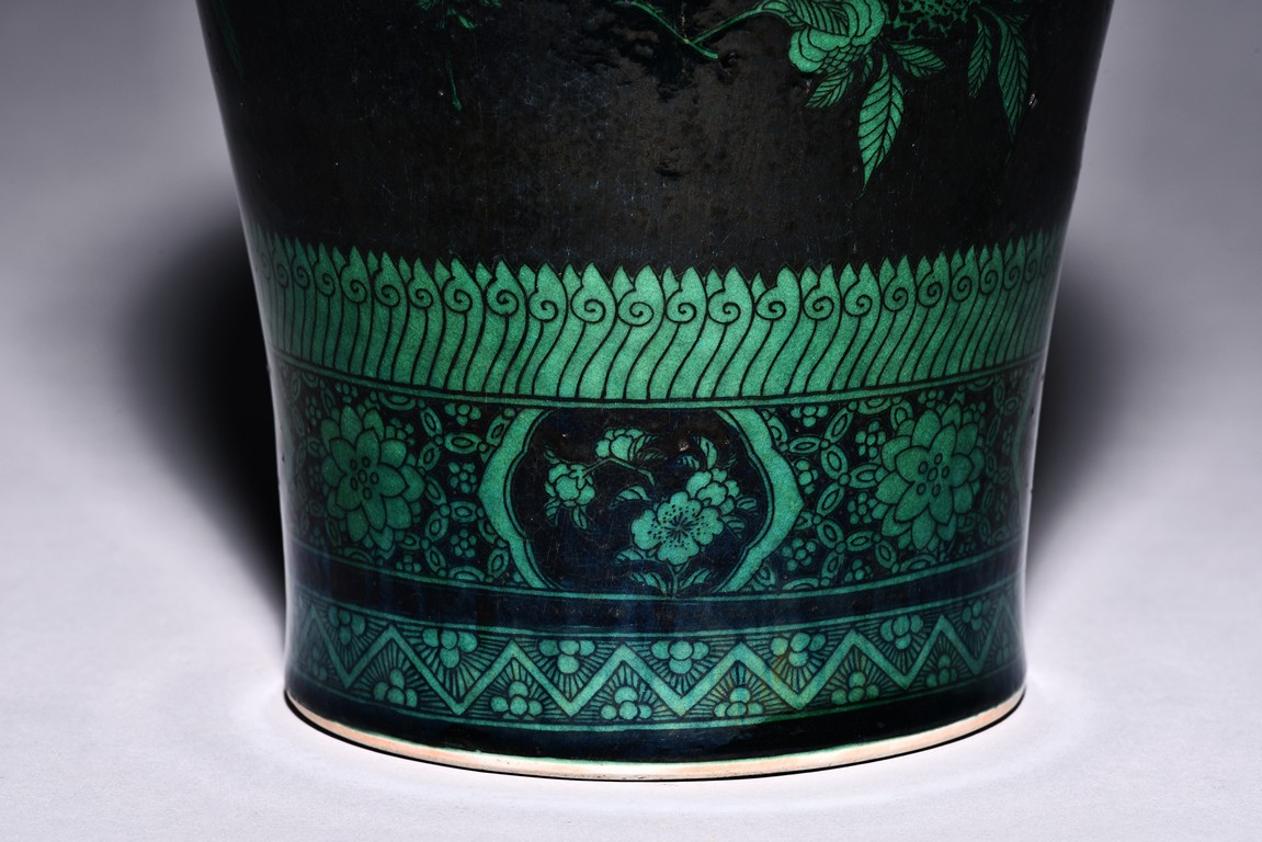 Potted with a broad shoulder and waisted neck, the vase is finely decorated in green with leafy fruit branches and sprays, flanked by alternating ruyi-shaped head band enclosing chilong and floral pattern above, and geometric bands around the base, all reserved on black ground. The bottom bears six character 'KANGXI' mark. Qing Dynasty Kangxi period.