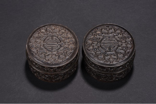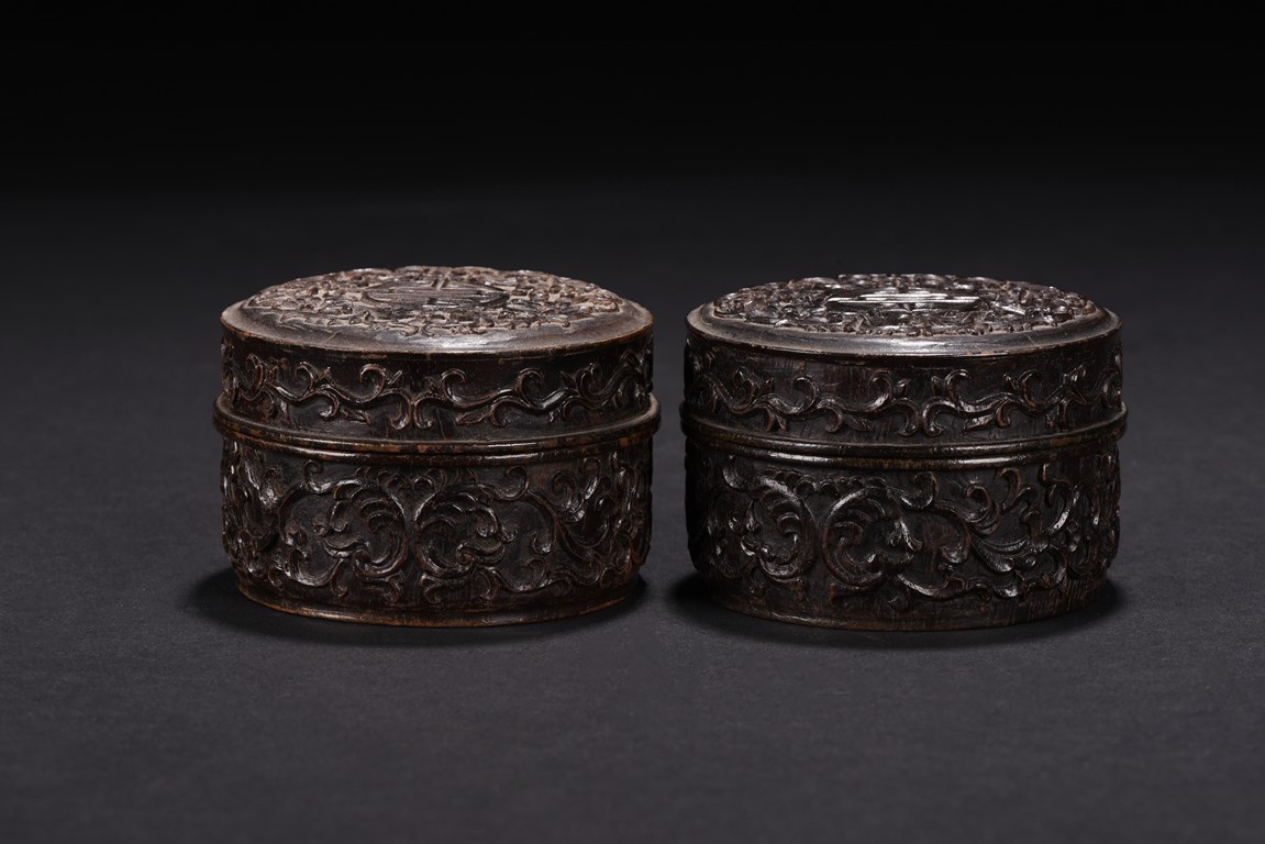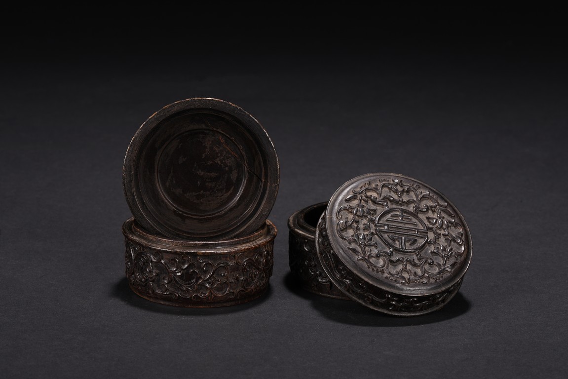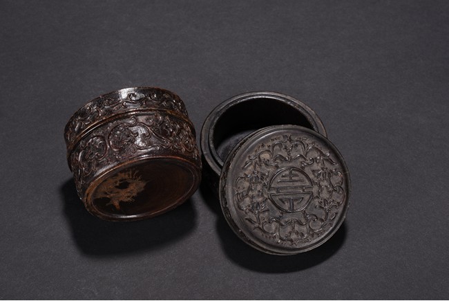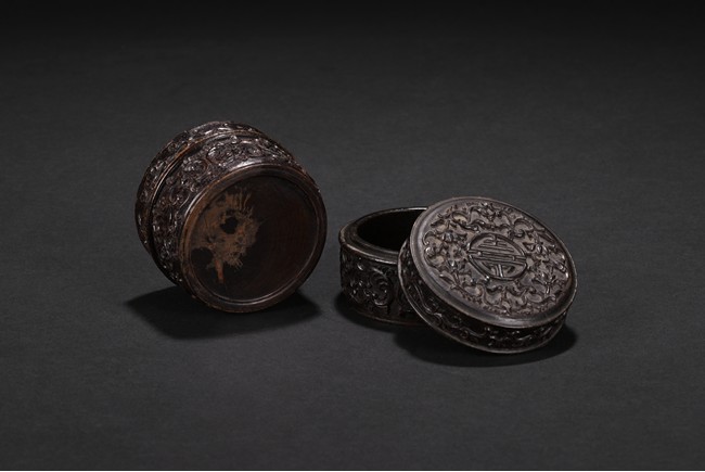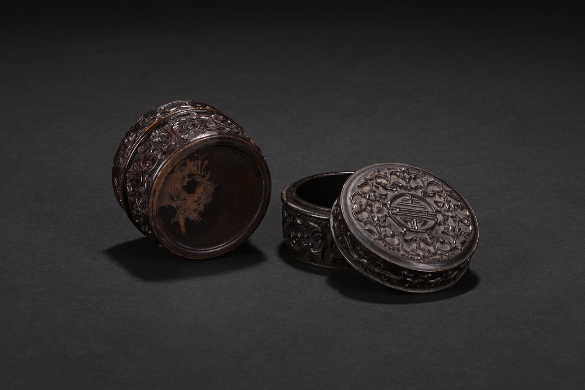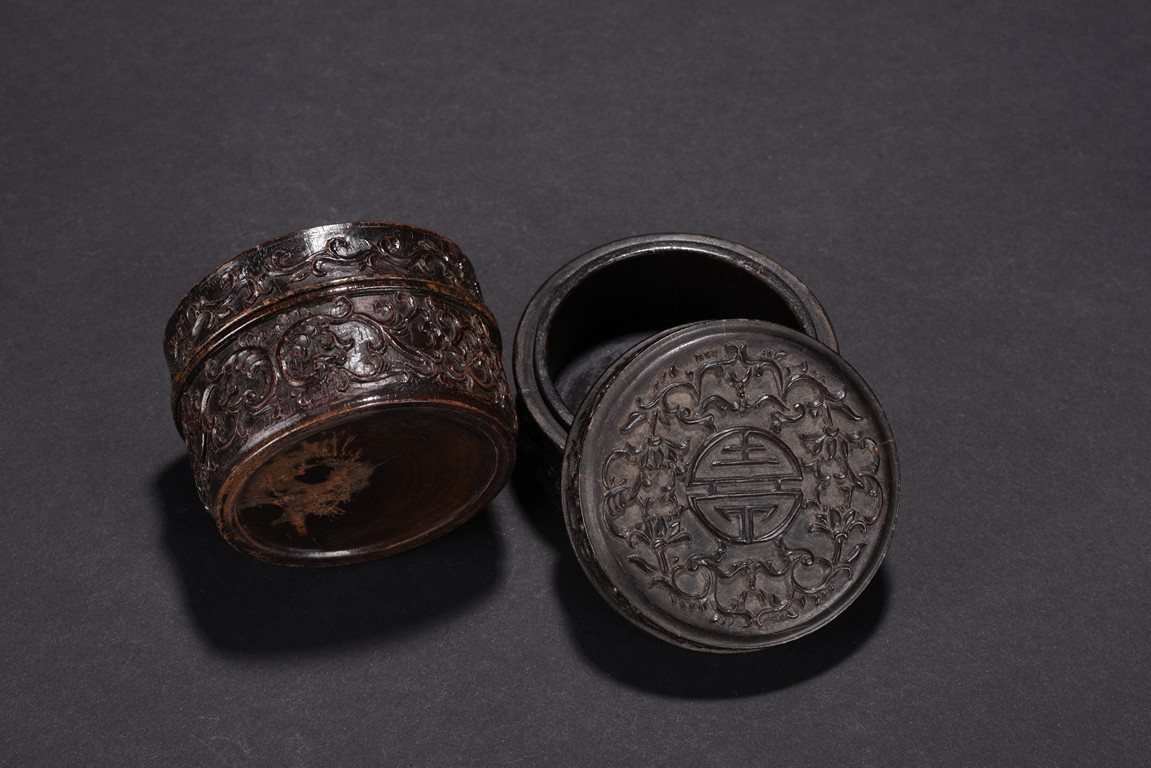 Of circular form, the box is finely carved to the exterior of cover with a stylized shou character surrounded by stylized lotus scroll, the sides with similar lotus scrolls. Republic period.