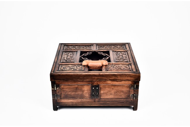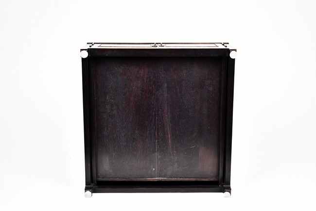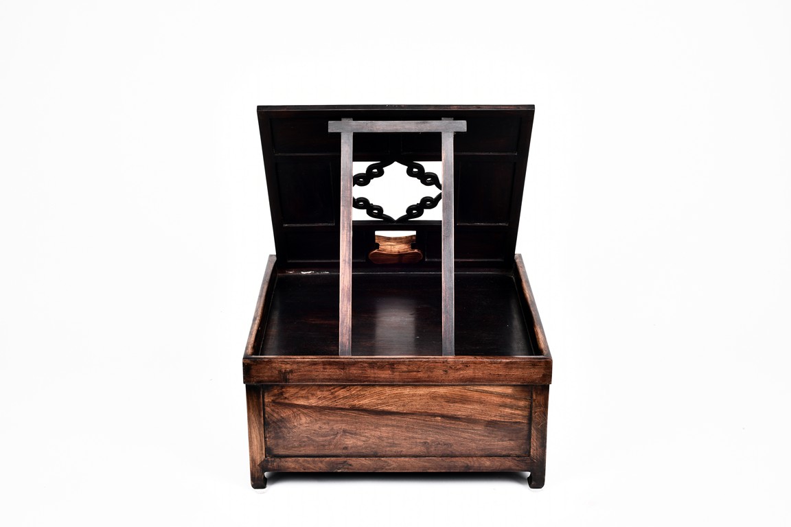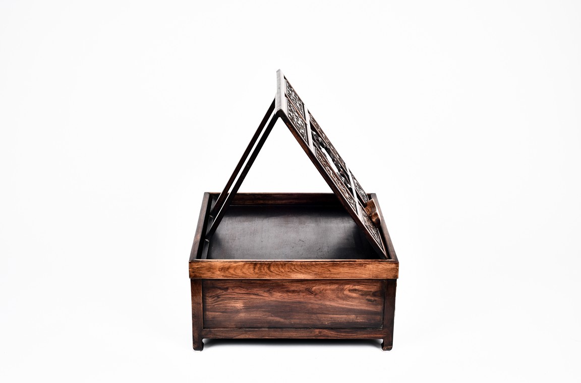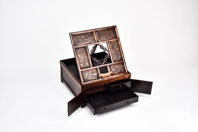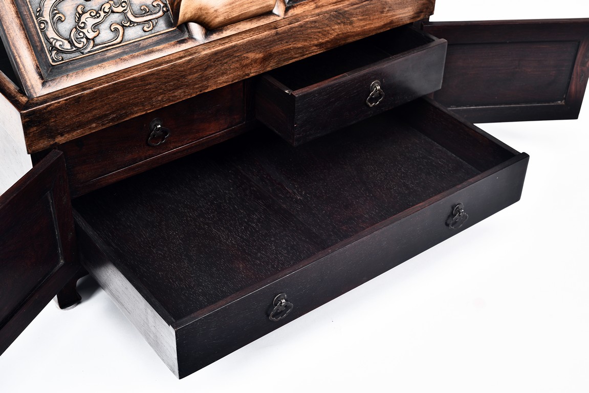 The mirror stand with a rectangular support frame enclosing six rectangular panels, each carved in relief with stylized chilong motif around a central aperture of barbed scrolled design,above a pair of well-figured panel doors fitted flush with the framework, the interior fitted with three zitan drawers, supported on legs of square section ending in hoof feet. Qing Dynasty period.