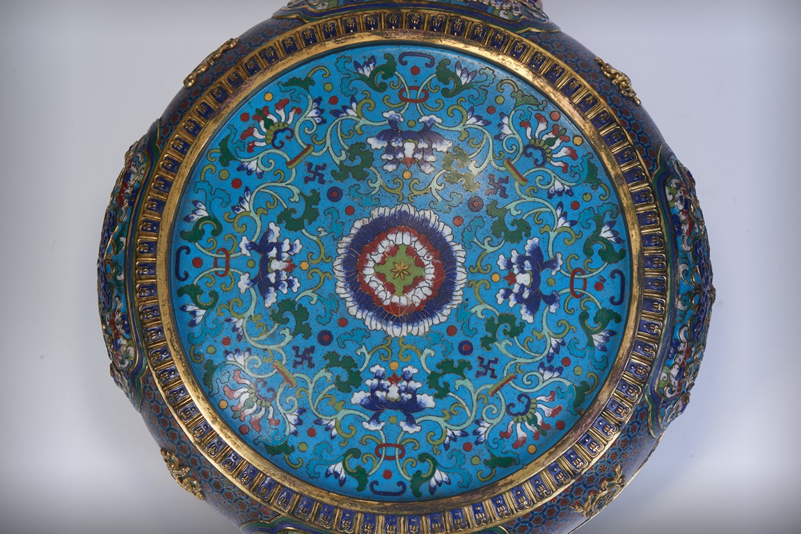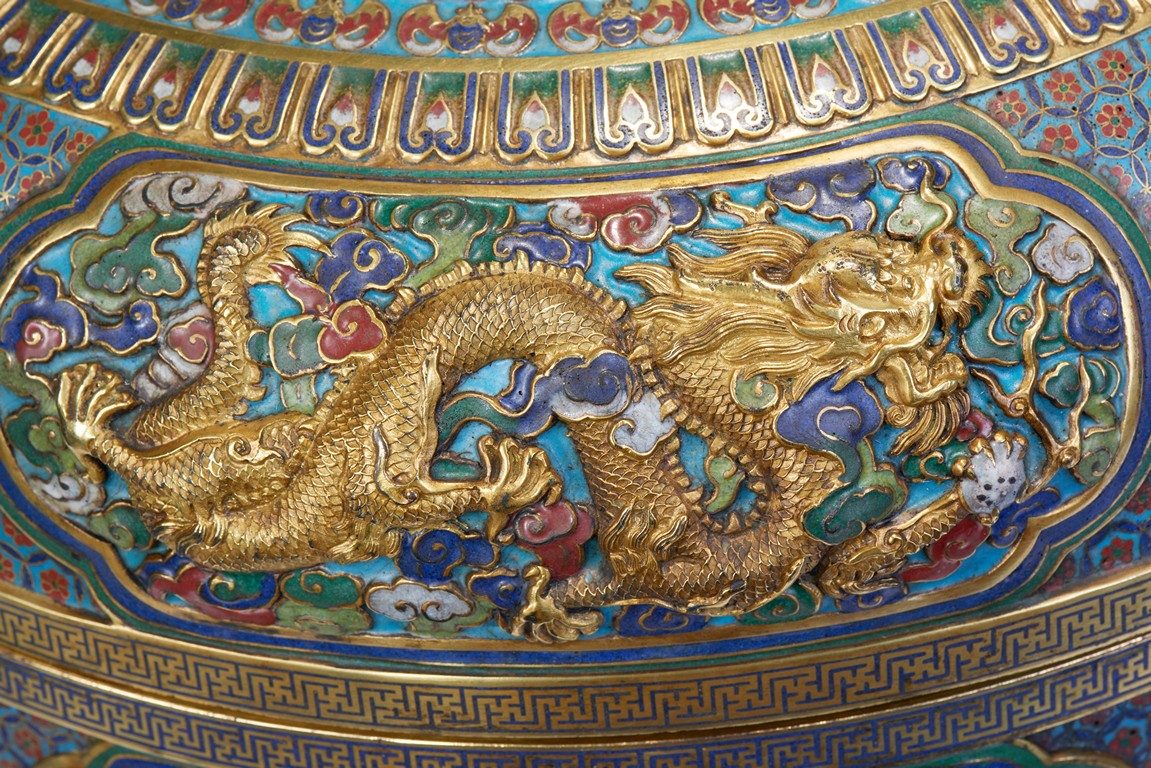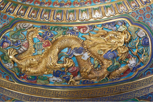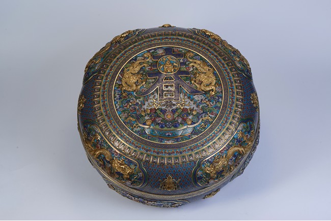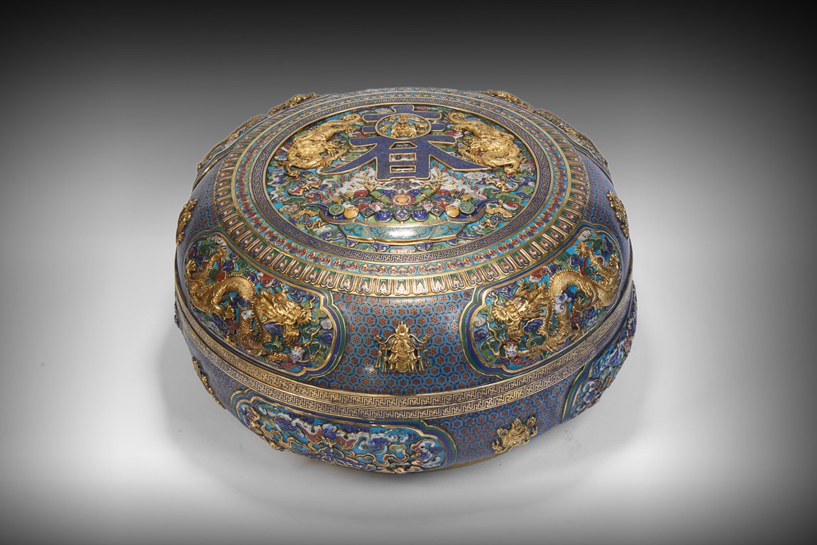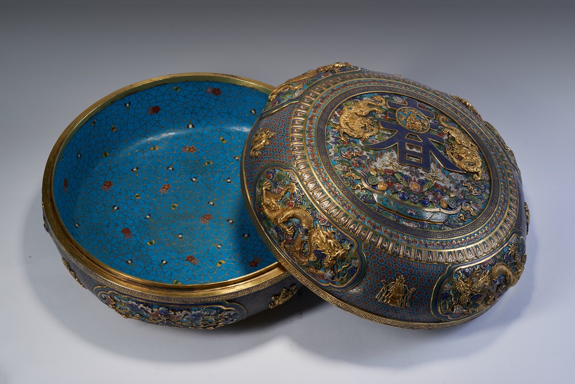 The top of the cover is decorated with shoulao holding a peach, within a roundel set against a 'Chun' character, flanked by two five-clawed dragons, above a lobed bowl filled with Eight treasures; the sides of the box divided by panels of dragons amidst auspicious clouds, alternating with buddhist emblem, all brightly enamelled in colors of turquoise, red, iron-red, and green.