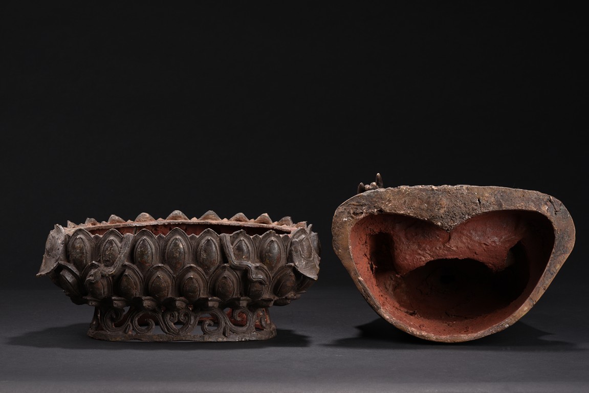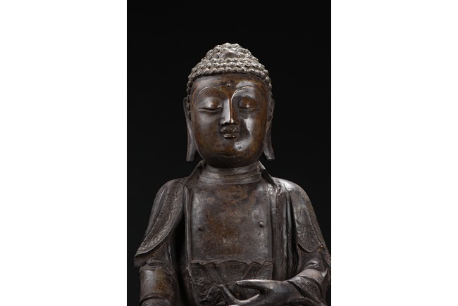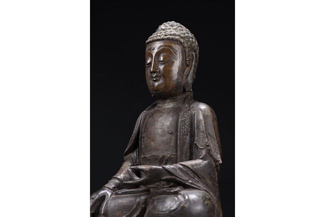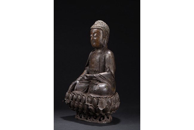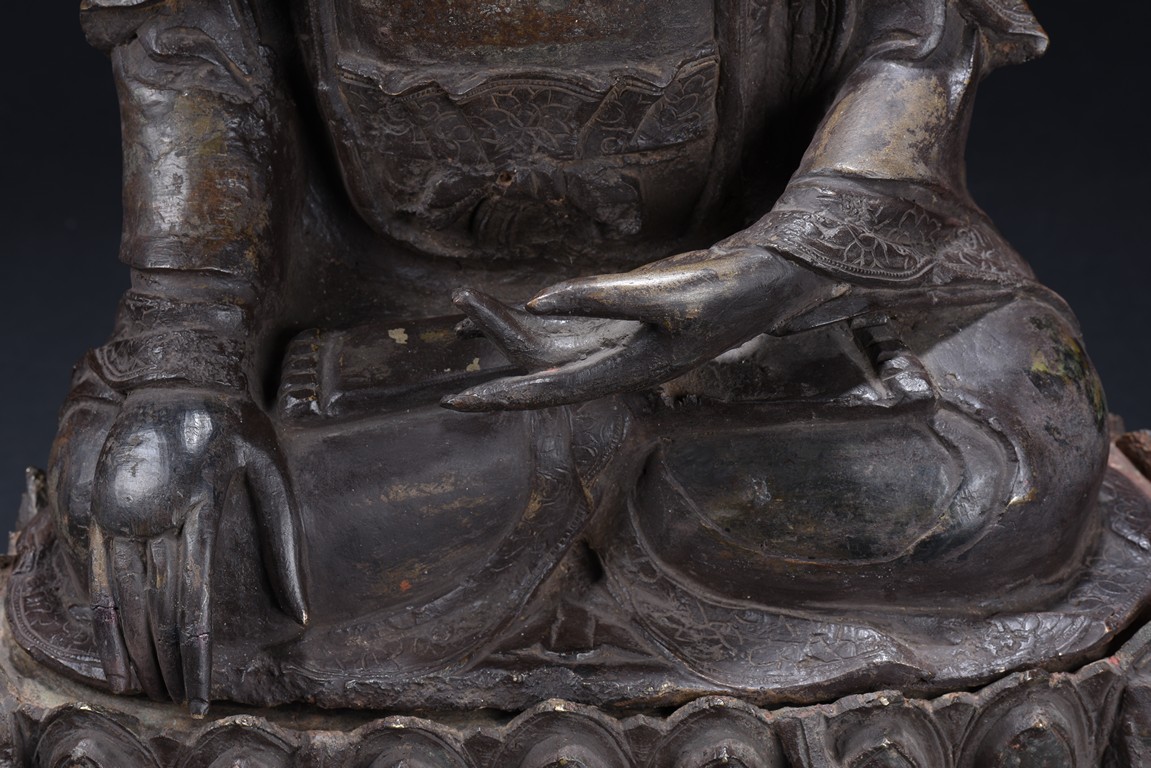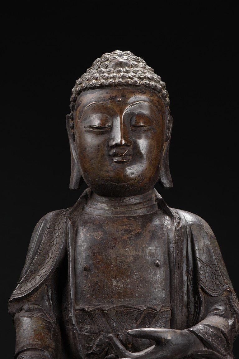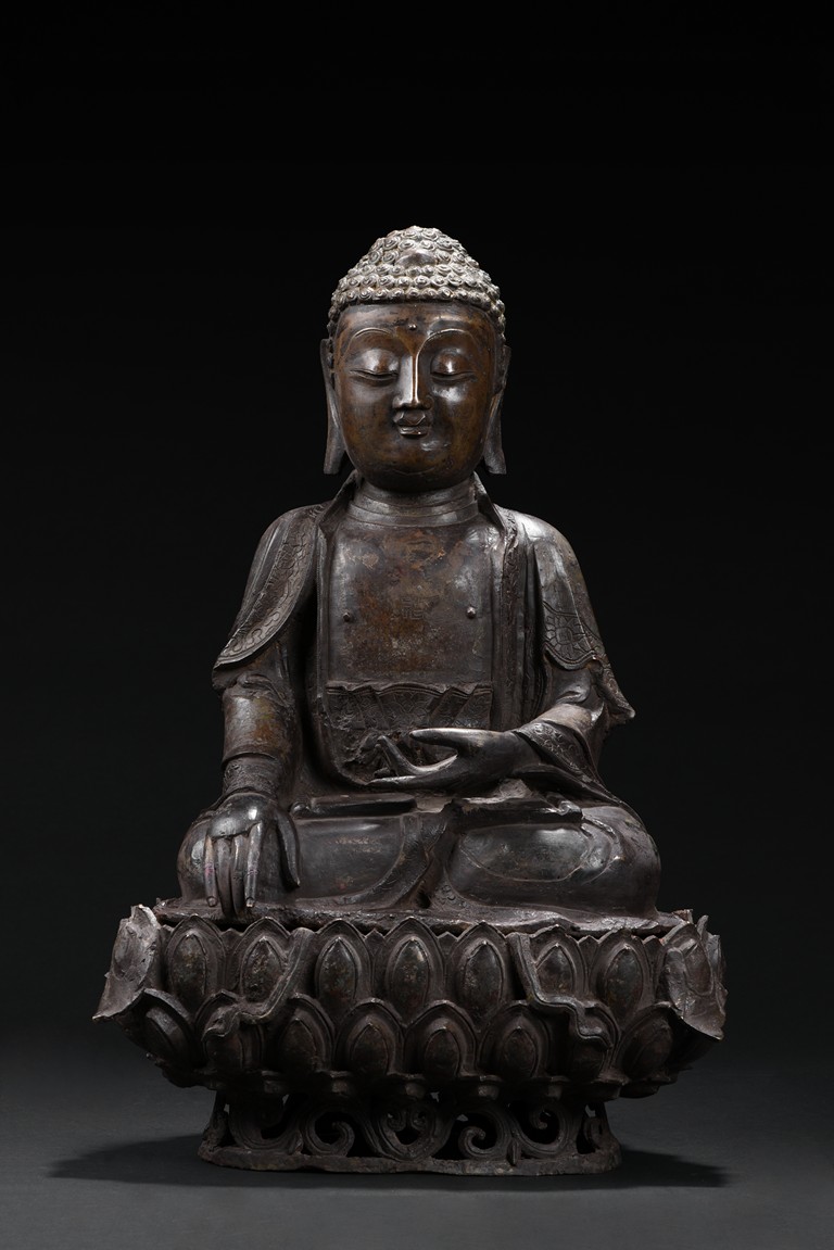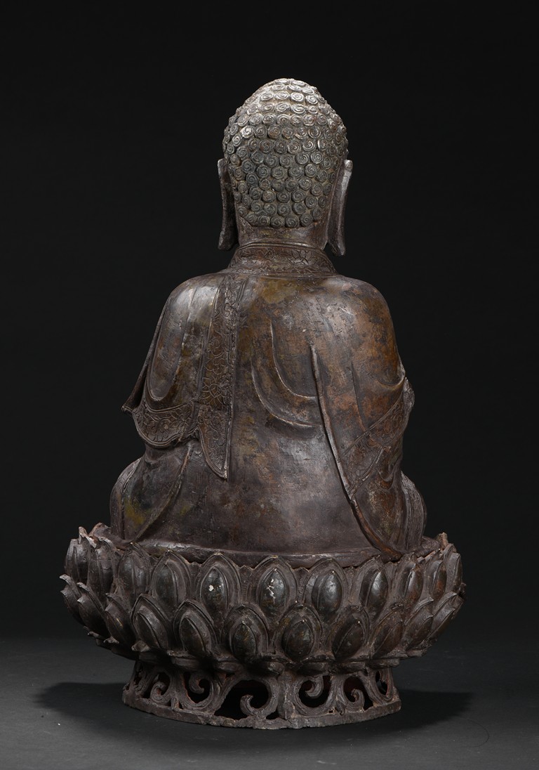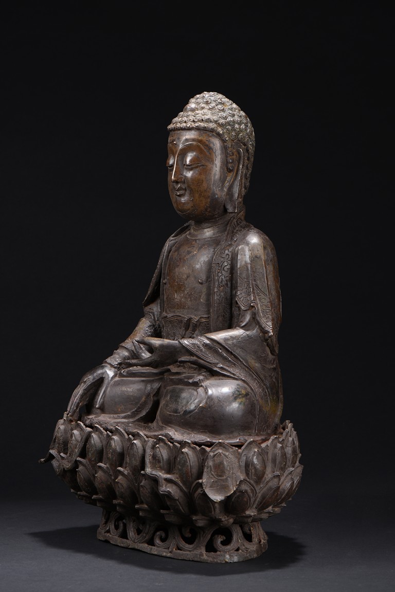 Heavily cast, the bodhisattva is shown seated upon a lotus petal throne, his hands in bhumisparshamudra, wearing long robe incised on borders with floral scrolls, opened at the chest to reveal an incised wan character, the face with a serene expression, flanked by two pendulous ears, his coiffure of small curls covering his head. Ming Dynasty period.