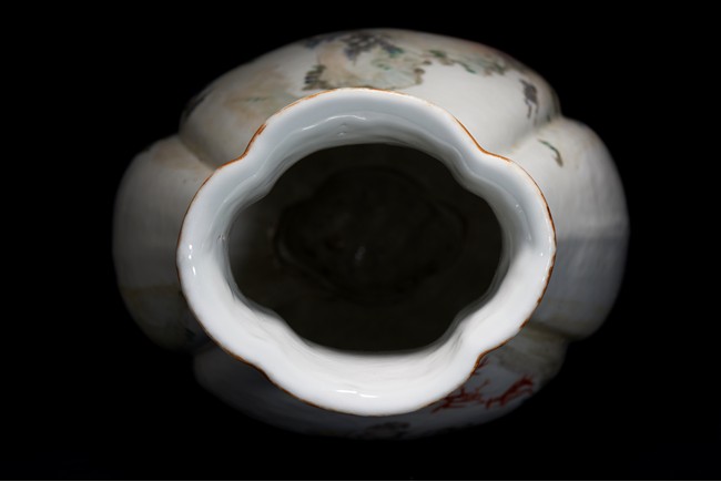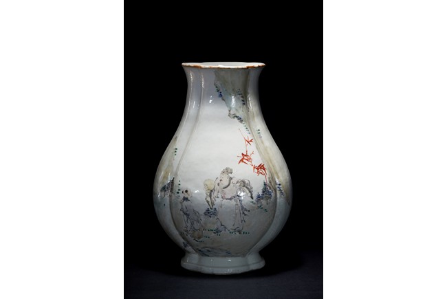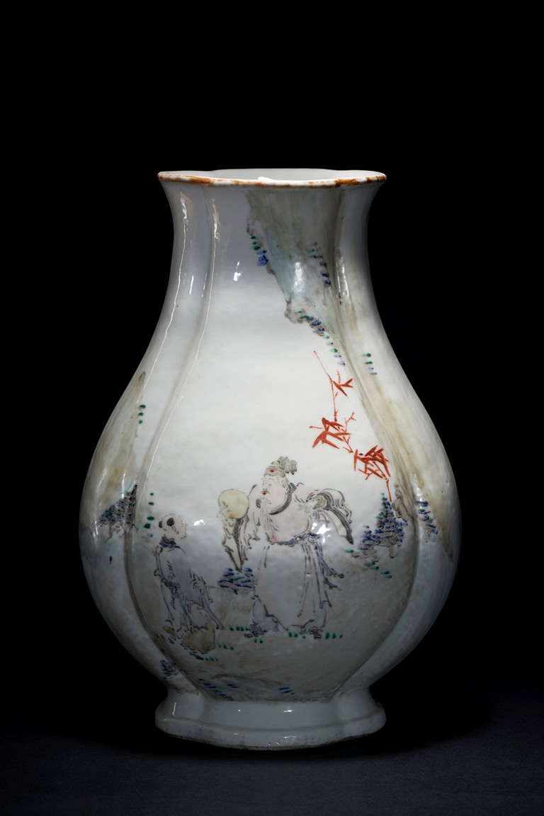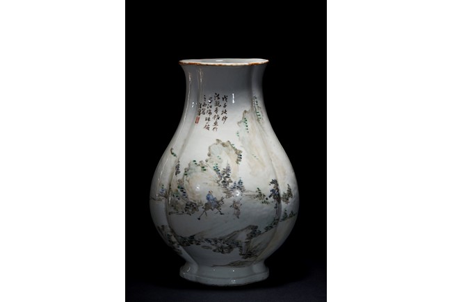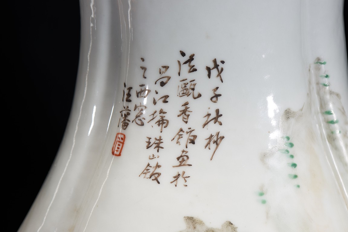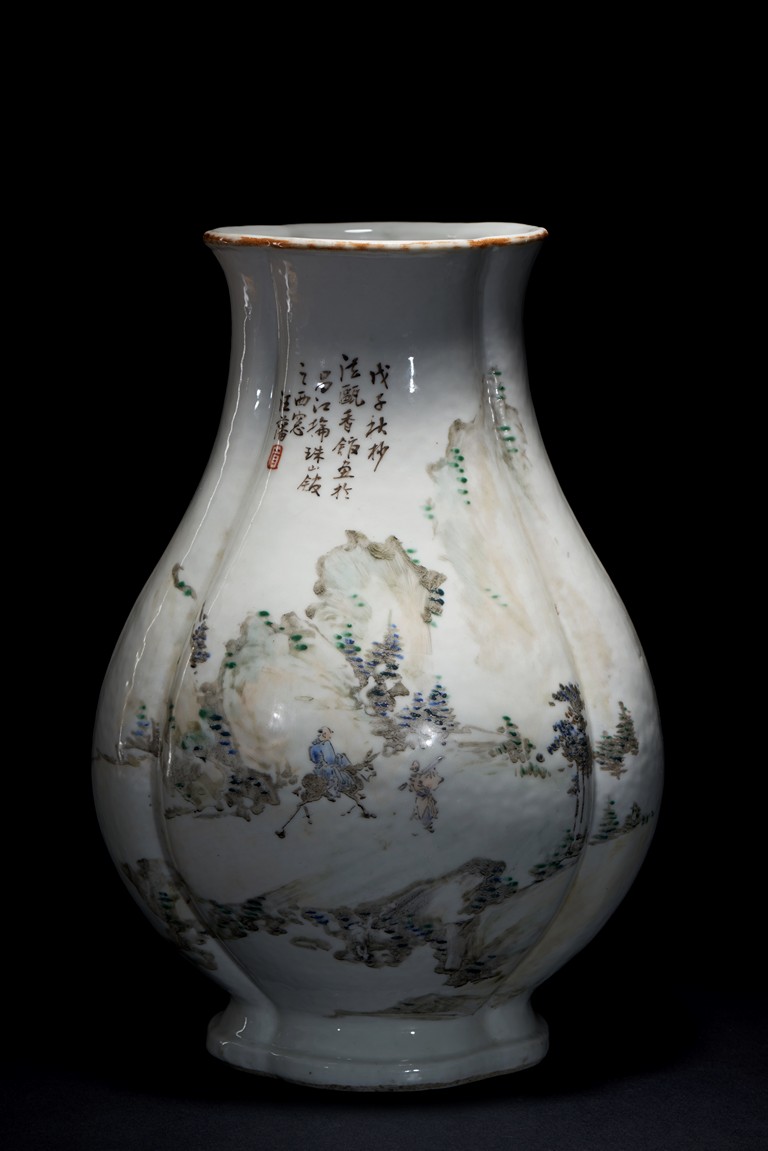 The four-sided body rising from a short spreading foot to a waisted neck, painted to the front face with a deep mountain landscape, and to the other with an elderly scholar and an attendant conversing within a mountainous setting, the neck bears inscription, signature Wang Fan, and a seal mark. The base with four character 'Lun Zhu Shan Guan'. Late Qing Dynasty period.