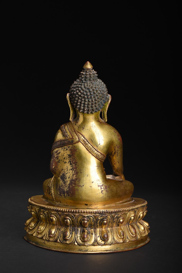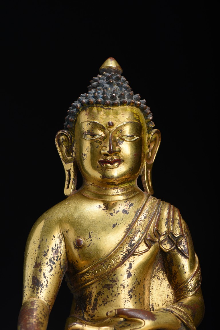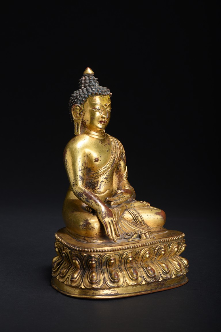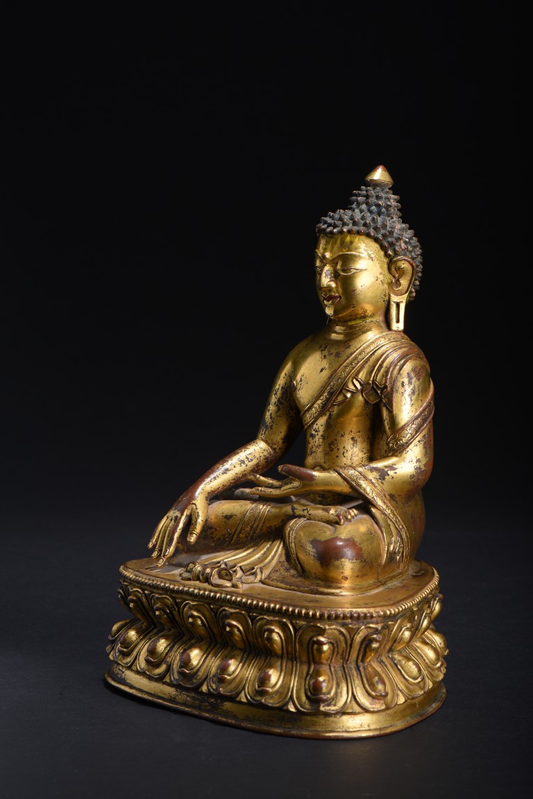 此尊佛祖全跏趺坐於雙層仰覆蓮花寶座之上。左手在臍前結禪定印,右手在右膝施觸地印。肉髻高聳,寶珠頂嚴。面型卵圓,彎眉細目,雙眼俯視,面露微笑,表情靜謐,工藝精湛。身著坦右肩袈裟,束腰仰覆蓮式台座,蓮瓣寬厚盈潤,排列規整,鎏金厚實,十分難得。來源:加州聖地亞哥藏提供