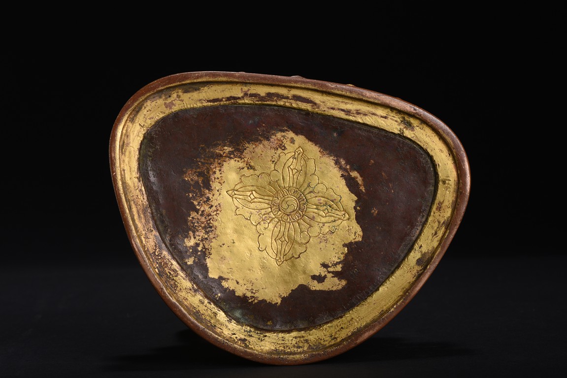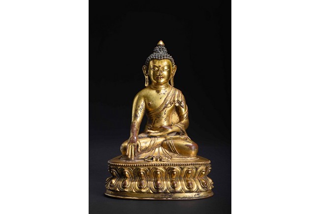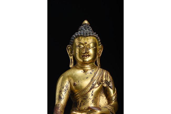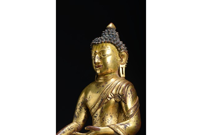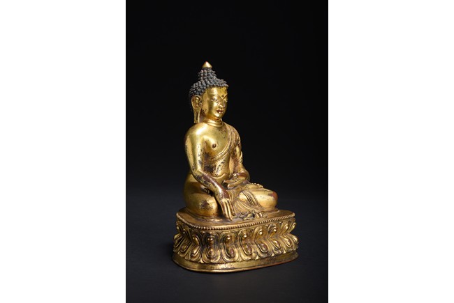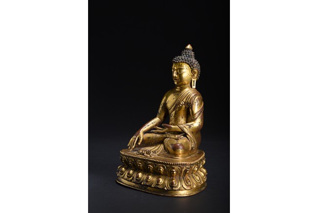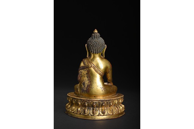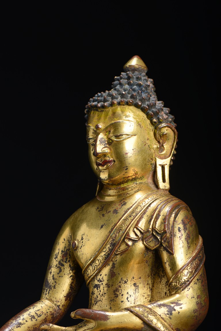 此尊佛祖全跏趺坐於雙層仰覆蓮花寶座之上。左手在臍前結禪定印,右手在右膝施觸地印。肉髻高聳,寶珠頂嚴。面型卵圓,彎眉細目,雙眼俯視,面露微笑,表情靜謐,工藝精湛。身著坦右肩袈裟,束腰仰覆蓮式台座,蓮瓣寬厚盈潤,排列規整,鎏金厚實,十分難得。來源:加州聖地亞哥藏提供