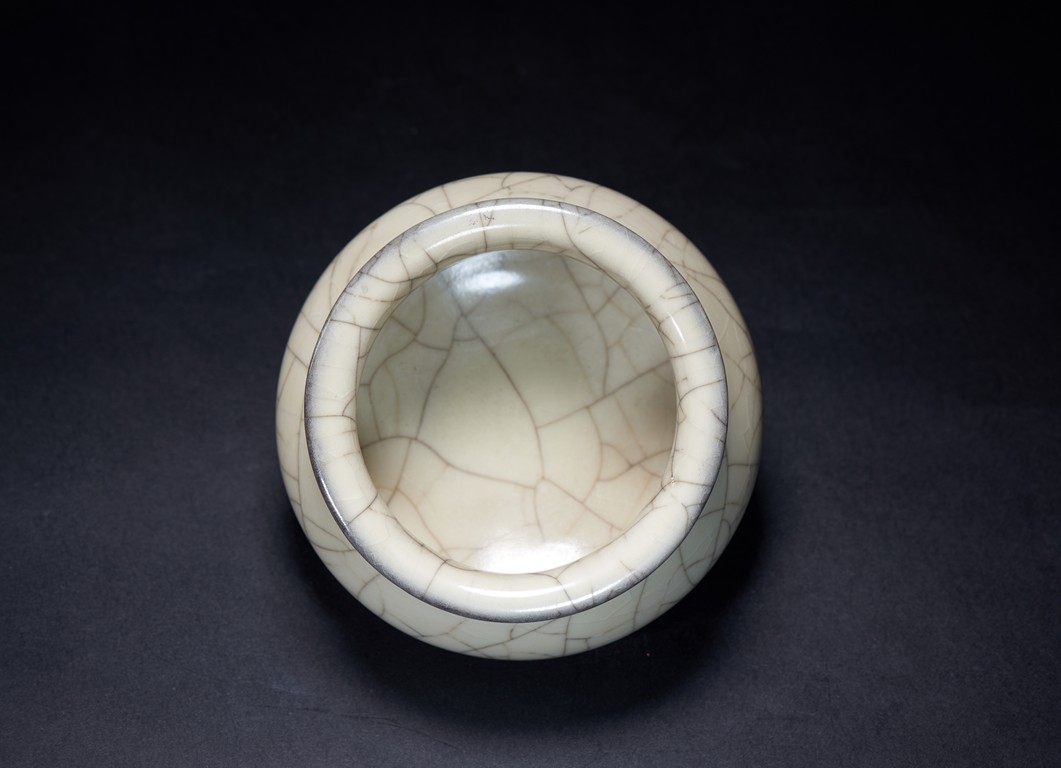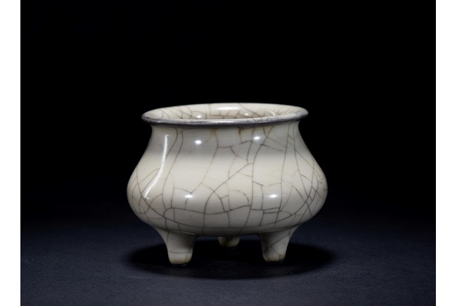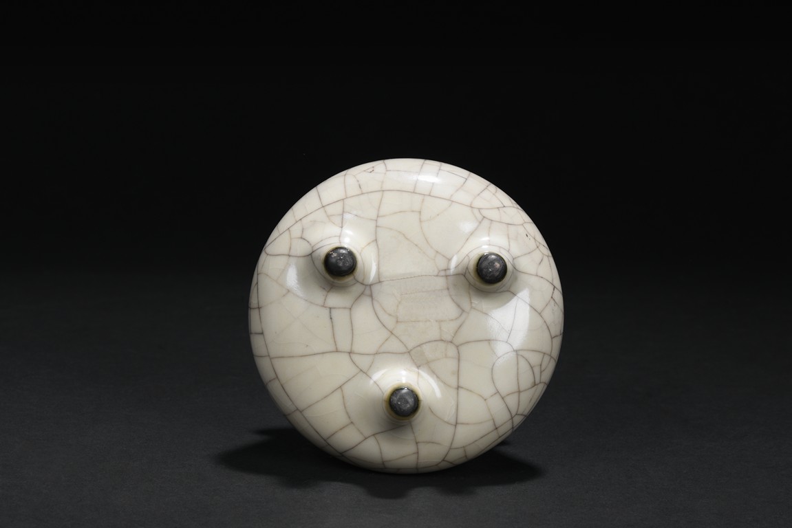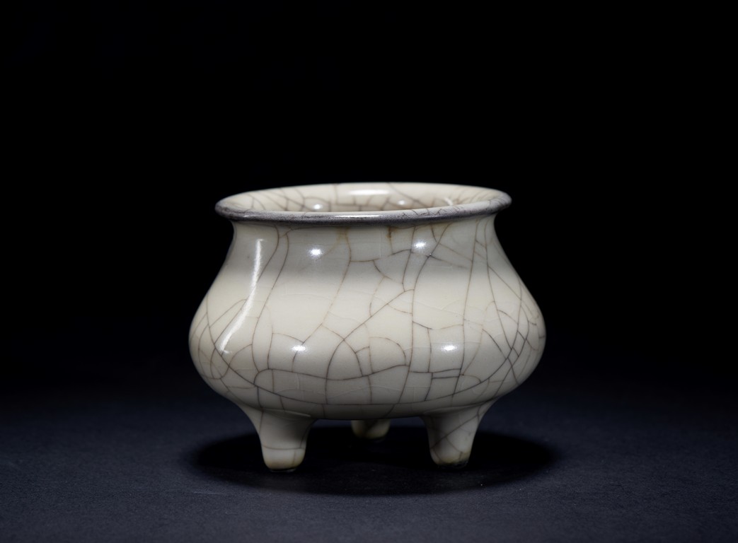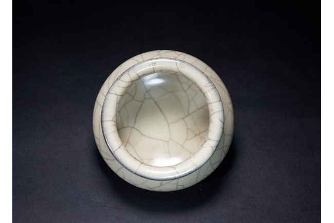 Raised on three stub feet, the body of compressed globular form and rising to flared rim, overall covered with attractive bone white glaze suffused with networks of white and brown crackles. Mid Qing Dynasty period.