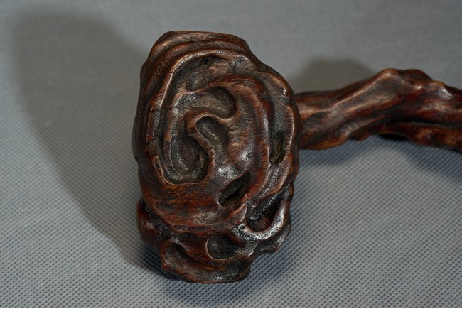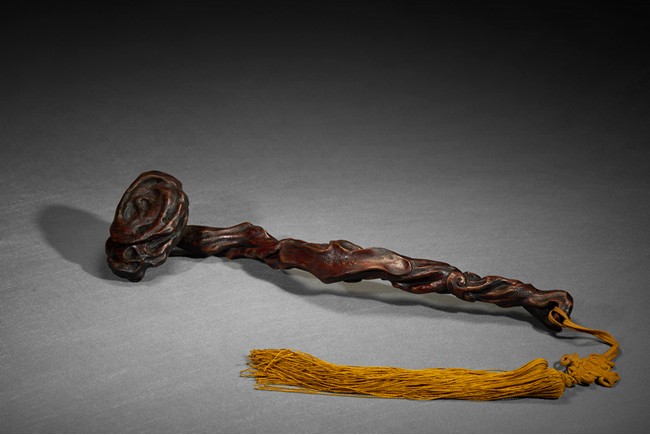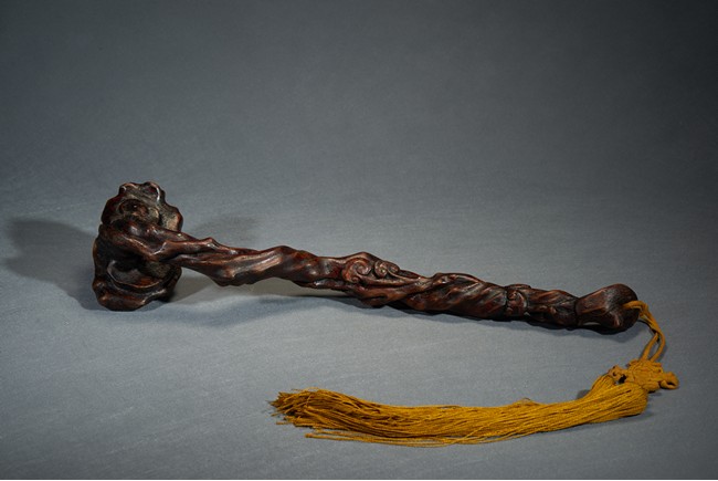 The ruyi scepter is carved with gnarled branch as shaft, the head in the form of lingzhi head. Qing Dynasty period.