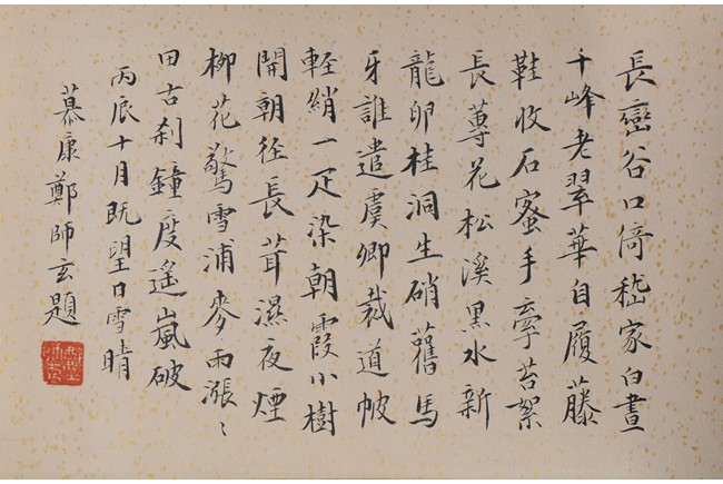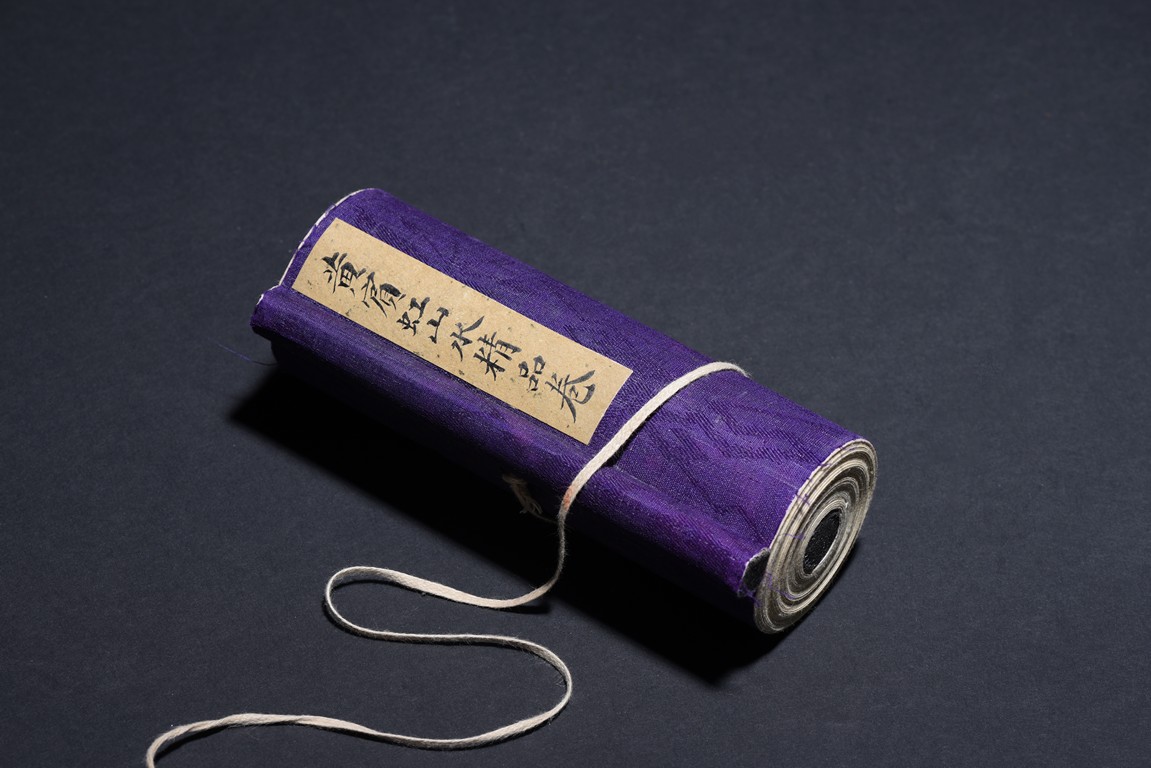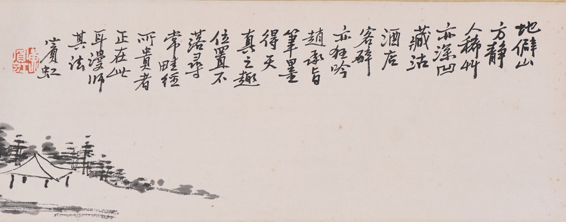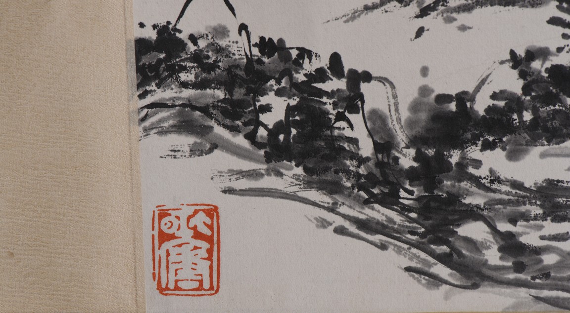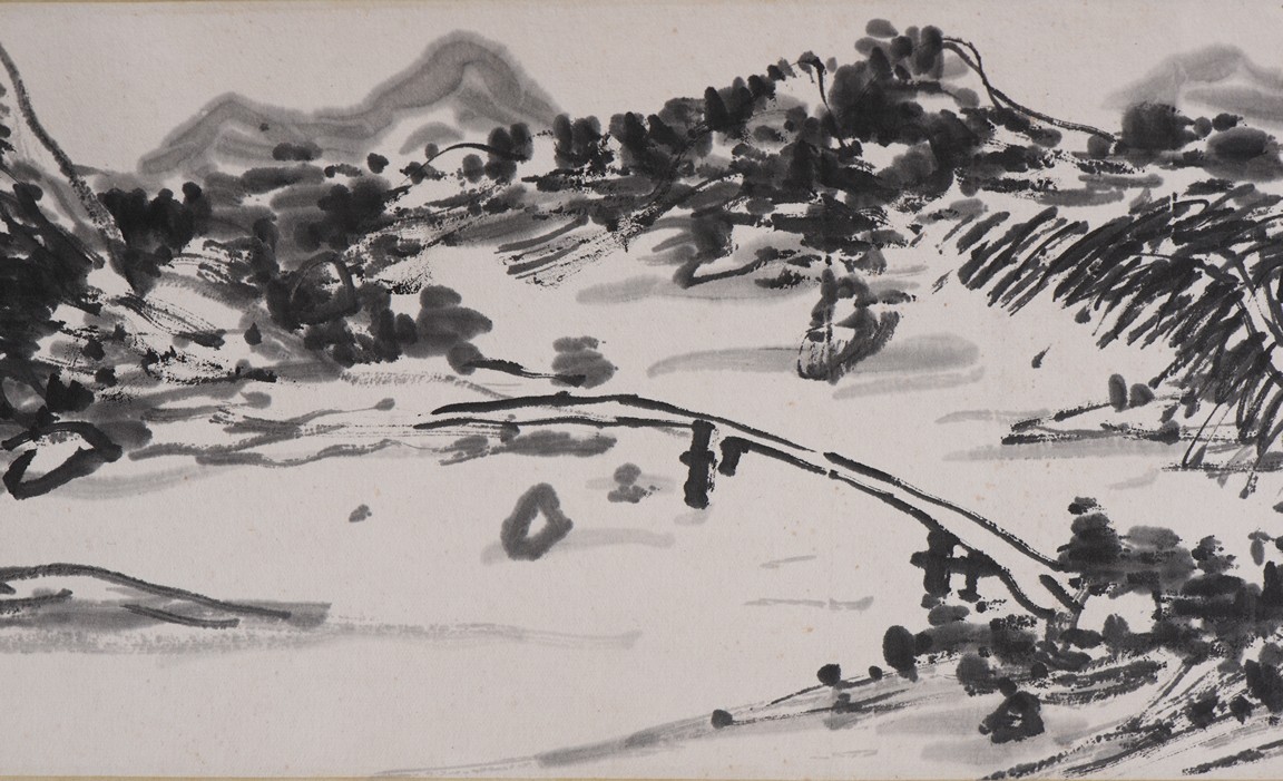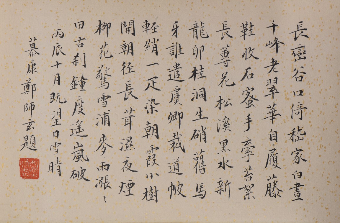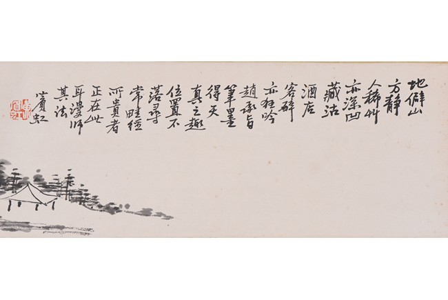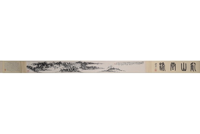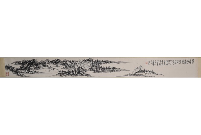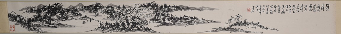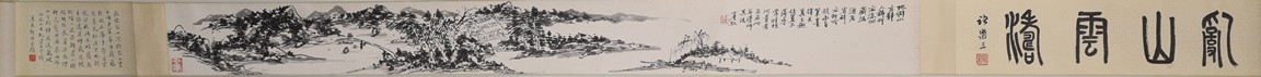 Ink on paper. Handscroll. Landscape. Inscribed and signed, with two seals of the artist. Frontispiece titled by Zhu Lesan. Colophon signed by Zheng Shixuan with one seal.