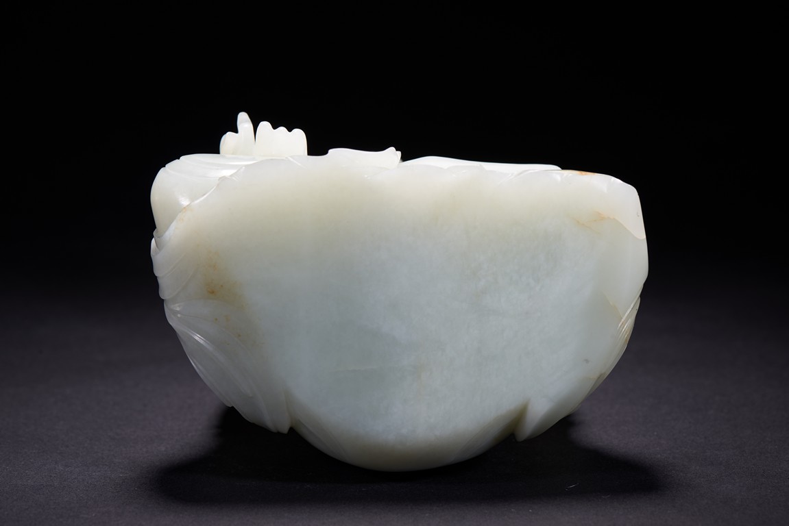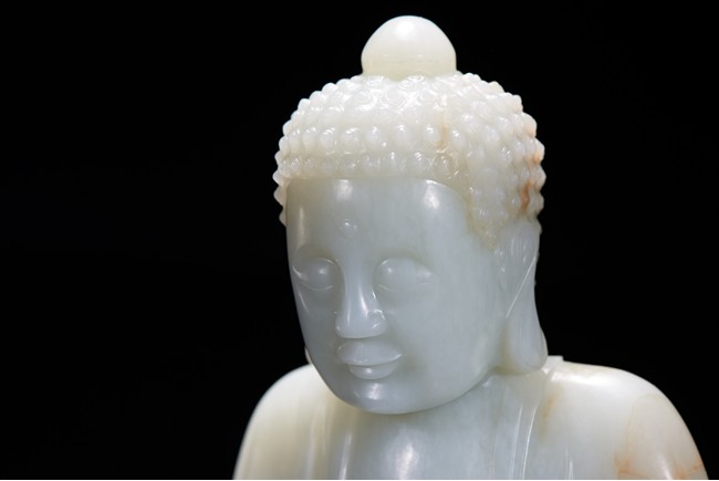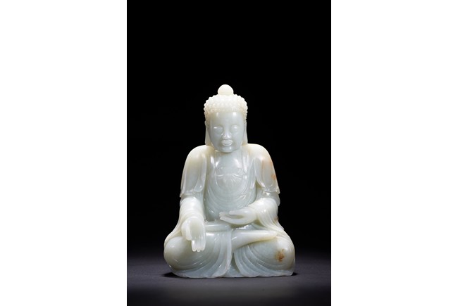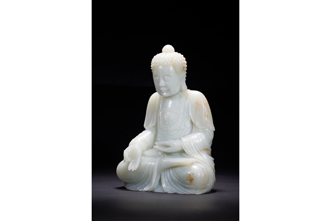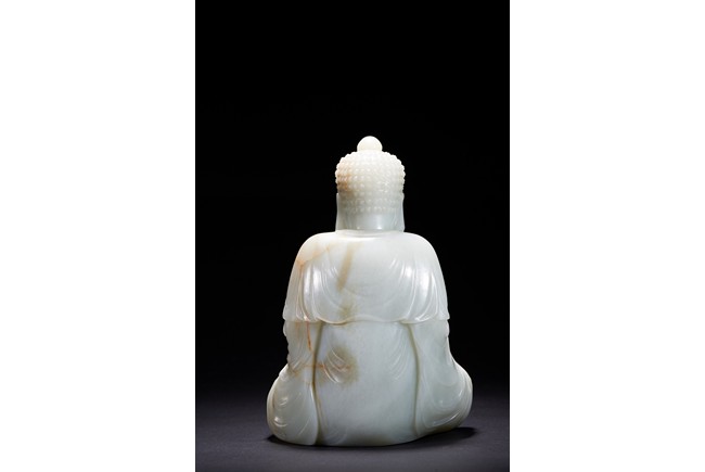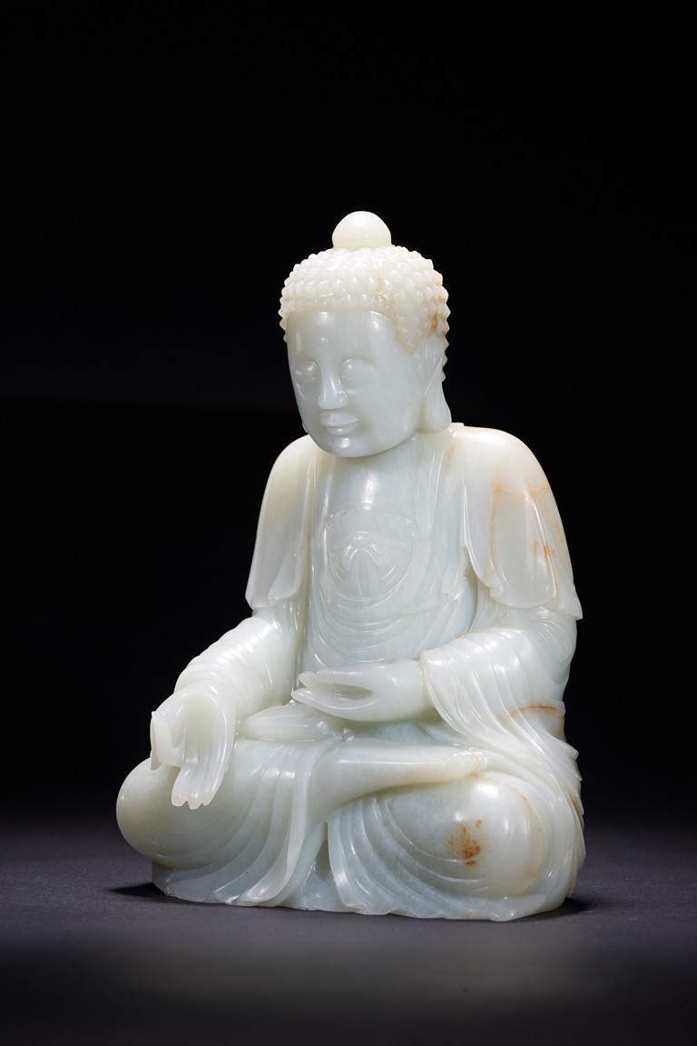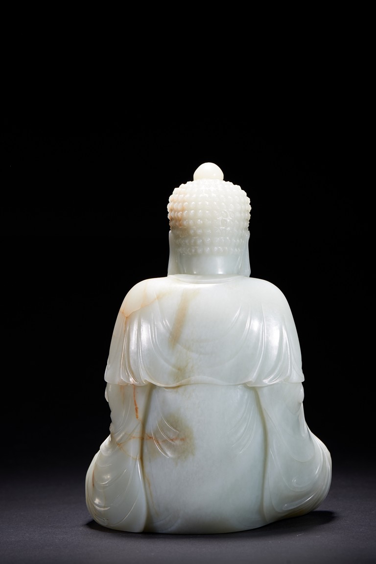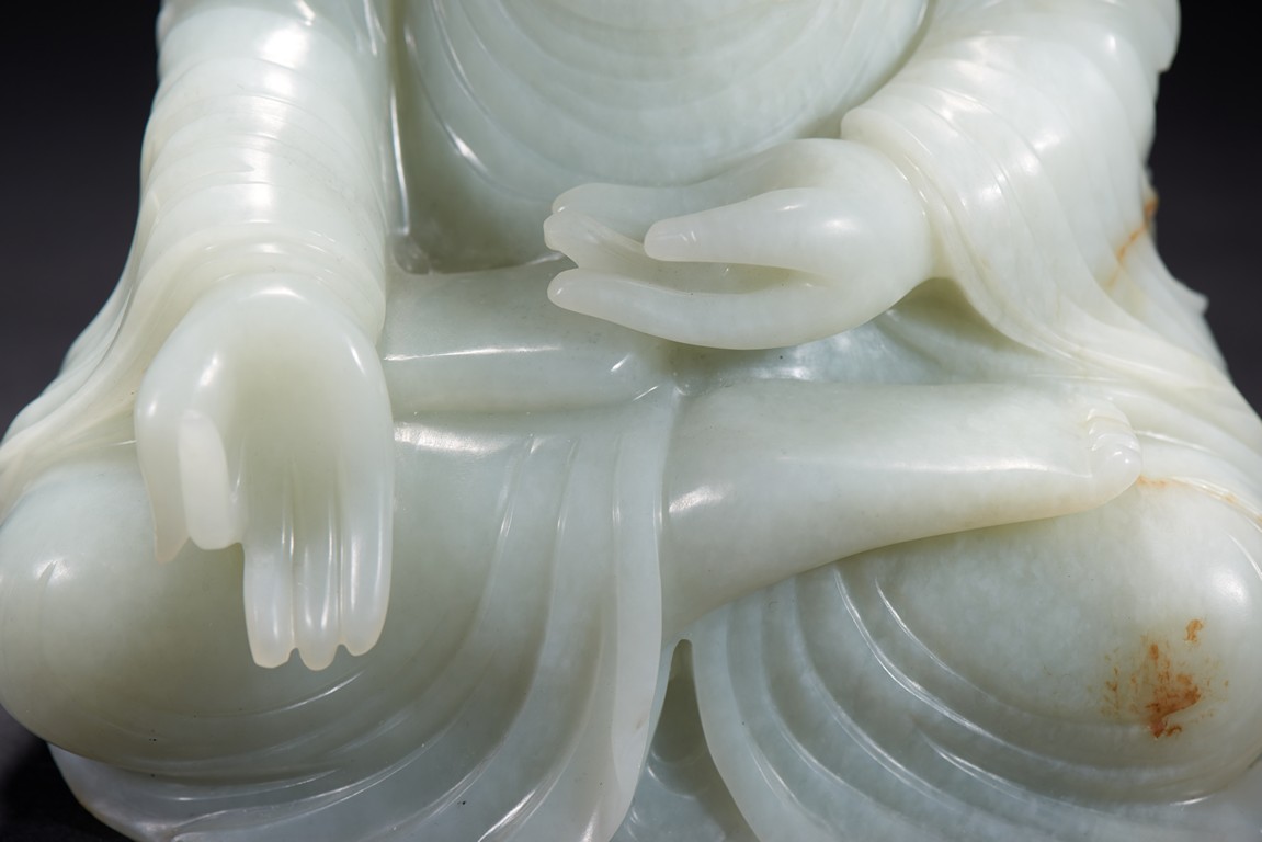 The bodhisattva is shown seated in dhyanasana, with right hand in abhaya mudra and left hand in dhyana mudra, wearing a voluminous robe draping over his shoulders with elegant folds, the serene face with a meditative expression and downcast eyes, flanked by pendulous ears, the hair and ushnisha arranged in tight curls, the stone is of smooth white tone with some russet inclusions. Mid-Qing Dynasty period.