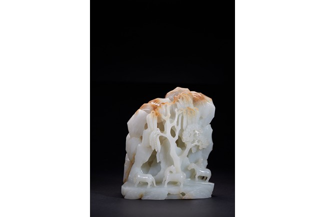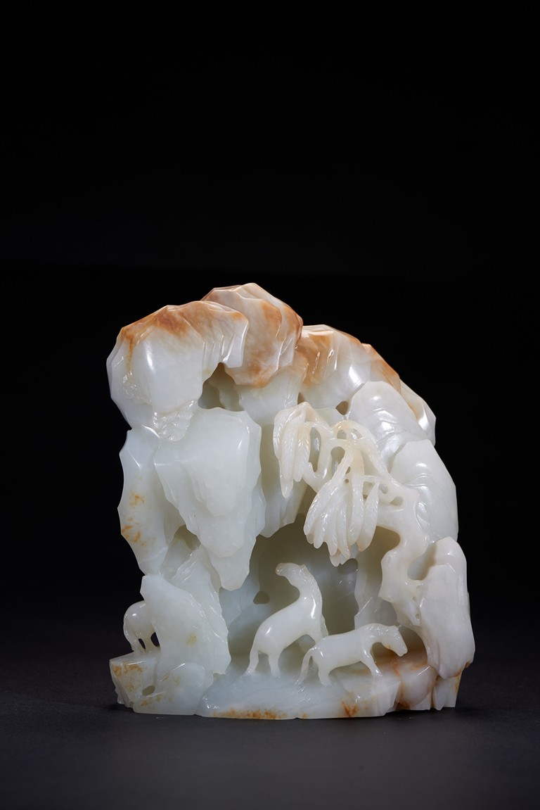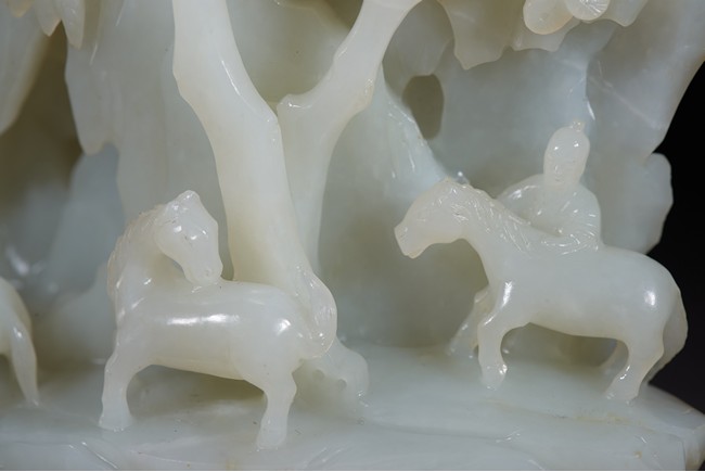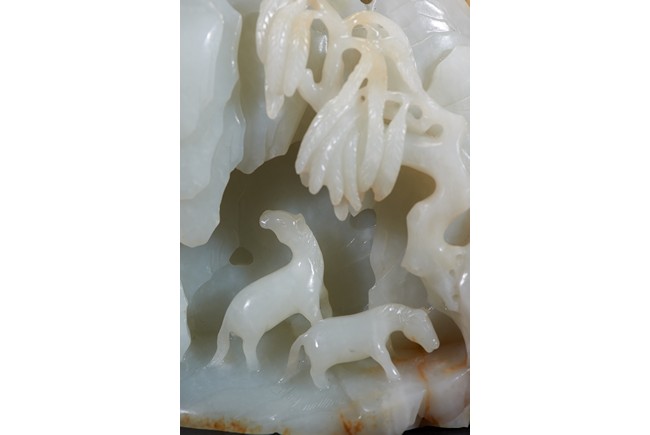 此山子擺件以整塊白玉雕刻而成,質地細膩溫潤。作品依山勢而構,採用浮雕、線刻等工藝隨形而琢,以浴馬圖為表現主題,山石聳立,襯景典雅,意蘊生動,整個畫面極是清雅。禦馬圖是清代宮廷玉雕常見題材,此器雕工精湛,具有典型宮廷風格,寓畫於玉,美輪美奐。